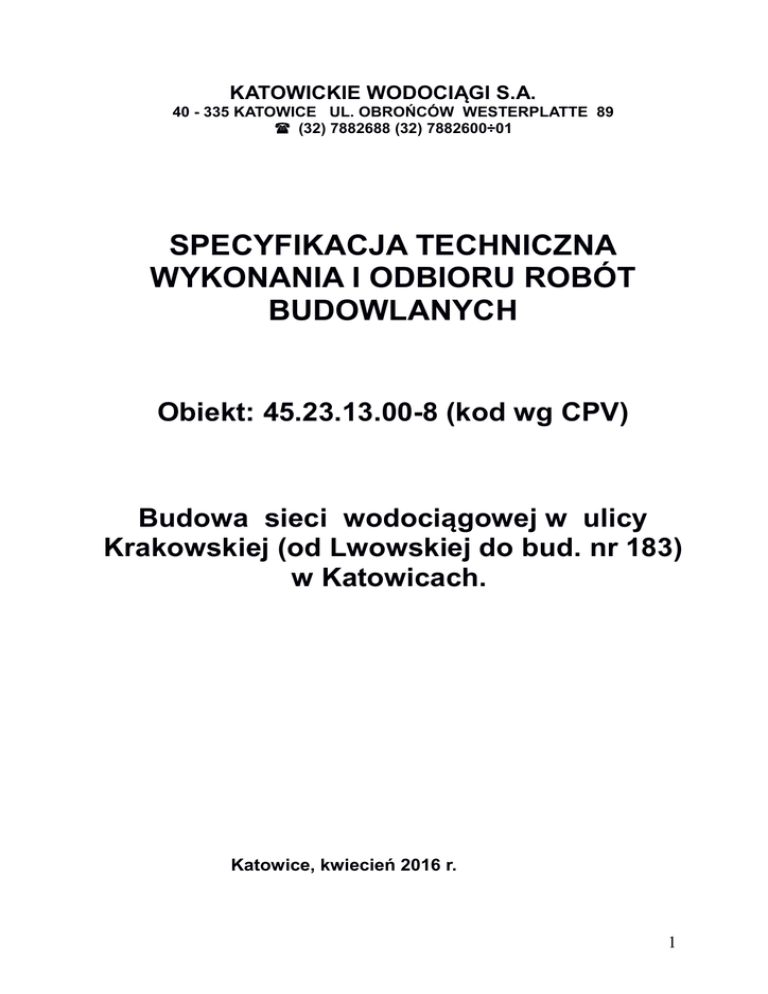 KATOWICKIE WODOCIĄGI S.A. 40 - 335 KATOWICE UL. OBROŃCÓW WESTERPLATTE 89 (32) 7882688 (32) 7882600÷01 SPECYFIKACJA TECHNICZNA WYKONANIA I ODBIORU ROBÓT BUDOWLANYCH Obiekt: 45.23.13.00-8 (kod wg CPV) Budowa sieci wodociągowej w ulicy Krakowskiej (od Lwowskiej do bud. nr 183) w Katowicach. Katowice, kwiecień 2016 r. 1 SPIS TREŚCI: 1. WSTĘP 1.1. Przedmiot specyfikacji technicznej 1.2. Zakres stosowania specyfikacji 1.3. Zakres robót objętych specyfikacją 1.4. Określenia podstawowe (definicje) 1.5. Ogólne wymagania dotyczące robót 1.5.1. Przekazanie i zabezpieczenie terenu budowy 1.5.2. Ochrona środowiska 1.5.3. Bezpieczeństwo i higiena pracy 1.5.4. Warunki organizacji ruchu 1.5.5. Organizacja ruchu wg projektu organizacji ruchu 2. MATERIAŁY 2.1. Warunki dostawy 2.2. Przewody wodociągowe 2.2.1. Sieć wodociągowa zewnętrzna 2.2.2. Przyłącza wodociągowe 2.3. Kształtki ciśnieniowe 2.4. Armatura 2.5. Zabezpieczenie wodociągu 2.6. Składowanie materiałów na placu budowy 2.6.1. Rury 2.6.2. Armatura i kształtki 2.6.3. Piasek 3. SPRZĘT 3.1. Dla robót ziemnych i przygotowawczych 3.2. Dla robót montażowych 4. TRANSPORT 5. WYKONANIE ROBÓT 5.1. Prace wstępne 5.2. Roboty przygotowawcze i pomiarowe, obsługa geodezyjna 5.2.1. Roboty pomiarowe 5.2.2. Przekopy kontrolne 5.3. Roboty drogowe, rozbiórki i odtworzenie nawierzchni 5.3.1. Roboty rozbiórkowe 5.3.2. Odtworzenie nawierzchni 5.3.3. Regulacja pionowa dla urządzeń podziemnych 5.4. Roboty ziemne 5.4.1. Wykopy 5.4.2. Umocnienie ścian wykopów 5.4.3. Odwodnienie dna wykopów 5.4.4. Zasypanie wykopów 5.4.5. Wywiezienie gruzu 5.4.6. Wywiezienie ziemi 5.5. Przejście sieci wodociągowej pod istniejącymi drogami 5.6. Roboty montażowe 5.6.1. Wykonanie podsypki 5.6.2. Głębokość ułożenia przekopu 2 5.6.3. 5.6.4. Wykonanie zasypki Przygotowanie rur do układania 5.6.5. Układanie rur i kształtek z żeliwa sferoidalnego 5.6.6. Łączenie rur i kształtek z żeliwa sferoidalnego 5.6.7. Montaż armatury 5.7. Oznaczenie uzbrojenia sieci 5.8. Bloki oporowe 5.9. Zastosowanie rur ochronnych 5.10. Włączenie do istniejącej sieci i prowadzenie nowej sieci wodoc. 5.10.1. Przewiert sterowany 5.11. Wejście przyłączy wodociągowych do budynków 6. KONTROLA JAKOŚCI ROBÓT 6.1. Badanie zgodności z rysunkami 6.2. Badanie materiałów 6.3. Badanie laboratoryjne nośności podbudowy 6.4. Badanie prawidłowości wykonania podłoża naturalnego 6.5. Badanie w zakresie głębokości ułożenia przewodu 6.6. Badanie w zakresie ułożenia przewodu 6.6.1. Badanie ułożenia przewodu na podłożu 6.6.2. Badanie odchylenia osi przewodu 6.6.3. Badanie odchylenia spadku 6.6.4. Badanie zmiany kierunku przewodu 6.6.5. Badanie zabezpieczenia przewodu przed przemieszczeniem się 6.7. Badanie zasypki przewodu 6.8. Badanie w zakresie szczelności przewodu 6.8.1. Ciśnienie próbne odcinka przewodu 6.8.2. Opis badań 6.8.3. Próba szczelności całego przewodu 6.8.4. Płukanie i dezynfekcja wodociągu 6.9. Dokumentacja budowy 6.9.1. Dziennik budowy 6.9.2. Księga obmiaru 6.9.3. Pozostałe dokumenty 7. PRZEDMIAR ROBÓT Dział 1. Przygotowanie terenu pod budowę – Kod CPV 45100000-8 Rozdział 1. Roboty przygotowawcze Podrozdział 1.1. Roboty pomiarowe, przekopy kontrolne Podrozdział 1.2. Roboty rozbiórkowe Podrozdział 1.3. Roboty ziemne Dział 2. Roboty związane z wykonaniem konstrukcji obiektów – Kod CPV 45200000-9 Rozdział 2. Roboty drogowe Podrozdział 2.1. Odtworzenie nawierzchni Rozdział 3. Sieci zewnętrzne – wodociąg Podrozdział 3.1. Roboty montażowe 8. OBMIAR I ODBIÓR ROBÓT 8.1. Obmiar robót 8.2. Odbiór robót 8.2.1 Odbiór techniczny częściowy 3 8.2.2 Odbiór techniczny końcowy 9. PODSTAWA PŁATNOŚCI 9.1. Zasady rozliczenia i płatności 10. PRZEPISY I DOKUMENTY ZWIĄZANE 10.1 Normy 10.2 Inne dokumenty 10.3. Ustawy i Rozporządzenia 4 1. WSTĘP 1.1. Przedmiot specyfikacji technicznej: Specyfikacja Techniczna jest zbiorem wymagań w zakresie wykonania i odbioru robót budowlanych, które zostaną wykonane w ramach realizacji zadania: „Budowa sieci wodociągowej w ulicy Krakowskiej (od Lwowskiej do bud. nr 183) w Katowicach” 1.2. Zakres stosowania specyfikacji: Specyfikacja jest stosowana jako dokument przetargowy i kontraktowy przy zlecaniu i realizacji robót ujętych w pkt. 1.1. Ustalenia zawarte w niniejszej specyfikacji obejmują wszystkie czynności umożliwiające i mające na celu wykonanie wszystkich robót budowlanych przewidzianych w projekcie budowlanym wymiany sieci wodociągowej. Inwestorem, użytkownikiem i jednostką autorską są: Katowickie Wodociągi SA ul. Obrońców Westerplatte 89 40 – 335 Katowice – Szopienice 1.3. Zakres robót objętych specyfikacją: Roboty, których dotyczy specyfikacja obejmują wszystkie czynności umożliwiające wykonanie robót wymienionych w pkt.1.1. w zakresie zgodnym z dokumentacją projektową uwzględniającą: • projekt zagospodarowania terenu • schemat montażowy sieci wodociągowej • schemat wyłączeń sieci wodociągowej W zakres tych robót wchodzą: • roboty przygotowawcze • roboty drogowe • roboty ziemne • roboty montażowe • próba szczelności, płukanie i dezynfekcja wodociągu • kontrola jakości Specyfikacja techniczna uwzględnia aktualne normy państwowe, instrukcje i przepisy stosujące się do wymienionych robót. 1.4. Określenia podstawowe (definicje): Przewód wodociągowy – rurociąg wraz z urządzeniami przeznaczony do dostarczania wody odbiorcom. Sieć wodociągowa zewnętrzna (ciąg główny) – układ przewodów wodociągowych znajdujących się poza budynkami odbiorców, zaopatrujący w wodę ludność i obiekty użyteczności publicznej. Przyłącze wodociągowe – przewód wodociągowy zakończony zestawem wodomierzowym łączący sieć wodociągową z wewnętrzną instalacją 5 obiektu zasilanego w wodę. Średnica nominalna – jest to wewnętrzna średnica rurociągu lub oznaczenie przelotu armatur