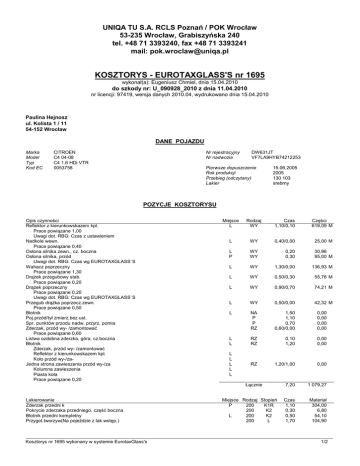 UNIQA TU S.A. RCLS Poznań / POK Wrocław 53-235 Wrocław, Grabiszyńska 240 tel. +48 71 3393240, fax +48 71 3393241 mail: [email protected] KOSZTORYS - EUROTAXGLASS'S nr 1695 wykonał(a): Eugeniusz Chmiel, dnia 15.04.2010 do szkody nr: U_090928_2010 z dnia 11.04.2010 nr licencji: 97419, wersja danych 2010.04, wydrukowano dnia 15.04.2010 Paulina Hejnosz ul. Kolista 1 / 11 54-152 Wrocław DANE POJAZDU Marka Model Typ Kod EC CITROEN C4 04-08 C4 1.6 HDi VTR 0053758 Nr rejestracyjny Nr nadwozia DW631JT VF7LA9HYB74212253 Pierwsze dopuszczenie Rok produkcji Przebieg (odczytany) Lakier 15.06.2005 2005 130 103 srebrny POZYCJE KOSZTORYSU Opis czynności Reflektor z kierunkowskazem kpl. Prace powiązane 1,00 Uwagi dot. RBG: Czas z ustawieniem Nadkole wewn. Prace powiązane 0,40 Osłona silnika zewn., cz. boczna Osłona silnika, przód Uwagi dot. RBG: Czas wg EUROTAXGLASS`S Wahacz poprzeczny Prace powiązane 1,30 Drążek przegubowy stab. Prace powiązane 0,20 Drążek poprzeczny Prace powiązane 0,20 Uwagi dot. RBG: Czas wg EUROTAXGLASS`S Przegub drążka poprzecz.zewn. Prace powiązane 0,50 Błotnik Poj.przód/tył zmierz.bez ust. Spr. punktów przodu nadw. przyrz. pomia Zderzak, przód wy- /zamontować Prace powiązane 0,60 Listwa ozdobna zderzka, góra, cz.boczna Błotnik Zderzak, przód wy- /zamontować Reflektor z kierunkowskazem kpl. Koło przód wy-/zaJedna strona zawieszenia przód wy-/za Kolumna zawieszenia Piasta koła Prace powiązane 0,20 Miejsce L Rodzaj WY Czas 1,10/0,10 Części 619,09 M L WY 0,40/0,00 25,00 M L P WY WY 0,20 0,30 30,96 95,00 M L WY 1,30/0,00 136,93 M L WY 0,50/0,30 55,76 M L WY 0,90/0,70 74,21 M L WY 0,50/0,00 42,32 M L NA P P RZ 1,50 1,10 0,70 0,60/0,00 0,00 0,00 0,00 0,00 L L RZ RZ 0,10 1,20 0,00 0,00 L L L L L RZ 1,20/1,00 0,00 7,20 1 079,27 Czas 1,10 0,30 0,50 1,70 Materiał 304,00 6,80 54,10 104,90 Łącznie Lakierowanie Zderzak przedni k Pokrycie zderzaka przedniego, część boczna Błotnik przedni kompletny Przygot.tworzyw(Na pojeździe z lak.wstęp.) Kosztorys nr 1695 wykonany w systemie EurotaxGlass's Miejsce Rodzaj Stopień P 200 K1R 200 K2 L 200 K2 200 L 1/2 Łącznie Podsumowanie Części zamienne Materiał lakierniczy [100,00 %] Blacharz Mechanik Lakiernik Prace dodatkowe Mat.drobne i dodatkowe [2%] Rbg. Stawka 3,40 1,00 3,60 2,80 90,00 90,00 90,00 90,00 3,60 469,80 Kwota 1 079,27 469,80 306,00 90,00 324,00 252,00 21,59 2 542,66 345,55 213,84 3 102,05 Koszt naprawy łącznie (netto) VAT (Materiał) 22,0% VAT (Robocizna) 22,0% Koszt naprawy łącznie (brutto) Koszt naprawy słownie: trzy tysiące sto dwa zł, groszy 5/100 W kosztorysie zastosowano urealnienie na części zamienne CITROEN w wysokości 25,0% Zestawienie części wykorzystanych w rozliczeniu kosztorysowym Ident/ETNR. Opis części 232909-V Q Reflektor z kierunkowskazem kpl. 3213710151 Z Nadkole wewn. 7013W2 O Osłona silnika zewn., cz. boczna 3213706185 PJ Osłona silnika, przód 571037-K PJ Wahacz poprzeczny 85-0282 Z Drążek przegubowy stab. FE19935 P Drążek poprzeczny FE10660 P Przegub drążka poprzecz.zewn. Dostawca POLCAR AUTO-ELEMENTS CITROEN AUTO-ELEMENTS POLCAR FOTA INTER CARS INTER CARS Ceny części zamiennych użyte w kalkulacji pochodzą od producentów i importerów pojazdów oraz od dostawców współpracujących z firmami ubezpieczeniowymi. W obrocie handlowym na rynku polskim dostępne są również części pochodzące od innych dostawców. EurotaxGlass's nie gwarantuje prawidłowego zamówienia części w oparciu o zamieszczone w programie numery identyfikacyjne. Rozporządzenie Rady Ministrów z dnia 28 stycznia 2003r. w sprawie wyłączenia określonych porozumień wertykalnych w sektorze pojazdów samochodowych spod zakazu porozumień ograniczających konkurencję. Rodzaj materiału lakierniczego 200 2-warstwowy Notatka ............................................................ Podpis klienta Kosztorys nr 1695 wykonany w systemie EurotaxGlass's ............................................................ Podpis wykonującego kosztorys 2/2