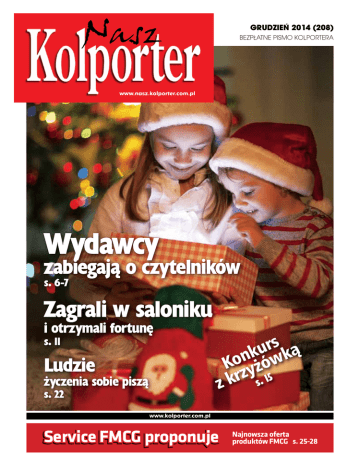 GRUDZIEŃ 2014 (208) BEZPŁATNE PISMO KOLPORTERA www.nasz.kolporter.com.pl Wydawcy zabiegają o czytelników s. 6-7 Zagrali w saloniku i otrzymali fortunę s. 11 Ludzie z życzenia sobie piszą s. 22 s r u ą k k n Ko yżów krz s. 15 www.kolporter.com.pl Service FMCG proponuje Najnowsza oferta produktów FMCG s. 25-28 Zdrowych i spokojnych Świ¹t Bo¿ego Narodzenia oraz wszelkiej pomyślności w Nowym Roku SPIS TREŚCI GRUDZIEŃ 2014 (208) Fleszem po rynku FMCG Fleszem po rynku prasowym Zagrali i otrzymali fortunę s. 4 s. 5 s. 11 Praktyczne prezenty na święta s. 14 Akcyza na papierosy bez zmian s. 19 Ludzie życzenia sobie piszą s. 22 Zastrzeganie kart w jednym miejscu s. 24 Miesięcznie w salonikach Kolportera zawieranych jest ok. 4 milionów różnych zakładów Lotto www.nasz.kolporter.com.pl Propozycje od firmy Verus zabiegają o czytelników s. 6-7 Zagrali w saloniku i otrzymali fortunę s. 11 Ludzie z życzenia sobie piszą s. 22 s kur ką Konyżów krz s. 15 www.kolporter.com.pl Service FMCG proponuje Najnowsza oferta produktów FMCG s. 25-28 WYDAWCA BC&O Polska REDAKTOR NACZELNY Grzegorz Kozera REDAGUJĄ Dariusz Materek Kinga Beck-Tracz Joanna Szczepanik REKLAMA Bożena Migała tel. 515 220 002 OPRACOWANIE KOMPUTEROWE BC&O Polska Zakład Marketingu Kielce, ul. Zagnańska 61 tel. 41 367 80 34 SKŁAD Rafał Sabat Fot. Istockphoto.com Wydawcy Banderole na opakowaniach trzeba będzie jednak wymienić Duży wybór kartek okolicznościowych i pocztówek w salonikach Kolportera Warto zapamiętać ten numer: 828 828 828 Nowe Top-Pressy i saloniki prasowe Kolportera s. 33 Nagrody od POL-MOT Auto s. 33 Wyniki konkursu motoryzacyjnego RAPORT NASZEGO KOLPORTERA Wydawcy zabiegają o czytelników Nowe tytuły prasowe i dodatki lokalne, odświeżanie szaty graficznej Ludzie Dostosować się do potrzeb klienta s. 12-13 Troska o klienta to podstawa s. 18-19 KONKURS Rozwiąż krzyżówkę s. 15 „Partner Roku” – laureaci wrześniowej edycji konkursu Kolportera Najlepsi sprzedawcy prasy z województwa śląskiego Atrakcyjne nagrody dla Czytelników „Naszego Kolportera” Bestsellery do czytania lub pod choinkę s. 17 Chałwa prosto z Grecji s. 24 Skuteczne promowanie produktów s. 29 Od grudnia w punktach Kolportera półki TOP 12 z najlepiej sprzedającymi się w Polsce książkami Nowe produkty w ofercie saloników prasowych i salonów Top-Press Akcje samplingowe w salonikach prasowych Kolportera i salonach Top-Press ADRES REDAKCJI „Nasz Kolporter” 25-528 Kielce ul. Zagnańska 61 tel. 41 367 80 31 Prezentacja Oddziału Koszalińskiego Departamentu Dystrybucji Prasy Kolportera RADA PROGRAMOWA Mateusz Wiśniewski Grzegorz Fibakiewicz Jarosław Ambroziak Grzegorz Maciągowski NAKŁAD 21 200 egzemplarzy Redakcja nie bierze odpowiedzialności za treść reklam i nie zwraca nie zamówionych materiałów. RYNEK PRASOWY Trasa wałecka kończy się... w Szwecji Wydawcy zabiegają o czytelników Wydawcy nie dopuszczają, by na rynku prasowym zapanował zastój. Każdego miesiąca debiutują w Polsce nowe, wysokonakładowe czasopisma, adresowane do szerokiego grona odbiorców. Sporo tytułów co pewien czas zmienia też szatę graficzną i układ redakcyjny tekstów – wszystko po to, by czytelnik nie poczuł się znudzony. s. 11 Zagrali i otrzymali fortunę HANDEL DRUK Drukarnia ART 01-339 Warszawa ul. Fortuny 5 www.nasz.kolporter.com.pl s. 6-7 s. 6-7 Niektóre z punktów sieci handlowej Kolportera okazują się bardzo szczęśliwe dla graczy, wygrywają bowiem oni kwoty, od których można dostać zawrotu głowy. Najnowszy przykład to salonik w podlubelskiej Turce – 2 listopada br. padła tutaj główna wygrana w Ekstra Pensji. s. 20-21 Superoferta – skorzystaj! Service FMCG proponuje s. 25-28 KULINARIA Przepisy na świąteczne potrawy Szefowa kuchni ośrodka BC&O w Smardzewicach proponuje s. 30 PRAWo I HANDEL Bezpieczeństwo jest najważniejsze Zasady ewakuacji z obiektów handlowych s. 35 Psycholog radzi Idą święta Zarówno dawanie, jak i otrzymywanie prezentów jest przyjemne s. 36-37 Dziennik Gazeta Prawna radzi Jak uniknąć pomyłki Najczęstsze problemy podatników z fakturami s. 38-39 rozrywka Krzyżówka Technopolu Humor z okolic lady s. 42-43 s. 44 Kolporter w prasie i internecie Nowości w ofercie Kolportera s. 40 s. 46-48 s. 22 Ludzie życzenia sobie piszą Wydawać by się mogło, że za sprawą telefonów komórkowych, SMS-ów, emaili czy komunikatorów internetowych tradycyjne kartki okolicznościowe i widokówki – tak jak telegramy – odeszły do lamusa. Nic bardziej mylnego. Wciąż są ludzie, którzy korzystają właśnie z tej formy przesyłania sobie życzeń i pozdrowień. fot. rafał sabat GRUDZIEŃ 2014 (208) BEZPŁATNE PISMO KOLPORTERA fot. materaiały prasowe Aktualności FLESZEM PO RYNKU FMCG Syrop Trzcinowy Złocisty Esencje do sosów Marka Diamant proponuje Syrop Trzcinowy Złocisty powstały na bazie cukrów trzcinowych. Produkt można stosować jako polewa do naleśników i gofrów, dodatek do lodów i deserów, a także baza do sosów, marynat i dipów. Syrop Trzcinowy sprawia, że dania mają głębszy i wyrazistszy smak, a brak konserwantów i sztucznych barwników sprawiają, że bezpiecznie może go jeść cała rodzina, także dzieci. Marka Knorr wprowadza na rynek Esencje do sosów, czyli produkt, który w łatwy sposób pozwoli konsumentom przygotować najpopularniejsze rodzaje sosów: pieczeniowy jasny, pieczeniowy ciemny, pieczarkowy, do potrawki z kurczaka oraz cebulowy. Produkt jest odpowiedzią szefów kuchni Knorr na najczęstsze problemy konsumentów podczas przygotowania sosów - mdły smak, rzadką konsystencję, pojawiające się grudki czy nieapetyczny kolor. Esencje do sosów zapewniają bowiem głęboki, wyjątkowy smak, pożądaną gęstość i gładkość. Esencje zostały przygotowane na bazie bulionów w połączeniu z najlepszymi suszonymi ziołami i przyprawami. YogoCrunch od Mokate Mokate YogoCrunch to puszysty i pyszn