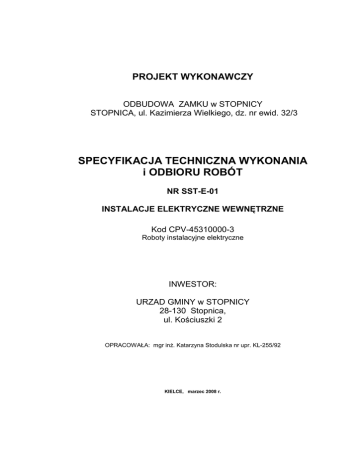 PROJEKT WYKONAWCZY ODBUDOWA ZAMKU w STOPNICY STOPNICA, ul. Kazimierza Wielkiego, dz. nr ewid. 32/3 SPECYFIKACJA TECHNICZNA WYKONANIA i ODBIORU ROBÓT NR SST-E-01 INSTALACJE ELEKTRYCZNE WEWNĘTRZNE Kod CPV-45310000-3 Roboty instalacyjne elektryczne INWESTOR: URZAD GMINY w STOPNICY 28-130 Stopnica, ul. Kościuszki 2 OPRACOWAŁA: mgr inŜ. Katarzyna Stodulska nr upr. KL-255/92 KIELCE, marzec 2008 r. Specyfikacja techniczna wykonania i odbioru robót budowlanych. ODBUDOWA ZAMKU w STOPNICY przy ul. Kazimierza Wielkiego, dz. nr ewid. 32/3 INSTALACJE ELEKTRYCZNE WEWNĘTRZNE strona 2/19 SPIS TREŚCI 1. 1.1. 1.2. 1.3. 1.4. 1.5. WSTĘP Przedmiot ST Zakres stosowania ST Zakres robót objętych ST Określenia podstawowe Ogólne wymagania dotyczące robót str. str. str. str. str. 3 3 3 3 4 2. 2.1. 2.2. 2.3. 2.4. 2.5. 2.6. 2.7. 2.8. 2.9. 2.10. MATERIAŁY Ogólne wymagania dotyczące materiałów, ich pozyskania i składowania Rozdzielnica główna, tablice piętrowe i technologiczne Wewnętrzne linie zasilające Zasilanie odbiorników technologicznych, kotłowni, wentylacji Oprawy oświetleniowe Instalacja oświetlenia i gniazd wtykowych 230V - przewody i osprzęt Instalacja odgromowa, uziemiająca i połączeń wyrównawczych Źródła uzyskania materiałów Materiały nie odpowiadające wymaganiom Przechowywanie i składowanie materiałów str. str. str. str. str. str. str. str. str. str. str. 4 4 4 4 4 5 5 5 6 6 6 3. SPRZĘT str. 6 4. TRANSPORT str. 6 5. 5.1. 5.2. 5.3. 5.4. 5.5. 5.6. 5.7. 5.8. 5.9. 5.10. 5.11 5.12. 5.13. 5.14. WYKONANIE ROBÓT Ogólne zasady wykonywania robót Wstęp - zakres robót Zakres działania i odpowiedzialności Wykonawcy Koordynacja i aprobaty Planowanie / harmonogram Nabywanie i przechowywanie materiałów i sprzętu Dokumentacja powykonawcza w trakcie budowy Instrukcje obsługi i eksploatacji MontaŜ przewodów i okablowanie MontaŜ sprzętu i osprzętu Podejścia do odbiorników MontaŜ rozdzielnic Uziemienie i ochrona odgromowa Próby montaŜowe str. str. str. str. str. str. str. str. str. str. str. str. str. str. 7 7 8 8 9 9 9 10 10 11 11 11 11 13 6. 6.1. 6.2. 6.3. 6.4. KONTROLA JAKOŚCI ROBÓT Wymagania ogólne Badania i pomiary Rozdzielnice Instalacja odgromowa i uziemiająca str. str. str. str. 13 14 14 15 7. OBMIAR ROBÓT 7.1. Ogólne zasady obmiaru robót 7.2. Jednostka obmiarowa str. str. 16 16 8. 8.1. 8.2. 8.3. ODBIÓR ROBÓT Odbiory międzyoperacyjne Odbiór częściowy Odbiór końcowy str. str. str. 16 16 16 9. PODSTAWA PŁATNOŚCI str. 17 str. str. 17 19 10. OBOWIĄZUJĄCE PRZEPISY I NORMY 10.1. Normy 10.2. Inne dokumenty Specyfikacja techniczna wykonania i odbioru robót budowlanych. ODBUDOWA ZAMKU w STOPNICY przy ul. Kazimierza Wielkiego, dz. nr ewid. 32/3 INSTALACJE ELEKTRYCZNE WEWNĘTRZNE strona 3/19 SST-E-01 INSTALACJE ELEKTRYCZNE WEWNĘTRZNE. Kody CPV: 45310000-3 Roboty instalacyjne elektryczne, 45315700-5 Instalowanie stacji rozdzielczych, 45311100-1 Roboty w zakresie okablowania elektrycznego, 45311200-2 Roboty w zakresie instalacji elektrycznych, 45312310-3 Ochrona odgromowa, 1. WSTĘP 1.1 Przedmiot Specyfikacji Technicznej Przedmiotem niniejszej specyfikacji technicznej są wymagania dotyczące wykonania instalacji elektrycznych wewnętrznych w ramach budowy: Odbudowa Zamku w STOPNICY przy ul. Kazimierza Wielkiego, dz. nr ewid. 32/3. 1.2 Zakres stosowania Specyfikacji Technicznej Szczegółowa specyfikacja techniczna stanowi dokument przetargowy i kontraktowy przy zlecaniu i realizacji robót wymienionych w pkt 1.1 1.3 Zakres robót objętych Specyfikacją Techniczną Ustalenia zawarte w niniejszej specyfikacji obejmują wymagania dotyczące realizacji robót: montaŜ rozdzielnicy głównej RG montaŜ tablic /rozdzielnic/ piętrowych i technologicznych wewnętrzne linie zasilające instalacja oświetleniowa – oświetlenie podstawowe instalacja oświetleniowa – oświetlenie awaryjne instalacja gniazd wtykowych 230 V instalacja gniazd wtykowych 230V do odbiorników komputerowych instalacja siłowa odbiorników technologicznych instalacja siłowa kotłowni instalacja siłowa wentylacji instalacja odgromowa instalacja uziemień i ochrony przeciwporaŜeniowej połączenia wyrównawcze ochrona przeciwprzepięciowa Ustalenia zawarte niniejszej ST dotyczą zasad prowadzenia robót związanych z: • materiałami stosowanymi do budowy instalacji elektrycznych wewnętrznych • technologią wykonania robót instalacji elektrycznych wewnętrznych • próbami technicznych i odbioru instalacji 1.4. Określenia podstawowe Określenia podane w niniejszej ST są zgodne z obowiązującymi normami polskimi i pkt. 1.4. ST "Wymagania ogólne". Przedmiar robót – opracowanie obejmujące zestawienie planowanych robót w kolejności technologicznej ich wykonania wraz z obliczeniem i podaniem ilości ustalonych jednostek przedmiarowych. Ma zastosowanie tylko przy wynagrodzeniu wyliczonym kosztorysem. Aprobata techniczna – pozytywna ocena techniczna wyrobu, stwierdzająca jego przydatność do stosowania w budownictwie. Dziennik budowy – dziennik wydany przez właściwy organ zgodnie z obowiązującymi przepisami, stanowiący urzędowy dokument przebiegu robót budowlanych oraz zdarzeń i okoliczności zachodzących w czasie wykonywania robót. Kierownik budowy - osoba wyznaczona przez Wykonawcę robót, upowaŜniona do kierowania robotami i do występowania w jego imieniu w sprawach realizacji kontraktu, ponosząca ustawową odpowiedzialność za prowadzoną budowę. Budowa – wykonanie obiektu budowlanego w określonym miejscu, a takŜe odbudowę, rozbudowę, nadbudowę obiektu budowlanego. Inspektor Nadzoru /InŜynier/ - kompetentny, niezaleŜny organ nadzorczy, którego zadaniem jest weryfikacja prawidłowości wykonywanych robót budowlanych i zgodności ich ze specyfikacjami technicznymi oraz Dokumentacją Projektową. Projektant - uprawniona osoba prawna lub fizyczna będąca autorem dokumentacji projektowej. Specyfikacja techniczna wykonania i odbior