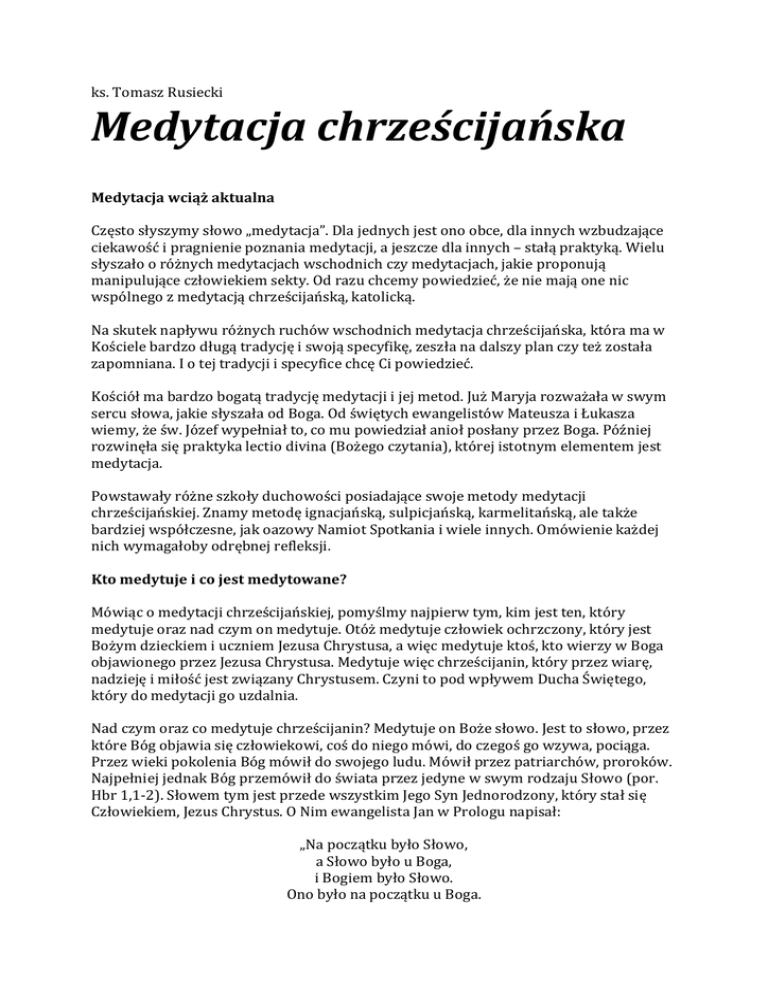 ks. Tomasz Rusiecki Medytacja chrześcijańska Medytacja wciąż aktualna Często słyszymy słowo „medytacja”. Dla jednych jest ono obce, dla innych wzbudzające ciekawość i pragnienie poznania medytacji, a jeszcze dla innych – stałą praktyką. Wielu słyszało o różnych medytacjach wschodnich czy medytacjach, jakie proponują manipulujące człowiekiem sekty. Od razu chcemy powiedzieć, że nie mają one nic wspólnego z medytacją chrześcijańską, katolicką. Na skutek napływu różnych ruchów wschodnich medytacja chrześcijańska, która ma w Kościele bardzo długą tradycję i swoją specyfikę, zeszła na dalszy plan czy też została zapomniana. I o tej tradycji i specyfice chcę Ci powiedzieć. Kościół ma bardzo bogatą tradycję medytacji i jej metod. Już Maryja rozważała w swym sercu słowa, jakie słyszała od Boga. Od świętych ewangelistów Mateusza i Łukasza wiemy, że św. Józef wypełniał to, co mu powiedział anioł posłany przez Boga. Później rozwinęła się praktyka lectio divina (Bożego czytania), której istotnym elementem jest medytacja. Powstawały różne szkoły duchowości posiadające swoje metody medytacji chrześcijańskiej. Znamy metodę ignacjańską, sulpicjańską, karmelitańską, ale także bardziej współczesne, jak oazowy Namiot Spotkania i wiele innych. Omówienie każdej nich wymagałoby odrębnej refleksji. Kto medytuje i co jest medytowane? Mówiąc o medytacji chrześcijańskiej, pomyślmy najpierw tym, kim jest ten, który medytuje oraz nad czym on medytuje. Otóż medytuje człowiek ochrzczony, który jest Bożym dzieckiem i uczniem Jezusa Chrystusa, a więc medytuje ktoś, kto wierzy w Boga objawionego przez Jezusa Chrystusa. Medytuje więc chrześcijanin, który przez wiarę, nadzieję i miłość jest związany Chrystusem. Czyni to pod wpływem Ducha Świętego, który do medytacji go uzdalnia. Nad czym oraz co medytuje chrześcijanin? Medytuje on Boże słowo. Jest to słowo, przez które Bóg objawia się człowiekowi, coś do niego mówi, do czegoś go wzywa, pociąga. Przez wieki pokolenia Bóg mówił do swojego ludu. Mówił przez patriarchów, proroków. Najpełniej jednak Bóg przemówił do świata przez jedyne w swym rodzaju Słowo (por. Hbr 1,1-2). Słowem tym jest przede wszystkim Jego Syn Jednorodzony, który stał się Człowiekiem, Jezus Chrystus. O Nim ewangelista Jan w Prologu napisał: „Na początku było Słowo, a Słowo było u Boga, i Bogiem było Słowo. Ono było na początku u Boga. […] W Nim było życie, a życie było światłością ludzi, a światłość w ciemności świeci i ciemność jej nie ogarnęła. […] Na świecie było [Słowo], a świat stał się przez Nie, lecz świat Go nie poznał. Przyszło do swojej własności, a swoi Go nie przyjęli. Wszystkim tym jednak, którzy Je przyjęli, dało moc, aby się stali dziećmi Bożymi, tym, którzy wierzą w imię Jego – którzy ani z krwi, ani z żądzy ciała, ani z woli męża, ale z Boga się narodzili. A Słowo stało się ciałem i zamieszkało wśród nas”. (J 1,1-14) Jezus Chrystus, Słowo Ojca, kierował do ludzi słowa Dobrej Nowiny, które słyszał od Niego, aby je przyjmowali, rozważali w sercu i w ten sposób coraz głębiej wierzyli Chrystusowi i osiągnęli zbawienie. Otwieramy więc Pismo Święte Starego i Nowego Testamentu, aby medytować słowo Boże. Spisane ludzkim językiem staje się dostępne dla każdego człowieka, a dla wierzącego staje się pokarmem wiary i mądrością. Chrześcijanin medytuje Boże słowo. Żeby mógł to czynić, musi naprzód słuchać. To słuchanie dokonuje się podczas czytania tekstów biblijnych. Nie chodzi tylko o czytanie, lecz o słuchanie Boga, który mówi. Boże, o czym mówisz w tej perykopie, którą medytuję? Zanim jednak chrześcijanin zacznie słuchać, musi stanąć przed Bogiem z całą otwartością serca, umysłu i woli. Tę otwartość sprawia w nas Duch Święty, pod którego natchnieniem słowo Boże zostało spisane ludzkim językiem. On daje zrozumienie tego, co mówi Bóg. Trzeba Go więc przyzywać, gdy rozpoczynamy medytację. On nas w niej poprowadzi. Słuchanie Słowa Bożego jest możliwe w ciszy. Bóg nie chce przekrzykiwać człowieka. Wyciszamy się, gdy stajemy nie wobec pustki, bo ona niepokoi, lecz wobec kogoś, o kim wiemy, że nas kocha. Staję więc przed obliczem kochającego Boga z pragnieniem słuchania tego, co On chce mi powiedzieć, a ja chcę Go słuchać. Mogę Mu za Samuelem powiedzieć: „Mów, Panie, bo sługa Twój słucha” (1 Sm 3,7-10). Z tego pragnienia rodzi się cisza, pozwalająca usłyszeć Boże słowo. Taką postawę widzimy u Abrahama, Mojżesza, Matki Najświętszej, a przede wszystkim u Jezusa, który słucha Ojca. Słuchanie medytacyjne nie zmierza do zdobycia wiadomości i zwiększenia ich zasobów w umyśle. Nie jest to słuchanie dla słuchania, lecz jest to słuchanie, które wywiera wpływ na nasze życie, czyli jest to słuchanie posłuszne. Medytacja chrześcijańska zmierza bowiem do przemiany życia, do coraz ściślejszego zjednoczenia z Bogiem, tak aby On kierował moim życiem. Drugim bardzo ważnym elementem medytacji chrześcijańskiej jest to, co Bóg chce mi powiedzieć. Więc pytam Boga: Boże, co mi chcesz powiedzieć w słowie, które do mnie kierujesz? Jak więc Bóg mówi? Mówi przez dobre natchnienia, myśli. Dotyka nas swoim słowem bardzo konkretnie. Są słowa, które nas poruszają i są takie, które przechodzą obok naszych uszu niezauważone. Jedne dotykają w nas takich sfer, etapów naszego życia, że mogą wywołać radość, a inne mogą wywołać smutek, ból czy nawet bunt. Trzeba się im wszystkim przyjrzeć. Także tym, które wydają nam się jakby nie do nas się odnosiły i dlatego przechodzą mimo. Każdy z nas ma swoją historię życia. Można powiedzieć, że jest to historia naszych odniesień do Boga, naszej z Nim współpracy czy różnych oporów, n