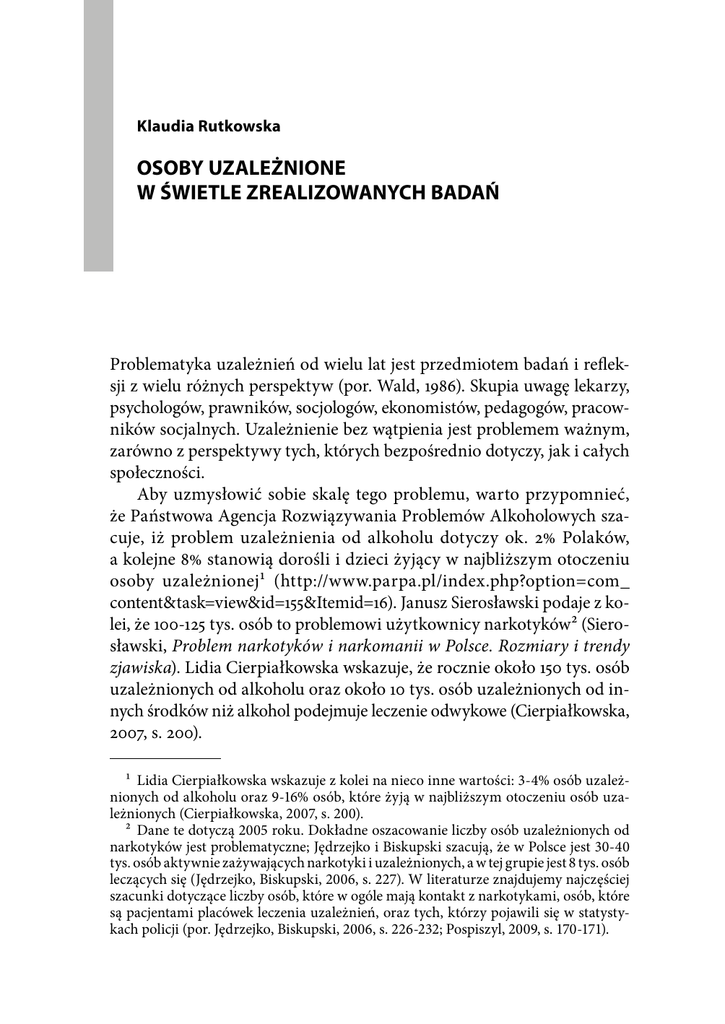 Klaudia Rutkowska Osoby uzależnione w świetle zrealizowanych badań Problematyka uzależnień od wielu lat jest przedmiotem badań i reflek‑ sji z wielu różnych perspektyw (por. Wald, 1986). Skupia uwagę lekarzy, psychologów, prawników, socjologów, ekonomistów, pedagogów, pracow‑ ników socjalnych. Uzależnienie bez wątpienia jest problemem ważnym, zarówno z perspektywy tych, których bezpośrednio dotyczy, jak i całych społeczności. Aby uzmysłowić sobie skalę tego problemu, warto przypomnieć, że Państwowa Agencja Rozwiązywania Problemów Alkoholowych sza‑ cuje, iż problem uzależnienia od alkoholu dotyczy ok. 2% Polaków, a kolejne 8% stanowią dorośli i dzieci żyjący w najbliższym otoczeniu osoby uzależnionej1 (http://www.parpa.pl/index.php?option=com_ content&task=view&id=155&Itemid=16). Janusz Sierosławski podaje z ko‑ lei, że 100‑125 tys. osób to problemowi użytkownicy narkotyków2 (Siero sławski, Problem narkotyków i narkomanii w Polsce. Rozmiary i trendy zjawiska). Lidia Cierpiałkowska wskazuje, że rocznie około 150 tys. osób uzależnionych od alkoholu oraz około 10 tys. osób uzależnionych od in‑ nych środków niż alkohol podejmuje leczenie odwykowe (Cierpiałkowska, 2007, s. 200). 1 Lidia Cierpiałkowska wskazuje z kolei na nieco inne wartości: 3‑4% osób uzależ‑ nionych od alkoholu oraz 9‑16% osób, które żyją w najbliższym otoczeniu osób uza‑ leżnionych (Cierpiałkowska, 2007, s. 200). 2 Dane te dotyczą 2005 roku. Dokładne oszacowanie liczby osób uzależnionych od narkotyków jest problematyczne; Jędrzejko i Biskupski szacują, że w Polsce jest 30‑40 tys. osób aktywnie zażywających narkotyki i uzależnionych, a w tej grupie jest 8 tys. osób leczących się (Jędrzejko, Biskupski, 2006, s. 227). W literaturze znajdujemy najczęściej szacunki dotyczące liczby osób, które w ogóle mają kontakt z narkotykami, osób, które są pacjentami placówek leczenia uzależnień, oraz tych, którzy pojawili się w statysty‑ kach policji (por. Jędrzejko, Biskupski, 2006, s. 226‑232; Pospiszyl, 2009, s. 170‑171). Osoby uzależnione w świetle zrealizowanych badań Refleksja historyczna uświadamia nam, że środki psychoaktywne są od wieków ważnym elementem życia codziennego, szczególnie czę‑ sto stosowanym w związku z celebracją szczególnych wydarzeń w życiu człowieka, o charakterze osobistym, rodzinnym, religijnym czy wspólno‑ towym. Warto podkreślić, że to, co w tym obszarze społecznie akcepto‑ wane, jest zmienne i kulturowo, i historycznie, czego wyrazem może być przyjęcie w Polsce w 2000 roku nowelizacji Ustawy o przeciwdziałaniu narkomanii zakazującej posiadania nawet najmniejszej ilości narkotyków oraz trwające w momencie pisania tych słów prace nad nowelizacją łago‑ dzącą ten przepis (por. Cierpiałkowska, 2007, s. 196; Jędrzejko, Biskupski, 2006, s. 188‑189). Wiele spośród środków dziś uznawanych za silnie uzależniające roz‑ poczęło swoją karierę jako specyfiki lecznicze: opium jako środek prze‑ ciwbólowy, laudanum (opium rozpuszczone w alkoholu) jako remedium na wiele problemów zdrowotnych — od bezsenności po migrenę. Heroina znalazła zastosowanie w leczeniu schorzeń dróg oddechowych. Dopiero druga połowa XIX wieku i początek XX wieku to czas wzrostu świadomo‑ ści uzależniającego działania tych substancji. Jednak jeszcze u schyłku XIX i na początku XX wieku heroiny używano do leczenia uzależnienia od morfiny (Pospiszyl, 2009, s. 158‑159). Dziś, sto lat później, nie tylko w nauce, ale również w potocznym od‑ biorze społecznym, obecne jest przekonanie o uzależniającym działaniu alkoholu i narkotyków. Coraz szersze jest też spektrum zachowań, które wiąże się z uzależnieniem — uzależnionym można być nie tylko od alko‑ holu, narkotyków czy nikotyny, ale również od Internetu, jedzenia, seksu, hazardu, gier komputerowych i wielu innych. Definiowanie uzależnienia ma już swoją długą historię i bogatą lite‑ raturę. Sam termin wszedł do powszechnego użytku po wprowadzeniu go w 1968 r. przez Komitet Ekspertów Światowej Organizacji Zdrowia w miejsce innych mniej precyzyjnych określeń. Początkowo odnosił się jedynie do uzależnień lekowych (ang. drug dependance), wkrótce jednak zaczął obejmować wszelkie rodzaje uzależnienia. Światowa Organizacja Zdrowia proponuje definicję uzależnienia jako „psychicznego i fizycznego stanu wynikającego z interakcji między żywym organizmem a substan‑ cją chemiczną (alkohol, nikotyna, narkotyki, leki), charakteryzujący się zmianami zachowania i innymi reakcjami, do których należy koniecz‑ ność przyjmowania danej substancji w sposób ciągły lub okresowy, w celu doświadczenia jej wpływu na psychikę lub by uniknąć przyszłych obja‑ 177 178 Spółdzielnie socjalne… wów towarzyszących brakowi substancji” (Zajączkowski, 2003, s. 39‑40). Współcześnie w literaturze przedmiotu wyróżnia się często dwie pod‑ stawowe grupy uzależnień: uzależnienia substancjalne (uzależnienia od środków psychoaktywnych) oraz uzależnienia niesubstancjalne (uzależ‑ nienia, przykładowo, od pracy, hazardu, ćwiczeń gimnastycznych), włą‑ czając w ten sposób do definicji uzależnienia różnego typu aktywności (Cierpiałkowska, 2006, s. 21). Za Griffiths możemy wskazać, co łączy różnorodne typy zachowań i pozwala zaklasyfikować je do wspólnej kategorii uzależnienia. Dla osób uzależnionych zachowanie, które odpowiada na potrzebę wynikającą z uzależnienia, jest najważniejsze i możliwość zaspokojenia tej potrzeby decyduje o ich samopoczuciu. Uzależnienie wiąże się z potrzebą ciągłego zwiększania „dawek”: ilości wypijanego alkoholu, godzin spędzanych w Internecie itd., a brak kolejnych „dawek” danego zachowania wywołuje objawy abstynencyjne. Realizacja potrzeb osoby uzależn