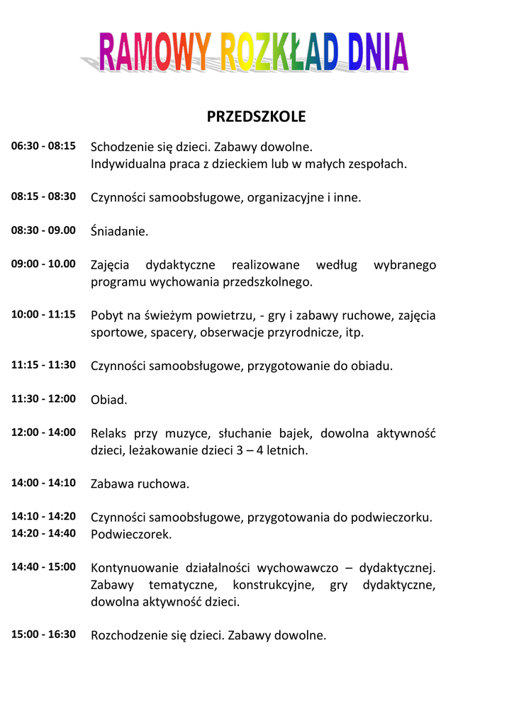 PRZEDSZKOLE 06:30 - 08:15 Schodzenie się dzieci. Zabawy dowolne. Indywidualna praca z dzieckiem lub w małych zespołach. 08:15 - 08:30 Czynności samoobsługowe, organizacyjne i inne. 08:30 - 09.00 Śniadanie. 09:00 - 10.00 Zajęcia dydaktyczne realizowane według programu wychowania przedszkolnego. 10:00 - 11:15 Pobyt na świeżym powietrzu, - gry i zabawy ruchowe, zajęcia sportowe, spacery, obserwacje przyrodnicze, itp. 11:15 - 11:30 Czynności samoobsługowe, przygotowanie do obiadu. 11:30 - 12:00 Obiad. 12:00 - 14:00 Relaks przy muzyce, słuchanie bajek, dowolna aktywność dzieci, leżakowanie dzieci 3 – 4 letnich. 14:00 - 14:10 Zabawa ruchowa. 14:10 - 14:20 14:20 - 14:40 Czynności samoobsługowe, przygotowania do podwieczorku. Podwieczorek. 14:40 - 15:00 Kontynuowanie działalności wychowawczo – dydaktycznej. Zabawy tematyczne, konstrukcyjne, gry dydaktyczne, dowolna aktywność dzieci. 15:00 - 16:30 Rozchodzenie się dzieci. Zabawy dowolne. wybranego
