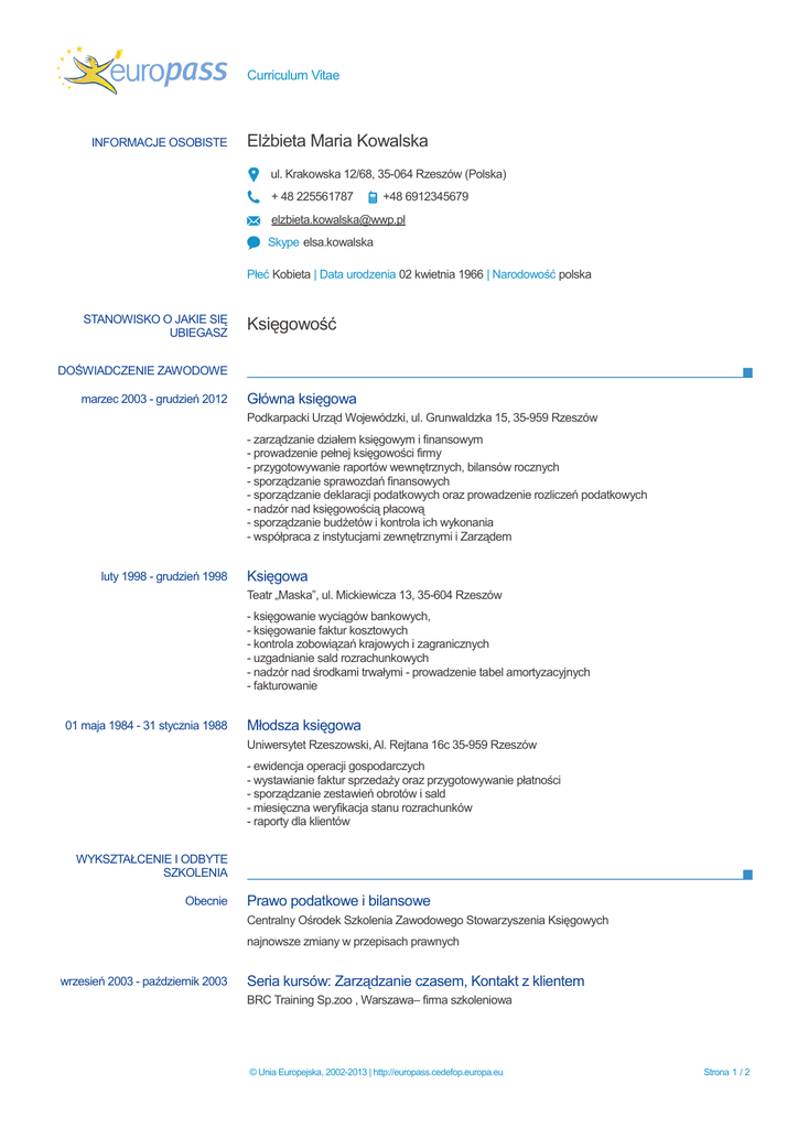 Curriculum Vitae INFORMACJE OSOBISTE Elżbieta Maria Kowalska ul. Krakowska 12/68, 35-064 Rzeszów (Polska) + 48 225561787 +48 6912345679 [email protected] Skype elsa.kowalska Płeć Kobieta | Data urodzenia 02 kwietnia 1966 | Narodowość polska STANOWISKO O JAKIE SIĘ UBIEGASZ Księgowość DOŚWIADCZENIE ZAWODOWE marzec 2003 - grudzień 2012 Główna księgowa Podkarpacki Urząd Wojewódzki, ul. Grunwaldzka 15, 35-959 Rzeszów - zarządzanie działem księgowym i finansowym - prowadzenie pełnej księgowości firmy - przygotowywanie raportów wewnętrznych, bilansów rocznych - sporządzanie sprawozdań finansowych - sporządzanie deklaracji podatkowych oraz prowadzenie rozliczeń podatkowych - nadzór nad księgowością płacową - sporządzanie budżetów i kontrola ich wykonania - współpraca z instytucjami zewnętrznymi i Zarządem luty 1998 - grudzień 1998 Księgowa Teatr „Maska”, ul. Mickiewicza 13, 35-604 Rzeszów - księgowanie wyciągów bankowych, - księgowanie faktur kosztowych - kontrola zobowiązań krajowych i zagranicznych - uzgadnianie sald rozrachunkowych - nadzór nad środkami trwałymi - prowadzenie tabel amortyzacyjnych - fakturowanie 01 maja 1984 - 31 stycznia 1988 Młodsza księgowa Uniwersytet Rzeszowski, Al. Rejtana 16c 35-959 Rzeszów - ewidencja operacji gospodarczych - wystawianie faktur sprzedaży oraz przygotowywanie płatności - sporządzanie zestawień obrotów i sald - miesięczna weryfikacja stanu rozrachunków - raporty dla klientów WYKSZTAŁCENIE I ODBYTE SZKOLENIA Obecnie Prawo podatkowe i bilansowe Centralny Ośrodek Szkolenia Zawodowego Stowarzyszenia Księgowych najnowsze zmiany w przepisach prawnych wrzesień 2003 - październik 2003 Seria kursów: Zarządzanie czasem, Kontakt z klientem BRC Training Sp.zoo , Warszawa– firma szkoleniowa © Unia Europejska, 2002-2013 | http://europass.cedefop.europa.eu Strona 1 / 2 Curriculum Vitae Elżbieta Maria Kowalska Planowanie własnego czasu, ustalanie priorytetów, planowanie czasu zespołu, Aktywne słuchanie, rozwiązywanie problemów, kontakt z trudnym klientem marzec 2001 - listopad 2001 Magister ekonomii Akademia Ekonomiczna w Krakowie Ekonomia matematyczna, rachunkowość, makroekonomia, mikroekonomia, ekonometria, statystyka, finanse i bankowość, podstawy organizacji i zarządzania, programowanie rozwoju społecznoekonomicznego, podstawy przedsiębiorczości, prawo, polityka ekonomiczna, prognozowanie i symulacje, finanse publiczne itp. UMIEJĘTNOŚCI Język ojczysty polski Inne języki ROZUMIENIE rosyjski MÓWIENIE PISANIE Słuchanie Czytanie Porozumiewanie się Samodzielne wypowiadanie się C2 B2 C2 C2 B2 Poziomy: A1/2: podstawowy - B1/2: średni - C1/2 zaawansowany Europejski system opisu kształcenia językowego Umiejętności komunikacyjne łatwość w nawiązywaniu kontaktów, umiejętność rozwiązywania problemów, dobra komunikacjanabyte dzięki szkoleniom i doświadczeniu w zarządzaniu zespołem Umiejętności organizacyjne / kierownicze - zarządzanie 5-osobowym zespołem księgowych, umiejętność organizowania pracy swojej i innych – nabyte w pracy jako główna księgowa - umiejętność zarządzania czasem – nabyta w trakcie kursu i pracy w księgowości - umiejętność planowania i ustalania celów Umiejętności zawodowe Umiejętności obsługi komputera Prawo jazdy obsługa programów księgowych serii Symfonia, SAP obsługa komputera PC z systemem Windows B © Unia Europejska, 2002-2013 | http://europass.cedefop.europa.eu Strona 2 / 2