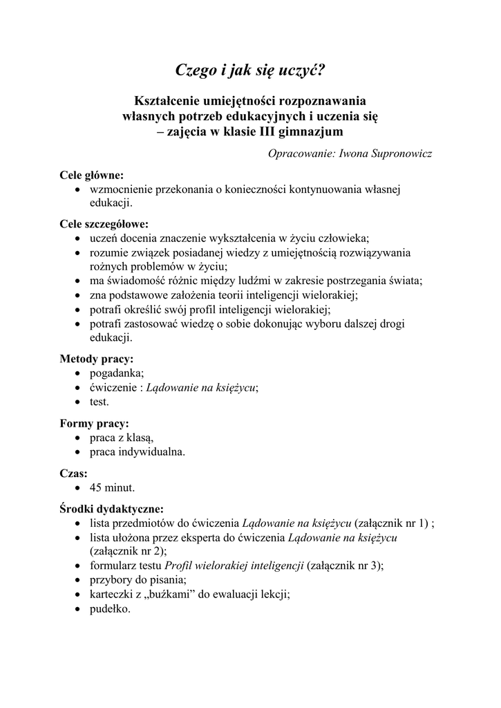 Czego i jak się uczyć? Kształcenie umiejętności rozpoznawania własnych potrzeb edukacyjnych i uczenia się – zajęcia w klasie III gimnazjum Opracowanie: Iwona Supronowicz Cele główne: wzmocnienie przekonania o konieczności kontynuowania własnej edukacji. Cele szczegółowe: uczeń docenia znaczenie wykształcenia w życiu człowieka; rozumie związek posiadanej wiedzy z umiejętnością rozwiązywania rożnych problemów w życiu; ma świadomość różnic między ludźmi w zakresie postrzegania świata; zna podstawowe założenia teorii inteligencji wielorakiej; potrafi określić swój profil inteligencji wielorakiej; potrafi zastosować wiedzę o sobie dokonując wyboru dalszej drogi edukacji. Metody pracy: pogadanka; ćwiczenie : Lądowanie na księżycu; test. Formy pracy: praca z klasą, praca indywidualna. Czas: 45 minut. Środki dydaktyczne: lista przedmiotów do ćwiczenia Lądowanie na księżycu (załącznik nr 1) ; lista ułożona przez eksperta do ćwiczenia Lądowanie na księżycu (załącznik nr 2); formularz testu Profil wielorakiej inteligencji (załącznik nr 3); przybory do pisania; karteczki z „buźkami” do ewaluacji lekcji; pudełko. 2 Przebieg zajęć: I. Wprowadzenie: 1. Powitanie uczniów. 2. Podanie tematu lekcji. II. Główna część zajęć: 1. Krótka pogadanka na temat przydatności wiedzy w życiu. 2. Ćwiczenie Lądowanie na księżycu1: Nauczyciel czyta następującą instrukcję: Wasz statek kosmiczny rozbił się na Księżycu. Mieliście się tam połączyć z macierzystym statkiem bazą, znajdującym się w tej chwili 300 km od Was, po oświetlonej stronie Księżyca, a można się tam dostać przez pasmo gór. Przeżycie wyprawy kosmicznej zależy od tego, czy dotrzecie do oddalonego o 300 km statku bazy. Waszym zadaniem jest uszeregować zaproponowane przedmioty na liście według stopnia ich przydatności do zachowania życia. Cyfrą l oznaczcie przedmiot najniezbędniejszy, 2 następny, aż do 14, która oznaczy najmniej przydatny przedmiot. Uczniowie samodzielnie wypełniają listę przedmiotów (załącznik nr 1). Nauczyciel zaprasza kilku ochotników do podzielenia się swoją listą z resztą grupy. Prosi o uzasadnienie wyborów i o nieocenianie kolegów. Po krótkiej dyskusji czyta właściwą listę przedmiotów wyselekcjonowanych przez eksperta. Nauczyciel prosi uczniów, żeby podsumowali ćwiczenie odpowiadając na pytanie, czy udałoby im się przetrwać w warunkach panujących na Księżycu. Nauczyciel pyta, jak uczniowie zaplanowaliby swoje życie w najbliższym czasie, gdyby mieli 90% pewności, że podobna sytuacja zdarzy im się w ciągu najbliższych pięciu lat. Nauczyciel zwraca szczególną uwagę na odpowiedzi wskazujące na konieczność wzbogacania własnej wiedzy i umiejętności np.: dowiem się więcej o Księżycu; pójdę do szkoły przetrwania; będę trenował, żeby uzyskać sprawność fizyczną. 3. Nauczyciel prosi uczniów o podanie kilku przykładów różnych sytuacji w życiu, które mogą się zdarzyć każdemu z dużym prawdopodobieństwem i których rozwiązanie zależy od posiadanej 1 Paszkowska-Rogacz Anna: Warsztat pracy europejskiego doradcy kariery zawodowej. Warszawa: Krajowy Ośrodek Wspierania Edukacji Zawodowej, 2002. s. 31-33. 3 4. 5. 6. 7. wiedzy i umiejętności, np. pierwsza pomoc podczas wypadków komunikacyjnych, zaprojektowanie wnętrza swojego mieszkania, wygrana w konkursie, wyprawa w góry. Nauczyciel prosi uczniów o odpowiedź na pytanie Czy każdy z nas jest w stanie nauczyć się wszystkiego, zdobywać wiedzę z każdej dziedziny? Nauczyciel podsumowuje opinie uczniów i tłumaczy główne założenia teorii wielorakiej inteligencji. Rozdaje formularze testu Profil wielorakiej inteligencji i wyjaśnia, jak należy go wypełnić. Uczniowie wykonują test. W przypadku braku czasu, może to być zadanie do domu. III. Podsumowanie zajęć: 1. Nauczyciel wyjaśnia, że każdy powinien właściwie dokonywać wyboru dalszej drogi edukacji (w przyszłości zawodu), zgodnie z własnymi potrzebami edukacyjnymi i własnymi predyspozycjami, które określane są m.in. przez dominujący rodzaj inteligencji. 2. Podziękowanie za wspólną pracę na lekcji. 3. Ewaluacja za pomocą karteczek z buźkami wrzucanych do pudełka. Załącznik nr 1: LISTA PRZEDMIOTÓW (wzorowane na „Moon Explorer Problem", Kroechnert, 1991) Lp. 1. 2. 3. 4. 5. 6. 7. 8. 9. 10. 11. 12. 13. 14. Przedmioty Pudełko zapałek Puszka z koncentratem żywności 20 m nylonowego sznura Jedwabny parasol spadochronu Przenośny teleskop na baterie słoneczne Skrzynka mleka w proszku Dwie butle z tlenem, każda o wadze 50 kg Mapa nieba widzianego z Księżyca Samoczynnie nadmuchująca się tratwa ratunkowa Kompas 25 litrów wody Rakiety sygnałowe Zestaw pierwszej pomocy Nadajnik i odbiornik UKF zasilany energią słoneczną Ocena przydatności 4 Załącznik nr 2: Lista ułożona przez eksperta Lp. Przedmioty 1. Pudełko zapałek 2. Puszka z koncentratem żywności 20 m nylonowego sznura 3. Prawidłowa kolejność 14 4 6 4. Jedwabny parasol spadochronu 5. Przenośny teleskop na baterie słoneczne 6. Skrzynka mleka w proszku 7. Dwie butle z tlenem, każda o wadze 50 kg 8. Mapa nieba widzianego z Księżyca 9. Samoczynnie nadmuchująca się tratwa ratunkowa 10. Kompas 8 12 11 1 3 9 13 11. 25 litrów wody 2 12. Rakiety sygnałowe 13. Zestaw pierwszej pomocy 14. Nadajnik i odbiornik UKF zasilany energią słoneczną 10 7 5 Uzasadnienie eksperta Na Księżycu brak tlenu - warunku spalania; całkowicie bezużyteczne. Wydajny środek zaopatrzenia się w potrzebną energię. Rzecz przydatna podczas pokonywania skał oraz do transportu rannych. Ochrona przed promieniami słonecznymi. Zbędny poza stroną oświetloną Bardzo objętościowy substytut koncentratu spożywczego. Najniezbędniejsze, warunkują utrzymanie się przy życiu. Podstawowy przyrząd nawigacyjny. Butlę z CO2, w jaką jest zaopatrzona, można wykorzystać jako
