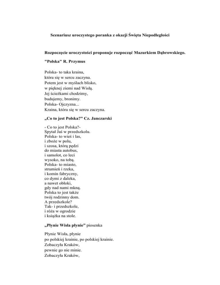 Scenariusz uroczystego poranka z okazji Święta Niepodległości Rozpoczęcie uroczystości proponuje rozpocząć Mazurkiem Dąbrowskiego. "Polska" R. Przymus Polska- to taka kraina, która się w sercu zaczyna. Potem jest w myślach blisko, w pięknej ziemi nad Wisłą. Jej ścieżkami chodzimy, budujemy, bronimy. Polska- Ojczyzna... Kraina, która się w sercu zaczyna. „Co to jest Polska?” Cz. Janczarski - Co to jest Polska?Spytał Jaś w przedszkolu. Polska- to wieś i las, i zboże w polu, i szosa, którą pędzi do miasta autobus, i samolot, co leci wysoko, na tobą. Polska- to miasto, strumień i rzeka, i komin fabryczny, co dymi z daleka, a nawet obłoki, gdy nad nami mkną. Polska to jest także twój rodzinny dom. A przedszkole? Tak- i przedszkole, i róża w ogrodzie i książka na stole. „Płynie Wisła płynie” piosenka Płynie Wisła, płynie po polskiej krainie, po polskiej krainie. Zobaczyła Kraków, pewnie go nie minie. Zobaczyła Kraków, pewnie go nie minie. Zobaczyła Kraków, wnet go pokochała, wnet go pokochała. I w dowód miłości wstęgą opasała. I w dowód miłości wstęgą opasała. Płynie Wisła, płynie po polskiej krainie, po polskiej krainie. A dopóki płynie, Polska nie zaginie! A dopóki płynie, Polska nie zaginie! „Polska długa i szeroka” G. Szadkowska Jest taki kraj, Nasza Ojczyzna, duży czy mały się do niej przyzna. Stary czy młody, wysoki czy niski każdy chce poznać swój kraj ojczysty. Przepiękne góry, wysokie lasy, górskie strumienie - po wszystkie czasy. Wśród nich dywany z kwiatów –sasanek i miasto co zwie się Zakopane. ,,Góry nasze, góry” Janina Porazińska Góry nasze, góry! Hale nasze , hale! Kto was zna tak dobrze, jako my, górale! Góry nasze, góry! Wy, wysokie szczyty! Kto was przewędrował? Góral rodowity. Na hali słowa: Hanna Ożogowska Na hali, na hali, na zielonej hali. słychać, że już owce górale wygnali. Pasą się owieczki, brzękają owieczki, lecą aż pod Giewont góralskie piosneczki. Góral ci ja, góral w górach wychowany, mam skórzane kierpce, serdak wyszywany. Mam kapelusz czarny, orle na nim pióra, góral ci ja, góral wychowany w górach. Piosenka ,,W murowanej piwnicy” W murowanej piwnicy, tańcowali zbójnicy. Kazali se piknie grać i na nóżki pozierać. Tańcowałbyk kiebyk móg, kiebyk ni mioł krzywych nóg. A że krziwe nogi mom, co podskocze , to sie gnom ! „Polska długa i szeroka” G. Szadkowska Wyżej wyżyny, krajobraz taki, który kochają wszyscy Polacy. Zabytków Wiela kotlina mieści, najwięcej o niej jest opowieści. O dzielnym szewczyku i królu Kraku, smoku wawelskim. To miasto Kraków. „Na krakowskim rynku” Jadwiga Korczakowska Na krakowskim Rynku, przed Sukiennicami, dziwny konik bryka, chce się bawić z nami. Pięknie ustrojony, trzęsie bujną grzywą, bije nam pokłony, do zabawy wzywa. Małych gapiów goni pośród śmiechu, krzyku. Dzieci klaszczą w dłonie. – Wiwat, Lajkoniku! ,,Piosenka o smoku wawelskim” Dawno temu, pod Krakowem żył okrutny, wielki smok. Miał nóg dziesięć, cztery głowy i straszliwy smoczy wzrok! Cały Kraków głośno płakał, a najgłośniej Książę Krak! Chciał, by ktoś potwora złapał, więc przez łzy przemawiał tak ... Stu rycerzy na stu koniach wkrótce potem smok ten zjadł, lecz go w końcu szewc pokonał, co na rynku kramik miał !!! Ze zdumienia aż oniemiał zapłakany Książę Krak, lecz dotrzymał przyrzeczenia, mówiąc mu na migi tak .... „Polska długa i szeroka” G. Szadkowska Gdy w górę z mapą powędrujemy, zieloną nizinę odkryjemy, W której stolice naszą mamy. Z dumą Warszawą ją nazywamy. Warszawa R. Przymus Nasza stolica, nasza Warszawa! Serce Ojczyzny… Piękna, ciekawa. Tu każdy Polak wesoło śpieszy, by oczy, myśli swym sercem cieszyć. Nad głową słońce, gwarne gołębie… Domy odbite w wiślanej głębi. Dla niej uśmiechy, kwiaty i brawa! Nasza stolica, nasza Warszawa… "Syrenka" Laskowski J. Stoi Syrenka nad Wisłą, słońce w jej oczach zabłysło. Warszawskie dzieci tu przyszły, stanęły na brzegu Wisły. Kiwają Syrenie ręką : "Jakże się masz Syrenko?" Piosenka o Warszawie (płyta) „Polska długa i szeroka” G. Szadkowska Gdy z biegiem Wisły tak wędrujemy, nad piękne morze się udajemy. Bo tam Trójmiasto na nas już czeka. Gdańsk, Sopot, Gdynia wszystkich urzeka. "Bałtyku, Bałtyku" B. Lewandowska Bałtyku, Bałtyku, w głąb fal twoich szybkich rzucamy swe sieci. Napędzaj w nie rybki. Chcemy ich nałowić dużo, bardzo dużo. Bałtyku, Bałtyku, nie przeszkodź nam burzą! Szanty: Hej, Me Bałtyckie morze! Hej, me Bałtyckie Morze, wdzięczny Ci jestem bardzo. Toś Ty mnie wychowało, toś Ty mnie wychowało, szkołęś mi dało twardą. Szkołęś mi dało twardą, uczyłoś łodzią pływać, żagle pięknie cerować, żagle pięknie cerować, codziennie pokład zmywać. Codziennie pokład zmywać, od soli i od kurzy, mosiądze wyglansować, mosiądze wyglansować, w ciszy, czy w czasie burzy. W ciszy, czy w czasie burzy, trzeba przy pracy śpiewać, bo kiedy śpiewu nie ma, bo kiedy śpiewu nie ma, neptun się będzie gniewać. „Polska długa i szeroka” G. Szadkowska I tym sposobem moi kochani, przeszliśmy Polskę od granic do granic. Cieszymy się wszyscy, że tutaj mieszkamy, takiego piękna nigdzie nie mamy. Na zakończenie można posłuchać muzyki Chopina - np. mazurka lub poloneza.
