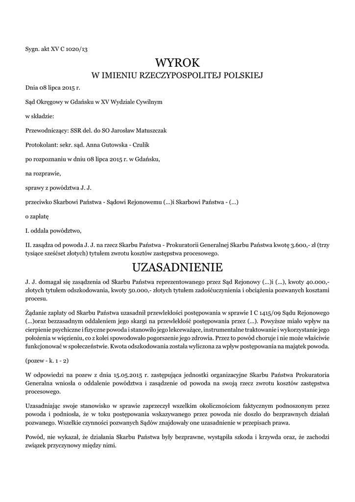 Sygn. akt XV C 1020/13 WYROK W IMIENIU RZECZYPOSPOLITEJ POLSKIEJ Dnia 08 lipca 2015 r. Sąd Okręgowy w Gdańsku w XV Wydziale Cywilnym w składzie: Przewodniczący: SSR del. do SO Jarosław Matuszczak Protokolant: sekr. sąd. Anna Gutowska - Czulik po rozpoznaniu w dniu 08 lipca 2015 r. w Gdańsku, na rozprawie, sprawy z powództwa J. J. przeciwko Skarbowi Państwa - Sądowi Rejonowemu (...)i Skarbowi Państwa - (...) o zapłatę I. oddala powództwo, II. zasądza od powoda J. J. na rzecz Skarbu Państwa - Prokuratorii Generalnej Skarbu Państwa kwotę 3.600,- zł (trzy tysiące sześćset złotych) tytułem zwrotu kosztów zastępstwa procesowego. UZASADNIENIE J. J. domagał się zasądzenia od Skarbu Państwa reprezentowanego przez Sąd Rejonowy (...)i (...), kwoty 40.000,złotych tytułem odszkodowania, kwoty 50.000,- złotych tytułem zadośćuczynienia i obciążenia pozwanych kosztami procesu. Żądanie zapłaty od Skarbu Państwa uzasadnił przewlekłości postępowania w sprawie I C 1415/09 Sądu Rejonowego (...)oraz bezzasadnym oddaleniem jego skargi na przewlekłość postępowania przez (...). Powyższe miało wpływ na cierpienie psychiczne i fizyczne powoda i stanowiło jego lekceważące, instrumentalne traktowanie i wykorzystanie jego położenia w więzieniu, co z kolei spowodowało pogorszenie jego zdrowia. Przez to powód choruje i nie może właściwie funkcjonować w społeczeństwie. Kwota odszkodowania została wyliczona za wpływ postępowania na majątek powoda. (pozew - k. 1 - 2) W odpowiedzi na pozew z dnia 15.05.2015 r. zastępująca jednostki organizacyjne Skarbu Państwa Prokuratoria Generalna wniosła o oddalenie powództwa i zasądzenie od powoda na swoją rzecz zwrotu kosztów zastępstwa procesowego. Uzasadniając swoje stanowisko w sprawie zaprzeczył wszelkim okolicznościom faktycznym podnoszonym przez powoda i podniosła, że w toku postępowania wskazywanego przez powoda nie doszło do bezprawnych działań pozwanego. Wszelkie czynności pozwanych Sądów znajdowały one uzasadnienie w przepisach prawa. Powód, nie wykazał, że działania Skarbu Państwa były bezprawne, wystąpiła szkoda i krzywda oraz, że zachodzi związek przyczynowy między nimi. Bezzasadne jest również roszczenie powoda w zakresie, w jakim wywodzi je z naruszenia dóbr osobistych. Jego żądanie jest związane z wyłącznie subiektywnymi przeżyciami samego powoda, a do naruszenia dobra osobistego dochodzi gdy dane zachowanie budzi negatywną reakcję w społeczeństwie (koncepcja obiektywna naruszenia dobra osobistego). (odpowiedź na pozew Skarbu Państwa - k. 238 - 239) Sąd ustalił następujący stan faktyczny: Przed Sądem Rejonowym (...)toczyło się postępowanie z powództwa J. J., zarejestrowane pod sygn. akt I C 1415/09. W postępowaniu tym, w toku rozpoznawania skargi powoda na naruszenie prawa strony do rozpoznania sprawy bez nieuzasadnionej zwłoki przez (...), zarejestrowanej pod sygn. akt S 160/10 nie stwierdzono zwłoki i skargę oddalono postanowieniem z dnia 14.01.2011 r. Okoliczność bezsporna, nadto: pismo Z - cy Przewodniczącego III Wydziału Cywilnego z dnia 07.05.2015 r. - k. 139a Sąd zważył, co następuje: Ustalony stan faktyczny był bezsporny. Było to wynikiem przyznania przez osoby występujące po stronie pozwanej w charakterze współuczestników formalnych części okoliczności faktycznych wskazanych przez powoda oraz braku twierdzeń o faktach i inicjatywy dowodowej powoda. Sąd pominął dowód z akt spraw S 160/10 i I C 1415/10, albowiem akta sprawy sądowej nie mogą stanowić dowodu jako jednorodna całość. Wynika to z tego, że stanowią jedynie zbiór różnego rodzaju dokumentów (urzędowych i prywatnych). W judykaturze od dawna ugruntowany jest pogląd, wynikający z treści art. 244 i 245 k.p.c., iż możliwe jest jedynie przeprowadzenie dowodu poszczególnych z dokumentów znajdujących się w aktach określonej sprawy (por. z wielu: wyrok Sądu Najwyższego z dnia 27 stycznia 1999 r., sygn.. II CKN 798/97, LEX nr 50747) Pozwany Skarb Państwa nie zakwestionował faktu, że wymienione w pozwie i przywołane w stanie faktycznym sprawy toczyły się z udziałem powoda, co czyniło tę okoliczność bezsporną. Zaprzeczenie bowiem wszystkim okolicznościom bez ich konkretnego wskazania nie jest skuteczne. Natomiast w uzasadnieniu odpowiedzi na pozew pozwany wyjaśnił, że zaprzecza bezprawności działania organów państwa we wskazanych sprawach. Wobec niepowołania przez powoda w pozwie żadnych faktów, na których opierał twierdzenie o zaistnieniu przewlekłości postępowań w sprawach objętych pozwem i nie wskazał, które dokumenty z akt wymienionych spraw mają stanowić dowody na te okoliczności, sąd pominął ten dowód jako niedopuszczalny. Zwrócić przy tym należy uwagę, że sąd uwzględnił przed podjęciem decyzji w tym przedmiocie fakt, iż powód nie był reprezentowany przez zawodowego pełnomocnika. W związku z tym, zarządzeniem z dnia 20.05.2015 r., doręczonym w dniu 12.11.2012 r. (k. 241, k. 246, 261) powód został zobowiązany do złożenia pisma przygotowawczego, w którym m.in. miał wskazać dokumenty w aktach spraw S 160/10 i I C 1415/09, z których ma zostać przeprowadzony dowód i na jakie okoliczności, oraz ich nadesłania wraz z pismem w terminie 14 dni, m.in. pod rygorem pominięcia tych dowodów. Pouczono przy tym powoda o treści art. 9 k.p.c. i 250 k.p.c. Powód jako strona postępowań mógł zwrócić się o udzielenie odpisów z dokumentów tych spraw, na podstawie art. 9§2 k.p.c. (o którym go pouczono) Z urzędu jest też sądowi wiadome, że powód często zwraca się o odpisy dokumentów z akt w licznych prowadzonych przez siebie sprawach, co miało miejsce i w sprawie niniejszej. Zgodnie z art. 5 k.p.c. w wezwaniu wskazano powodowi, że kodeksowi postępowania cywilnego nie jest znana instytucja dowodu z całych akt oraz pouczono go o treści art. 250§1 k.p.c. Jednocz
