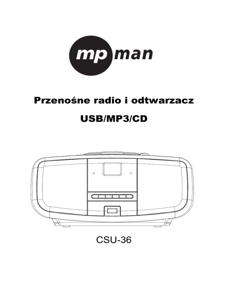 Przenośne radio i odtwarzacz USB/MP3/CD CSU-36 OSTRZEŻENIE ABY UNIKNĄĆ RYZYKA POŻARU I PORAŻENIA ELEKTRYCZNEGO, NIE WYSTAWIAJ URZĄDZENIA NA DESZCZ I WILGOĆ. SYMBOL BŁYSKAWICY ZE STRZAŁKĄ w trójkącie równobocznym służy ostrzeżeniu użytkownika przed obecnością wewnątrz produktu niebezpiecznych, nieizolowanych elementów pod napięciem, które może być wystarczająco wysokie by powodować ryzyko porażenia elektrycznego. SYMBOL WYKRZYKNIKA w trójkącie równobocznym, służy do wskazania, że ze względów bezpieczeństwa pewne elementy urządzenia mogą być zastąpione wyłącznie elementami wymienionymi w niniejszej dokumentacji. Do urządzenia zostały przymocowane poniższe etykiety, wskazujące sposób postępowania w pracy z wiązką laserową: ETYKIETA CLASS 1 LASER PRODUCT - etykieta ta służy informowaniu, że urządzenie zawiera część laserową (Klasa 1 - lasery które są bezpieczne w racjonalnych warunkach pracy). ETYKIETA OSTRZEGAWCZA INFORMUJĄCA O PROMIENIOWANIU LASEROWYM - ostrzega przed znajdującym się w środku urządzenia źródłem promieniowania. Sprzęt zawiera laser emitujący promieniowanie laserowe zgodne z limitami dla produktów laserowych klasy 1. PL-1 INSTRUKCJE BEZPIECZEŃSTWA 1. PRZECZYTAĆ INSTRUKCJE – przed rozpoczęciem korzystania z urządzenia należy przeczytać wszystkie instrukcje dotyczące bezpieczeństwa i użytkowania. 2. ZACHOWAĆ INSTRUKCJE – zachować wszystkie instrukcje, mogą się przydać w przyszłości. 3. ZWRÓCIĆ UWAGĘ NA OSTRZEŻENIA – należy stosować się do wszystkich ostrzeżeń umieszczonych zarówno na urządzeniu jak i w niniejszych instrukcjach. 4. PRZESTRZEGAĆ INSTRUKCJI – należy ściśle przestrzegać wszystkich instrukcji. 5. WODA I WILGOĆ – urządzenie nie może być używane w pobliżu wody, na przykład niedaleko prysznica, umywalki, zlewu kuchennego, mokrego prania a także na basenie czy w wilgotnej piwnicy. 6. WENTYLACJA – urządzenie powinno być ustawione tak, żeby nie było żadnych przeszkód w prawidłowej jego wentylacji. Nie stawiać na łóżku, sofie, dywanie lub innych miękkich powierzchniach, które mogą zablokować otwory wentylacyjne ani nie umieszczać w zabudowanych meblach typu meblościanka lub szafka, które zahamują przepływ powietrza do wlotów w urządzeniu. 7. CIEPŁO – urządzenie powinno znajdować się z daleka zarówno od wszelkich typowych źródeł ciepła takich jak grzejniki, kominki czy piecyki jak i innych urządzeń (włączając w to wzmacniacze), które wydzielają ciepło. 8. ZASILANIE – podłączać urządzenie wyłącznie do sieci o parametrach opisanych w instrukcji użytkowania lub zaznaczonych na urządzeniu. 9. OCHRONA PRZEWODU ZASILAJĄCEGO – przewód zasilania powinien być ułożony tak, żeby nie można było go zdeptać ani też przytrzasnąć przedmiotami stawianymi przy lub naprzeciwko urządzenia. 10. LINIE ELEKTRYCZNE – antena zewnętrzna powinna znajdować się z dala od linii elektrycznych. 11. ZALANIE LUB WRZUCENIE PRZEDMIOTÓW DO URZĄDZENIA – należy zwrócić uwagę by do otworów w obudowie urządzenia nie dostały się żadne przedmioty ani płyny. 12. UWAGA NA ŁADUNKI ELEKTROSTATYCZNE – z powodu ładunków elektrostatycznych urządzenie może nie pracować prawidłowo lub nie reagować na próby wykonywania jakichkolwiek działań. Należy wówczas wyłączyć urządzenie, odłączyć je z sieci zasilania i poczekać kilka sekund przed ponownym włączeniem. 13. USZKODZENIA WYMAGAJĄCE NAPRAWY SERWISOWEJ – urządzenie powinno być serwisowane przez kompetentnych serwisantów gdy: a. wystąpiło uszkodzenie wtyczki lub przewodu zasilania. b. do urządzenia dostały się jakieś przedmioty lub płyny. c. urządzenie było poddane działaniu deszczu. d. urządzenie zostało upuszczone lub została uszkodzona jego obudowa. e. urządzenie nie działa w normalny sposób. 14. NAPRAWY – użytkownik nie może podejmować prób napraw i konserwacji urządzenia, oprócz tych które zostały wymienione w instrukcji. Wszystkie pozostałe naprawy powinny zostać zlecone wyłącznie uprawnionym pracownikom serwisu. Uwagi: a. Zabrudzone lub porysowane płyty CD mogą być przyczyną problemów ze “skakaniem” dźwięku. Należy wyczyścić lub wymienić płytę. b. Jeśli pojawi się informacja o błędzie lub urządzenie będzie działało wadliwie, należy odłączyć przewód zasilania i wyjąć wszystkie baterie. Następnie ponownie włączyć urządzenie do prądu. PRZED ROZPOCZĘCIEM UŻYTKOWANIA Uwagi: DOTYCZY PŁYT CD. Ponieważ brudne i porysowane płyty mogą uszkodzić urządzenie, należy przestrzegać następujących zasad: a. Używać tylko odpowiednich. Korzystać wyłącznie z płyt oznaczonych symbolem widocznym poniżej. b. Korzystać z płyt CD zawierających wyłącznie cyfrowy sygnał audio. PL-2 ŹRÓDŁA ZASILANIA gniazdko ścienne gniazdo zasilania Włożyć 8 baterii “C” (R14) do komory na baterie ZASILANIE Z SIECI To przenośne urządzenie można zasilać wkładając odłączalny kabel zasilający do gniazda zasilania znajdującego się z tyłu urządzenia i podłączając go do ściennego gniazda zasilania. Przed wykonaniem tej czynności należy sprawdzić, czy napięcie zasilania urządzenia jest zgodne z napięciem w lokalnej sieci elektrycznej. Upewnić się, że przewód zasilania jest w pełni podłączony do wyjścia w urządzeniu. ZASILANIE BATERYJNE Włożyć 6 baterii “C” (R14) do przegrody na baterie. Należy zwrócić uwagę na prawidłowe (zgodne z oznaczeniami polaryzacji) włożenie baterii, w innym przypadku urządzenie może zostać uszkodzone. Zawsze wyjmować baterie w przypadku, gdy urządzenie ma być długo nieużywane, pozwoli to zapobiec wylaniu się zawartości baterii, co w konsekwencji może prowadzić do uszkodzenia sprzętu. Uwagi: - Używać baterii tego samego typu. Nigdy nie łączyć różnych typów baterii. - Aby korzystać z zasilania