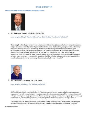 OPINIE EKSPERTÓW Eksperci wypowiadają się na temat wody alkalicznej • Dr. Robert O. Young, MS, D.Sc., Ph.D., ND Autor książki: „The pH Miracle: Balance Your Diet, Reclaim Your Health” („Cud pH”) "Poziom pH (określający kwasowość lub zasadowość substancji) naszych płynów organicznych ma wpływ na kaŜdą komórkę ciała. Organizm ludzki nie znosi zbyt dobrze jakiegokolwiek, dłuŜszego braku równowagi kwasowo-zasadowej. W rzeczywistości cały metabolizm uzaleŜniony jest od zrównowaŜonego, zasadowego środowiska w naszym organizmie. Chroniczne zbyt kwasowe pH niszczy tkanki, powoli wŜerając się w 100.000 km Ŝył i arterii, jak kwas wŜerający się w marmur. Jeśli wymknie się spod kontroli, moŜe zaburzać funkcjonowanie wszystkich komórek, od bicia serca po przepływ neuronów w mózgu. Krótko mówiąc zakwaszenie organizmu zakłóca wszelkie funkcje Ŝyciowe, prowadząc do róŜnych dolegliwości i chorób!" • • Dr. Theodore A. Baroody, DC, ND, Ph.D. Autor książki: „Alkalize or Die” (Alkalizuj albo giń) „KWASICA to źródło wszelkich chorób. Warto zrozumieć prosty proces alkalizowania naszego organizmu i to, jak waŜne jest przywrócenie odpowiedniego, zasadowego pH w zwalczaniu chorób i utrzymaniu ogólnie pojętego zdrowia. Nasze gruczoły i organy funkcjonują najlepiej wówczas, gdy zachowane są odpowiednie proporcje pomiędzy poziomem kwasów i zasad w organizmie. " "W swojej pracy w sumie zaleciłem picie ponad 20,000 litrów tej wody praktycznie przy kaŜdym problemie ze zdrowiem. UwaŜam, Ŝe picie wody alkalizowanej kaŜdemu przyniesie korzyści." www.mediasklep.pl • • Sang Whang Autor książki: „Reverse Aging” (Odwrócić proces starzenia) "Oto na czym polega proces starzenia: kaŜda Ŝywa komórka w organizmie wytwarza produkty przemiany materii. Składniki odŜywcze pochodzące z jedzenia dostarczane są do kaŜdej komórki, gdzie z wykorzystaniem tlenu są spalane, w ten sposób zyskujemy energię do Ŝycia. Spalane składniki odŜywcze to produkty przemiany materii. To, czy dana Ŝywność jest dla ciebie dobra czy nie, zaleŜy od tego, ile i jakie produkty przemiany materii z niej powstają: toksyczne, kwasowe, zasadowe, itd. Większość naszych komórek takŜe podlega metabolizmowi, zaś stare komórki stają się produktami przemiany materii." "Te produkty muszą zostać wydalone z organizmu. Prawda jest taka, Ŝe organizm ludzki robi, co moŜe, by pozbyć się ich wraz z moczem i potem. Prawie wszystkie produkty przemiany materii mają odczyn kwasowy; dlatego kwasowy odczyn ma teŜ mocz, podobnie jak powierzchnia skóry. Problem polega na tym, Ŝe z kilku powodów nasz organizm nie jest w stanie pozbyć się wszystkich produktów przemiany materii, jakie generuje. Głównym powodem takiego stanu rzeczy jest nasz obecny styl Ŝycia. Dlatego generujemy coraz więcej produktów przemiany materii, coraz mniej się ich pozbywamy. • • Dr. Sherry Rogers, MD Autorka książki: „Detoxify or Die” (Oczyść się albo giń) "Woda alkaliczna usuwa kwasowe produkty przemiany materii z organizmu... Po dokładnym przestudiowaniu efektów, jakie setkom moich pacjentów przyniosło przestrzeganie moich zaleceń, jestem przekonana, Ŝe toksyny pod postacią kwasowych produktów przemiany materii stanowią główną przyczynę wielu chorób." www.mediasklep.pl • • Felicia Drury Kliment Autorka książki: „The Acid Alkaline Balance Diet” (Dieta zapewniająca równowagę kwasowo-zasadową) "Potrzebowałam 20 lat badań, pisania i konsultacji w dziedzinie medycyny alternatywnej, zanim odkryłam główną, wspólną przyczynę wielu chorób zwyrodnieniowych: kwasowe produkty przemiany materii. W duŜym stopniu są to produkty uboczne trawienia poŜywienia, jakie jemy. Jeśli gromadzą się one w organizmie, zakłócają funkcjonowanie organów wewnętrznych i je uszkadzają. " "Po latach intensywnych badań klinicznych, jakie prowadzę na wielu moich klientach z wykorzystaniem wody alkalicznej poddanej elektrolizie, uwaŜam, Ŝe w ciągu najbliŜszych kilku lat technologia ta zmieni podejście wszystkich placówek opieki zdrowotnej i samych pacjentów do zdrowia. Polecam jak najczęstsze picie wody alkalicznej poddanej elektrolizie." • • Dr. Susan Lark, MD Wykładowca uniwersytecki i autorka książki: „The Chemistry of Success” (Chemia sukcesu) "Picie czterech do sześciu szklanek wody alkalicznej dziennie pomoŜe zneutralizować nadmierne zakwaszenie organizmu i z biegiem czasu przywróci witalność. Wodę alkalizowaną naleŜy pić wówczas, gdy pojawiają się choroby związane z zakwaszeniem organizmu, takie jak przeziębienie, grypa czy zapalenie oskrzeli. Podobnie jak witaminy C i E oraz beta-karoten, woda alkaliczna jest przeciwutleniaczem, a to za sprawą nadwyŜki wolnych elektronów. Dzięki temu chroni organizm przed chorobą serca, wylewem, zaburzeniami układu immunulogicznego i innymi powszechnymi dolegliwościami." www.mediasklep.pl • • David Niven Miller Ekspert w dziedzinie odwracania procesu starzenia, autor książki: „Grow Youthful: A Practical Guide to Slowing Your Ageing” (Bądź młody) "Picie większej ilości dobrej wody z kranu lub wody filtrowanej ma zbawienny wpływ na twoje zdrowie i odgrywa ogromną rolę w leczeniu praktycznie wszystkich chorób zwyrodnieniowych. JednakŜe woda alkaliczna przynosi jeszcze lepsze, długotrwałe efekty, bo przywraca równowagę zasadową w organizmie i dostarcza cennych przeciwutleniaczy." • • Daniel Reid Autor książki: „The Tao of Detox” (Tao oczyszczania) "Picie wody alkalicznej to doskonały sposób na zneutralizowanie i wypłukanie wszystkich toksyn i kwasów zalegających w tkankach i płynach organicznych, oraz na szybkie nawodnienie organizmu i utrzymanie zasadowego odczynu krwi." • • Harald Tietze Autor książki: „Youthing” (Odmłodnieć) www.mediasklep.pl "Picie wody alkalicznej moŜe odwrócić proces star