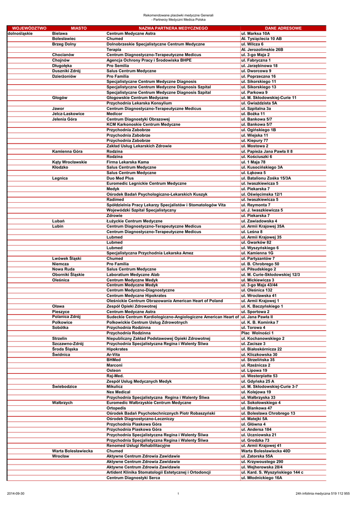 Rekomendowane placówki medyczne Generali - Partnerzy Medyczni Medica Polska WOJEWÓDZTWO dolnośląskie MIASTO Bielawa Bolesławiec Brzeg Dolny Chocianów Chojnów Długołęka Duszniki Zdrój Dzierżoniów Głogów Jawor Jelcz-Laskowice Jelenia Góra Kamienna Góra Kąty Wrocławskie Kłodzko Legnica Lubań Lubin Lwówek Śląski Niemcza Nowa Ruda Oborniki Śląskie Oleśnica Oława Pieszyce Polanica Zdrój Polkowice Sobótka Strzelin Szczawno-Zdrój Środa Śląska Świdnica Świebodzice Wałbrzych Warta Bolesławiecka Wrocław 2014-09-30 NAZWA PARTNERA MEDYCZNEGO DANE ADRESOWE Centrum Medyczne Astra ul. Marksa 10A Chumed Al. Tysiąclecia 10 AB Dolnobrzeskie Specjalistyczne Centrum Medyczne ul. Wilcza 6 Terapia Al. Jerozolimskie 26B Centrum Diagnostyczno-Terapeutyczne Medicus ul. 3-go Maja 2 Agencja Ochrony Pracy i Środowiska BHPE ul. Fabryczna 1 Pro Semilia ul. Jarzębinowa 18 Salus Centrum Medyczne ul. Dworcowa 9 Pro Familia ul. Poprzeczna 16 Specjalistyczne Centrum Medyczne Diagnosis ul. Sikorskiego 11 Specjalistyczne Centrum Medyczne Diagnosis Szpital ul. Sikorskiego 13 Specjalistyczne Centrum Medyczne Diagnosis Szpital ul. Parkowa 9 Głogowskie Centrum Medyczne ul. M. Skłodowskiej-Curie 11 Przychodnia Lekarska Konsylium ul. Gwiaździsta 5A Centrum Diagnostyczno-Terapeutyczne Medicus ul. Szpitalna 3a Medicor ul. Bożka 11 Centrum Diagnostyki Obrazowej ul. Bankowa 5/7 KCM Karkonoskie Centrum Medyczne ul. Bankowa 5/7 Przychodnia Zabobrze ul. Ogińskiego 1B Przychodnia Zabobrze ul. Wiejska 11 Przychodnia Zabobrze ul. Kiepury 77 Zakład Usług Lekarskich Zdrowie ul. Mostowa 2 Rodzina ul. Papieża Jana Pawła II 8 Rodzina ul. Kościuszki 6 Firma Lekarska Kama ul. 1 Maja 78 Salus Centrum Medyczne ul. Kusocińskiego 3A Salus Centrum Medyczne ul. Łąkowa 5 Duo Med Plus ul. Batalionu Zośka 15/3A Euromedic Legnickie Centrum Medyczne ul. Iwaszkiewicza 5 Medyk ul. Piekarska 7 Ośrodek Badań Psychologiczno-Lekarskich Kuszyk ul. Oświęcimska 12/1 Radimed ul. Iwaszkiewicza 5 Spółdzielnia Pracy Lekarzy Specjalistów i Stomatologów Vita ul. Reymonta 7 Wojewódzki Szpital Specjalistyczny ul. J. Iwaszkiewicza 5 Zdrowie ul. Piekarska 7 Łużyckie Centrum Medyczne ul. Zawiadowska 4 Centrum Diagnostyczno-Terapeutyczne Medicus ul. Armii Krajowej 35A Centrum Diagnostyczno-Terapeutyczne Medicus ul. Leśna 8 Lubmed ul. Armii Krajowej 35 Lubmed ul. Gwarków 82 Lubmed ul. Wyszyńskiego 6 Specjalistyczna Przychodnia Lekarska Amez ul. Kamienna 1G Chumed ul. Partyzantów 7 Pro Familia ul. B. Chrobrego 50 Salus Centrum Medyczne ul. Piłsudskiego 2 Laboratium Medyczne Alab ul. M. Curie-Skłodowskiej 12/3 Centrum Medyczne Medyk ul. Mickiewicza 3 Centrum Medyczne Medyk ul. 3-go Maja 43/44 Centrum Medyczno-Diagnostyczne ul. Oleśnica 132 Centrum Medyczne Hipokrates ul. Wrocławska 41 Oleśnickie Centrum Obrazowania American Heart of Poland ul. Armii Krajowej 1 Zespół Opieki Zdrowotnej ul. K. Baczyńskiego 1 Centrum Medyczne Astra ul. Sportowa 2 Sudeckie Centrum Kardiologiczno-Angiologiczne American Heart of Poland ul. Jana Pawła II Polkowickie Centrum Usług Zdrowotnych ul. K. B. Kominka 7 Przychodnia Rodzinna ul. Torowa 4 Przychodnia Rodzinna Plac Wolności 1 Niepubliczny Zakład Podstawowej Opieki Zdrowotnej ul. Kochanowskiego 2 Przychodnia Specjalistyczna Regina i Walenty Śliwa ul. Zacisze 3 Hipokrates ul. Białoskórnicza 22 Ar-Vita ul. Kliczkowska 30 BHMed ul. Strzelińska 35 Marconi ul. Rzeźnicza 2 Osteon ul. Lipowa 19 Raj-Med. ul. Westerplatte 53 Zespół Usług Medycznych Medyk ul. Gdyńska 25 A Mikulicz ul. M. Skłodowskiej-Curie 3-7 Nex Medical ul. Kolejowa 19 Przychodnia Specjalistyczna Regina i Walenty Śliwa ul. Wałbrzyska 33 Euromedic Wałbrzyskie Centrum Medyczne ul. Sokołowskiego 4 Ortopedis ul. Blankowa 47 Ośrodek Badań Psychotechnicznych Piotr Robaszyński ul. Bolesława Chrobrego 13 Ośrodek Diagnostyczno-Leczniczy ul. Matejki 5A Przychodnia Piaskowa Góra ul. Główna 4 Przychodnia Piaskowa Góra ul. Andersa 184 Przychodnia Specjalistyczna Regina i Walenty Śliwa ul. Uczniowska 21 Przychodnia Specjalistyczna Regina i Walenty Śliwa ul. Grodzka 73 Renomed Usługi Rehabilitacyjne ul. Armii Krajowej 41 Chumed Warta Bolesławiecka 40D Aktywne Centrum Zdrowia Zawidawie ul. Zatorska 55A Aktywne Centrum Zdrowia Zawidawie ul. Krzywoustego 290 Aktywne Centrum Zdrowia Zawidawie ul. Wejherowska 28/4 Artident Klinika Stomatologii Estetycznej i Ortodoncji ul. Kard. S. Wyszyńskiego 144 c Centrum Diagnostyki Serca ul. Młodnickiego 16A 1 24h infolinia medyczna 519 112 955 Rekomendowane placówki medyczne Generali - Partnerzy Medyczni Medica Polska Ząbkowice Śląskie Zgorzelec Złotoryja kujawsko - pomorskie Aleksandrów Kujawski Brodnica Białe Błota Bydgoszcz Chełmża Ciechocinek Gniewkowo Golub Dobrzyń Grudziądz Inowrocław 2014-09-30 Centrum Kompleksowej Rehabilitacji. Centrum Rehabilitacji Body Balance Corfamed Centrum Zdrowia Kobiety Centrum Medyczne Krm Med. Creator Creator Dental Salon EMC Instytut Medyczny EMC Instytut Medyczny Enel-Med* Euromedic Wrocławskie Centrum Medycyny PET/CT Euromedic Wrocławskie Centrum Medyczne I Euromedic Wrocławskie Centrum Medyczne II Formica Golden Care HiH Prywatna Przychodnia HiH Prywatna Przychodnia Laboratorium Medyczne Alab Laboratorium Medyczne Alab Laboratorium Medyczne Alab Laboratorium Medyczne Synevo Multimedica Multi-Med. Multi-Medyk Multi-Medyk Oko.M Polmed Prima-Med. Prywatna Poliklinika Na Grobli Przychodnia Specjalistyczno-Rehabilitacyjna Pulsantis Samed Scanmed Multimedis Centrum Medyczne Scanmed Multimedis Centrum Medyczne Medrun Vita Spółdzielnia Pracy Lekarzy Specjalistów i Stomatologów Vita Spółdzielnia Pracy Lekarzy Specjalistów i Stomatologów Wrocławskie Centrum Okulistyczne Wrocławskie Centrum Medyczne American Heart of Poland Centrum Rehabilitacji Mak Dobromed Laboratorium Medyczne Synevo Szpital Św. Antoniego Wielospecjalistyczny Szpital Wielospecjalistyczny Szpital Przychodnia Lekarska Mederi Przychodnia Rodz