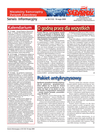 Serwis Informacyjny Kalendarium 11 maja – Zarząd Regionu Mazowsze NSZZ „S” przyjął Stanowisko dotyczące obchodów 4 czerwca, w którym stanowczo sprzeciwił się wykorzystywaniu 20-rocznicy częściowo wolnych wyborów do odwrócenia uwagi od prawdziwych problemów kraju. Ponadto Zarząd Regionu zwrócił się do kandydatów do Europarlamentu, którzy są członkami Związku, z wnioskiem o zgłoszenie w trybie wyborczym pozwu przeciwko Stefanowi Niesiołowskiemu. Pod koniec ubiegłego tygodnia poseł RP powiedział, że „Solidarność to teraz nie związkowcy, tylko przestępcy, którzy biją policję”. 12-13 maja – W Budapeszcie odbyło się finałowe spotkanie uczestników szkolenia „Informacja i konsultacja – drogą rozwoju dialogu”. W projekcie udział wzięły Związki Sektora Spożywczego – GMB Szkocja – EDOSZ Węgry – Sekretariat Przemysłu Spożywczego NSZZ Solidarność. Zadaniem uczestników, podczas trwania ostatnich trzech szkoleń było wypracowanie nowoczesnych działań w promocji dialogu i implementacja Dyrektywy 2002/14/WE na gruncie krajowym. 13 maja – Na spotkaniu organizacji zakładowych NSZZ „S” z terenu Gdańska i Sopotu rozmawiano na temat pakietu antykryzysowego, który został uzgodniony przez stronę związkową i organizacje pracodawców w marcu br. oraz na temat braku reakcji rządu na te propozycje. Wojciech Książek, członek prezydium Regionu Gdańskiego NSZZ „S” przedstawił plan uroczystości rocznicowych 4 czerwca, podkreślając, że rząd być może świadomie nie określił podmiotu, który ma koordynować organizowanie obchodów. „Solidarność” powołała komitet, w skład którego weszli przedstawiciele Gdańskiej Kurii, Komisji Krajowej „S” oraz Regionu Gdańskiego „S”. 13 maja – W Warszawie odbyło się Prezydium Komisji Krajowej NSZZ „S”, na którym postanowiono, że Związek weźmie udział, jako partner, w projekcie zatytułowanym „Lepsze antycypowanie i zarządzanie procesem restrukturyzacji oraz jego konsekwencjami społecznymi w regionie”. Celem projektu jest: sporządzenie bilansu procesów restrukturyzacyjnych w Europie, zidentyfikowanie innowacyjnych praktyk – szczególnie tych angażujących partnerów społecznych; opracowanie przewodnika dobrych praktyk adresowanego do partnerów społecznych; zorganizowanie dwóch seminariów europejskich, na których będą prezentowane rezultaty projektu. Serwis Informacyjny nr 20 (122) 18 maja 2009 nr 20 (122) 18 maja 2009 Dział Informacji KK [email protected] 80-855 Gdańsk, ul. Wały Piastowskie 24 O godną pracę dla wszystkich Prawie 350 tys. pracowników wzięło udział w protestach w Madrycie, Brukseli, Berlinie i Pradze w ramach Dni Akcji ogłoszonych przez Europejską Konfederacją Związków Zawodowych. NSZZ „Solidarność” przyłączył do protestu. W manifestacjach w Pradze i Berlinie wzięło udział ponad półtora tysiąca związkowców z „S”. Manifestanci pod hasłami: Wasza chciwość nasz kryzys domagali się nowej polityki społecznej w Unii Europejskiej, zdecydowanej walki z rosnącym w całej Europie bezrobociem oraz niedopuszczenia do powrotu finansowego kapitalizmu odpowiedzialnego za kryzys. Podczas wystąpienia na placu przewodniczący „S” Janusz Śniadek, pozdrowił wszystkich uczestników manifestacji a szczególnie przedstawicieli „S”, którzy z różnych regionów przyjechali do Pragi. - Pracownicy całej Europy walczą solidarnie w obronie zatrudnienia, o więcej miejsc pracy, o godną pracę. Domagamy się, aby ciężary kryzysu były solidarnie dźwigane przez wszystkich. Solidarnie – to znaczy, że musi w tym brać udział państwo i pracodawcy. Nie godzimy się na przerzucanie wszystkich ciężarów na pracowników – powiedział Janusz Śniadek. Do Berlina pojechało prawie 300 związkowców z „S”. Przewodniczył polskiej delegacji zastępca przewodniczącego KK NSZZ „S” Maciej Jankowski. Praga była jednym z czterech europejskich miast, w których EKZZ zorganizowała Europejskie Dni Akcji. Europejskie związki zawodowe domagają się nowego ładu społecznego, który daje pierwszeństwo sprawiedliwości społecznej, solidarności i większej liczby lepszych miejsc pracy. Ochrona socjalna musi być wzmocniona w celu uniknięcia wykluczenia społecznego. Związkowcy powiedzą „nie” dla nadużyć finansowych kapitalizmu, które prowadzą do rosnącej społecznej niesprawiedliwości i nierówności. EKZZ kładzie nacisk na konieczność zabezpieczenia nowego ładu dla pracowników, przy jednoczesnej publicznej kontroli towarzyszącej dotacjom publicznym dla banków. Postuluje o zwiększenie środków finansowych na szczeblu europejskim i krajowym na tworzenie pakietów ratunkowych dla pracowników. Sytuacja na europejskim rynku pracy wymaga m.in. tworzenia ww. pakietów uwzględniających ochronę miejsc pracy, zwiększenie zakresu szkoleń. Pakiet antykryzysowy Spotkanie prezydium komisji trójstronnej ds. społeczno – gospodarczych, które odbyło się 15 maja br. można nazwać sporym przełomem w stosunku do tego co się działo (a raczej nie działo) w poprzednich miesiącach – uważa Janusz Śniadek, przewodniczący KK NSZZ „S”. Oświadczenie Przewodniczącego KK NSZZ „Solidarność” Janusza Śniadka po spotkaniu Premiera z prezydium Trójstronnej Komisji ds. Społeczno-Gospodarczych „Cieszę się że tak potrzebne pracownikom i zakładom pracy wprowadzenie pakietu antykryzysowego, a szczególnie subsydiowania zatrudnienia staje się coraz bardziej realne. Dzisiejsze spotkanie prezydium komisji trójstronnej ds. społeczno-gospodarczych można nazwać sporym przełomem w stosunku do tego co się działo (a raczej nie działo) w poprzednich miesiącach. Być może rząd i Premier Tusk uświadomili sobie, że nie można już dłużej zwlekać z działaniami rzeczywiście ratującymi miejsca pracy i stąd obecność Pana Premiera na dzisiejszym prezydium T