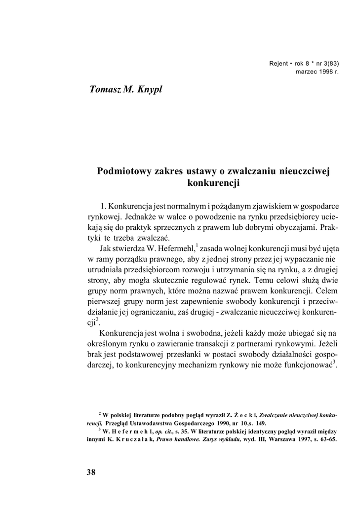 Rejent • rok 8 * nr 3(83) marzec 1998 r. Tomasz M. Knypl Podmiotowy zakres ustawy o zwalczaniu nieuczciwej konkurencji 1. Konkurencja jest normalnym i pożądanym zjawiskiem w gospodarce rynkowej. Jednakże w walce o powodzenie na rynku przedsiębiorcy uciekają się do praktyk sprzecznych z prawem lub dobrymi obyczajami. Praktyki te trzeba zwalczać. Jak stwierdza W. Hefermehl,1 zasada wolnej konkurencji musi być ujęta w ramy porządku prawnego, aby z jednej strony przez jej wypaczanie nie utrudniała przedsiębiorcom rozwoju i utrzymania się na rynku, a z drugiej strony, aby mogła skutecznie regulować rynek. Temu celowi służą dwie grupy norm prawnych, które można nazwać prawem konkurencji. Celem pierwszej grupy norm jest zapewnienie swobody konkurencji i przeciwdziałanie jej ograniczaniu, zaś drugiej - zwalczanie nieuczciwej konkurencji2. Konkurencja jest wolna i swobodna, jeżeli każdy może ubiegać się na określonym rynku o zawieranie transakcji z partnerami rynkowymi. Jeżeli brak jest podstawowej przesłanki w postaci swobody działalności gospodarczej, to konkurencyjny mechanizm rynkowy nie może funkcjonować3. 2 W polskiej literaturze podobny pogląd wyraził Z. Ż e c k i, Zwalczanie nieuczciwej konkurencji, Przegląd Ustawodawstwa Gospodarczego 1990, nr 10,s. 149. 3 W. H e f e r m e h 1, op. cit., s. 35. W literaturze polskiej identyczny pogląd wyraził między innymi K. K r u c z a ł a k, Prawo handlowe. Zarys wykładu, wyd. III, Warszawa 1997, s. 63-65. 38 Podmiotowy zakres ustawy o zwalczaniu nieuczciwej konkurencji Jak stwierdza R. Skubisz4, logiczną i konieczną konsekwencją zasady swobody podejmowania i prowadzenia działalności gospodarczej jest rywalizacja samodzielnych i niezależnych przedsiębiorców, zabiegających o zawarcie możliwie dużej liczby umów z nabywcami towarów i usług. Element rywalizacji podkreśla trafnie także T. Żyznowski, pisząc, że wolność gospodarcza i będąca jej wynikiem wolność konkurencji stwarza samodzielnym podmiotom gospodarczym możliwość rywalizowania na rynku. Również Sąd Najwyższy wyraził pogląd5, że konkurencja to rywalizacja co najmniej dwóch podmiotów w dążeniu do osiągnięcia tego samego celu, ale z jednoczesnym działaniem zmierzającym do uzyskania przewagi. Zdaniem K. Kruczalaka6, zasada konkurencji, będąca logiczną konsekwencją zasady równości i wolności gospodarczej, może ulec ograniczeniu lub być zakazaną, jeżeli wynika to z wyraźnego przepisu ustawowego albo wyraźnej woli stron danego stosunku zobowiązaniowego. Zakazu lub ograniczenia tej zasady nie można natomiast domniemywać ani wyprowadzać z innych przesłanek (np. zasad współżycia społecznego) niż przepis ustawy. Wł. Szpringer7 uważa konkurencję za otwarty dostęp do rynku na równych prawach dla wszystkich przedsiębiorców. 2. Z uwagi na potrzebę zwalczania nieuczciwych praktyk w przemyśle i handlu, dnia 6 listopada 1925 r. w Hadze przyjęto i włączono do konwencji paryskiej o ochronie własności przemysłowej z dnia 20 marca 1883 r.8 art. 10 bis9, który był zmieniany na konferencji w Londynie w 1934 r. i w Lizbonie w 1958 r. Polskę wiąże art. lObis w wersji przyjętej w Lizbonie10, zaś sam tekst konwencji w wersji sztokholmskiej z 1967 r.11 4 R . S k u b i s z , Polskie prawo o zwalczaniu nieuczciwej konkurencji (z perspektywy prawa Unii Europejskiej), Państwo i Prawo 1996, z. 4-5, s. 88. 5 Wyr 9 W. M i nast. 6 7 K. K r u c z a 1 a k, op. cit., s. 69. Wt. S z p r i n g e r , Łączenie przedsiębiorstw a regulacja antymonopolowa, Warszawa 1993, s. 11. s Dz.U. z 1975 r. Nr 9, poz. 52. 10 11 W. M a t y s i a k, op. cit., s. 17. Dz.U. z 1975 r. Nr 9, poz. 51 i 52. 39 Tomasz M. Knypl W rozumieniu art. 10 bis konwencji, aktem nieuczciwej konkurencji jest akt sprzeczny z uczciwymi zwyczajami w dziedzinie przemysłu i handlu. Wymienione w konwencji czyny nieuczciwej konkurencji powinny być zabronione12. Polska, jako uczestnik konwencji paryskiej, jest zobowiązana zapewnić obywatelom i osobom prawnym państw będących członkami Związku Paryskiego skuteczną ochronę prawną przed nieuczciwą konkurencją (art. 10 bis ust. 1). Zobowiązania te wykonała, przyjmując ustawy 0 zwalczaniu nieuczciwej konkurencji w 1926 r. i w 1993 r. Zdaniem Sądu Najwyższego, wyrażonym w wyroku z dnia 14 czerwca 1988 r.13, normy konwencji paryskiej o ochronie własności przemysłowej mogą być bezpośrednio stosowane przez powołane do tego organy i uznane za źródło prawa, obok innych źródeł prawa krajowego. Wydaje się, że zarówno cytowany już art. 10 bis ust. 1 konwencji, jak i art. 10 konwencji, zawierają raczej zobowiązania adresowane do państwuczestników konwencji jako podmiotów prawa międzynarodowego, które powinny podjąć odpowiednie kroki w sferze swego prawa wewnętrznego dla osiągnięcia celów konwencji, tzn. zapewnienia skutecznej ochrony własności przemysłowej. Artykuł 10 bis ust. 1 konwencji postanawia przecież: „Kraje (...) zobowiązane są zapewnić (...) skuteczną ochronę przeciwko nieuczciwej konkurencji", a artykuł 10: „Kraje (...) zobowiązują się zapewnić (...) właściwe środki prawne do skutecznego zwalczania wszelkich aktów wymienionych w art. 9, 10 i 10 bis". Te właściwe środki prawne to odpowiednie środki przewidziane przez akty prawa wewnętrznego. Dla realizacji celów konwencji i stworzenia takich środków prawnych Polska wydała specjalne przepisy. 3. Ustawa z dnia 16 kwietnia 1993 r. o zwalczaniu nieuczciwej konkurencji zapewnia wykonanie przez Polskę zobowiązań wynikających z traktatu między Polską a USA z 21 marca 1990 r. o stosunkach handlowych i gospodarczych14, umowy przejściowej dotyczącej handlu i spraw związanych z handlem z Europejską Wspólnotą Gospodarczą i Europejską Wspólnotą Węgla i Stali z dnia 16 grudnia 1991 r.15, a także z art. 68-69 Układu 12 Art. 10 bis ust. 3 konwencji. II CR 367/87. 14 Dz