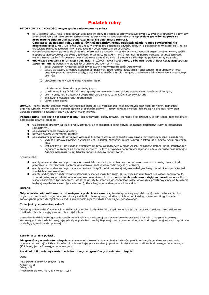 Podatek rolny ISTOTA ZMIAN I NOWOŚCI w tym tytule podatkowym to m.in.: od 1 stycznia 2003 roku opodatkowaniu podatkiem rolnym podlegają grunty sklasyfikowane w ewidencji gruntów i budynków jako użytki rolne lub jako grunty zadrzewione, zakrzewione na użytkach rolnych z wyjątkiem gruntów zajętych na prowadzenie działalności gospodarczej innej niż działalność rolnicza. Oznacza to, że podatek rolny zapłacą również podatnicy, którzy posiadają użytki rolne o powierzchni nie przekraczającej 1 ha . Do końca 2002 roku w przypadku posiadania użytków rolnych o powierzchni mniejszej od 1 ha ich właściciele byli opodatkowani innym podatkiem - podatkiem od nieruchomości. osoby fizyczne obowiązane są do składania informacji o gruntach na osoby prawne, jednostki organizacyjne, w tym, spółki nieposiadające osobowości prawnej, jednostki organizacyjne Agencji Własności Rolnej Skarbu Państwa, a także jednostki organizacyjne Lasów Państwowych obowiązane są składać do dnia 15 stycznia deklaracje na podatek rolny na druku, obowiązek składania informacji i deklaracji o których mowa wyżej dotyczy również podatników korzystających ze zwolnień i ulg na podstawie przepisów ustawy o podatku rolnym np.: szkół wyższych, wyższych szkół zawodowych oraz wyższych szkół wojskowych, szkół, placówek, zakładów kształcenia i placówek doskonalenia nauczycieli - publicznych i niepublicznych oraz organów prowadzących te szkoły, placówek i zakładów z tytułu zarządu, użytkowania lub użytkowania wieczystego gruntów, placówek naukowych Polskiej Akademii Nauk a także podatników którzy posiadają np.: użytki rolne klasy V, VI i VIz oraz grunty zadrzewione i zakrzewione ustanowione na użytkach rolnych, grunty orne, łąki i pastwiska objęte melioracją - w roku, w którym uprawy zostały zniszczone wskutek robót drenarskich, użytki ekologiczne UWAGA - jeżeli grunty stanowią współwłasność lub znajdują się w posiadaniu osób fizycznych oraz osób prawnych, jednostek organizacyjnych, w tym spółek nieposiadających osobowości prawnej - osoby fizyczne składają deklarację na podatek rolny oraz opłacają podatek na zasadach obowiązujących osoby prawne. Podatek rolny - kto staje się podatnikiem? - osoby fizyczne, osoby prawne, jednostki organizacyjne, w tym spółki, nieposiadające osobowości prawnej, będące: właścicielami gruntów (a jeżeli grunty znajdują się w posiadaniu samoistnym, obowiązek podatkowy ciąży na posiadaczu samoistnym), posiadaczami samoistnymi gruntów, użytkownikami wieczystymi gruntów, posiadaczami gruntów, stanowiących własność Skarbu Państwa lub jednostki samorządu terytorialnego, jeżeli posiadanie: wynika z umowy zawartej z właścicielem, Agencją Własności Rolnej Skarbu Państwa lub z innego tytułu prawnego albo jest bez tytułu prawnego z wyjątkiem gruntów wchodzących w skład Zasobu Własności Rolnej Skarbu Państwa lub będących w zarządzie Lasów Państwowych: w tym przypadku podatnikami są odpowiednio jednostki organizacyjne Agencji Własności Rolnej Skarbu Państwa i Lasów Państwowych ponadto jeżeli: grunty gospodarstwa rolnego zostały w całości lub w części wydzierżawione na podstawie umowy zawartej stosownie do przepisów o ubezpieczeniu społecznym rolników, podatnikiem podatku jest dzierżawca, grunty gospodarstwa rolnego zostały wniesione do spółdzielni produkcyjnej jako wkład gruntowy, podatnikiem podatku jest spółdzielnia produkcyjna, grunty podlegające opodatkowaniu stanowią współwłasność lub znajdują się w posiadaniu dwóch lub więcej podmiotów to stanowią odrębny przedmiot opodatkowania podatkiem rolnym , a obowiązek podatkowy ciąży solidarnie na wszystkich współwłaścicielach (posiadaczach) ale jeżeli grunty te stanowią gospodarstwo rolne, obowiązek podatkowy ciąży na tej osobie będącej współwłaścicielem (posiadaczem), która to gospodarstwo prowadzi w całości. UWAGA Odpowiedzialność solidarna za zobowiązania podatkowe oznacza, że wierzyciel (organ podatkowy) może żądać całości lub części uiszczenia należnego podatku od wszystkich dłużników łącznie, od kilku z nich lub od każdego z osobna. Uregulowanie zobowiązania przez któregokolwiek z dłużników zwalnia pozostałych z obowiązku podatkowego. Co to jest gospodarstwo rolne? Obszar gruntów sklasyfikowanych w ewidencji gruntów i budynków jako użytki rolne lub jako grunty zadrzewione, zakrzewione na użytkach rolnych, z wyjątkiem gruntów zajętych na prowadzenie działalności gospodarczej innej niż rolnicza - o łącznej powierzchni przekraczającej 1 ha lub 1 ha przeliczeniowy stanowiących własność lub znajdujących się w posiadaniu osoby fizycznej, osoby prawnej albo jednostki organizacyjnej w tym spółki nie posiadającej osobowości prawnej. Zasady ustalania podatku Dla gruntów gospodarstw rolnych podstawę opodatkowania stanowi liczba hektarów przeliczeniowych ustalona na podstawie powierzchni, rodzajów i klas użytków rolnych wynikających z ewidencji gruntów i budynków oraz zaliczenia do okręgu podatkowego (Kołobrzeg jest w II okręgu podatkowym). Przykład obliczenia wysokości podatku rolnego od gruntów gospodarstw rolnych: Dane: Powierzchnia gruntów ornych - 5 ha Klasa - III a Okręg - II Przelicznik dla ww. klasy II okręgu - 1,50 Średnia cena skupu żyta - 33,45 zł za 1 q Hektar przeliczeniowy = powierzchnia gruntów x przelicznik = 5 ha x 1,50 = 7,50 ha Podatek rolny za rok podatkowy od 1 ha przeliczeniowego gruntów gospodarstw rolnych wynosi równowartość pieniężną 2,5 q żyta, obliczoną wg średniej ceny skupu żyta za okres pierwszych trzech kwartałów roku poprzedzającego rok podatkowy. Zgodnie z komunikatem Prezesa GUS (MP z 2002 r. Nr 51, poz. 733) średnia cena skupu żyta, którą przyjmuje się do obliczenia podatku rolnego na 2003 rok wynosi 33,45 za 1 q. Obliczenie: 7,50 ha x równow