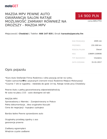 MAZDA MPV PEWNE AUTO GWARANCJA SALON RATAJE MOŻLIWOŚĆ ZAMIANY RÓWNIEŻ NA DROŻSZY - MAZDA MPV 14 900 PLN cena BRUTTO Miejscowość: Chodzież | Telefon: 666 147 835 | Email: [email protected] 2005 rok 231 000 km Diesel 136KM (100KW) Używany 31-01-2017 Opis pojazdu *Euro Auto Stefaniak Firma Rodzinna z silna pozycją od lat na rynku. *Salon samochod�łw używanych (remont trwa) Rodzinne Miejsce Motoryzacji *Czynne 7 dni w tygodniu - niedziela do godz 14 tej. Rataje rondo przy Chodzieży Pewne Auto z pełną gwarantowaną odpowiedzialnością Nr auta na placu 153 - auto dostępne od ręki MAZDA MPV Sprowadzony z Niemiec - Zarejestrowany w Polsce Pełna dokumentacja , dwa oryginalne kluczyki Cena do negocjacji - kupujesz zyskujesz Bardzo ładne Pewne sprawdzone auto Oryginalny przebieg zgodny z aso gwarancja prawna Zadbany egzemplarz Wnętrze czyste zadbane Wszystko sprawne SUPER WYPOSAŻENIE wszystko co w opisie plus inne dodatki Bardzo ładny wygląd Dołączyliśmy autentyczne zdjęcia + aktualny opis stworzony do oferty Technicznie auto bez zarzutu Dynamiczny oszczędny Gwarancja Mechaniczna + Prawna W skład gwarancji wchodzi Program Firmowy Pewne Auto Serwisowanie , auto zastępcze + Pakiet Korzyści Zdobyta wiedza i doświadczenie pozwalają nam na wystawienie fachowej opinii o danym samochodzie AUTO ROZLICZENIE - ZAMIANY - WYMIANY - Atrakcyjne warunki Możliwość pozostawienia swojego pojazdu w rozliczeniu RATY - KREDYT LEASING oferta kilku bank�łw jesteśmy AUTORYZOWANYM PARTNEREM Żaden szczeg�łłowy opis oraz zdjęcia nie zastąpią rzetelnej rozmowy Sprzedaż partnerska. Konsultacje , doradztwo Mateusz 666 - 147 835 Karol Stefaniak 533 -133 800 Serwis Zastępczy Obsługa techniczna 530 -700 020 Biura .Obsługa klienta formalności, rejestracja 533 165 165 Kontakt mailowy mile widziany Oferta w kraju średnio 150 samochod�łw + oddział w Niemczech Własny import - wsp�łłpraca Polsko - Niemiecka Samochody sprzedajemy z gwarancją wymiany, zamiany, odkupu. #Ponosimy pełną prawną odpowiedzialność za zamieszczone ogłoszenie# Kr�łtko o nas: Firma rodzinna. Pasjonaci kt�łrzy kochają swoją pracę. Pełni ciepła, uwielbiamy dzielić się z innymi swoją pozytywną energią. �€�Wierzymy w to co robimy i uwielbiamy kiedy efekty naszej pracy są widoczne. Najważniejszy dla nas jest uśmiech na twarzy klienta.�€� Ciekawostki z życia firmy ''nie samą pracą człowiek żyje'' Videoprezentacja: relacje na żywo, filmiki, teledysk itp nowinki ciekawostki Udzielamy się społecznie, bierzemy czynny udział w akcjach charytatywnych. Wspieramy Fundacje UKRYTE MARZENIA Wspieramy r�łżnego rodzaju szlachetne cele. Pomagamy sportowcom z powiatu Chodzieskiego. Wspieramy Zesp�łł piłki nożnej Polonia Chodzież Oldboje. Promujemy inne firmy. Organizujemy r�łżnego typy imprezy w regionie. Serdecznie Zapraszamy - kierownica wielofunkcyjna - swiatla przeciwmglowe - ESP - ABS - alufelgi - centr. zamek - el. lusterka - el. szyby - immobiliser - klimatyzacja automatyczna - komputer - nawigacja - poduszki - radio z CD - wsp. kierownicy