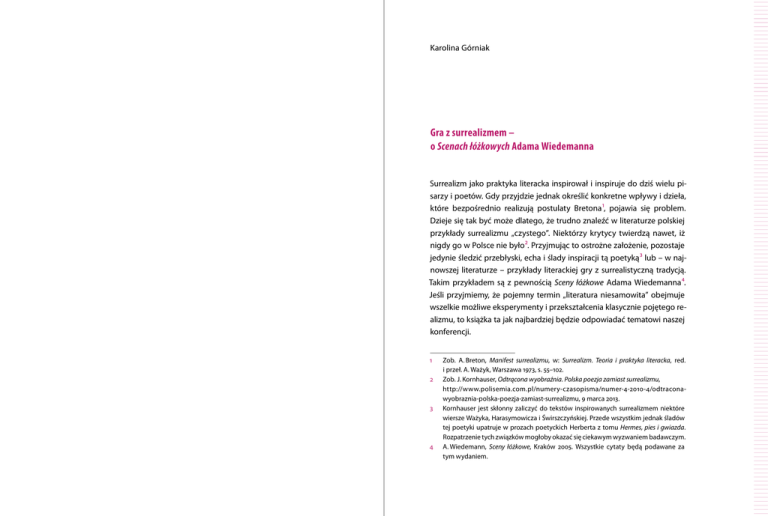 Karolina Górniak Gra z surrealizmem – o Scenach łóżkowych Adama Wiedemanna Surrealizm jako praktyka literacka inspirował i inspiruje do dziś wielu pisarzy i poetów. Gdy przyjdzie jednak określić konkretne wpływy i dzieła, które bezpośrednio realizują postulaty Bretona 1, pojawia się problem. Dzieje się tak być może dlatego, że trudno znaleźć w literaturze polskiej przykłady surrealizmu „czystego”. Niektórzy krytycy twierdzą nawet, iż nigdy go w Polsce nie było 2. Przyjmując to ostrożne założenie, pozostaje jedynie śledzić przebłyski, echa i ślady inspiracji tą poetyką 3 lub – w najnowszej literaturze – przykłady literackiej gry z surrealistyczną tradycją. Takim przykładem są z pewnością Sceny łóżkowe Adama Wiedemanna 4. Jeśli przyjmiemy, że pojemny termin „literatura niesamowita” obejmuje wszelkie możliwe eksperymenty i przekształcenia klasycznie pojętego realizmu, to książka ta jak najbardziej będzie odpowiadać tematowi naszej konferencji. Zob. A. Breton, Manifest surrealizmu, w: Surrealizm. Teoria i praktyka literacka, red. i przeł. A. Ważyk, Warszawa 1973, s. 55–102. 2 Zob. J. Kornhauser, Odtrącona wyobraźnia. Polska poezja zamiast surrealizmu, http://www.polisemia.com.pl/numery-czasopisma/numer-4-2010-4/odtraconawyobraznia-polska-poezja-zamiast-surrealizmu, 9 marca 2013. 3 Kornhauser jest skłonny zaliczyć do tekstów inspirowanych surrealizmem niektóre wiersze Ważyka, Harasymowicza i Świrszczyńskiej. Przede wszystkim jednak śladów tej poetyki upatruje w prozach poetyckich Herberta z tomu Hermes, pies i gwiazda. Rozpatrzenie tych związków mogłoby okazać się ciekawym wyzwaniem badawczym. 4 A. Wiedemann, Sceny łóżkowe, Kraków 2005. Wszystkie cytaty będą podawane za tym wydaniem. 1 80 | Karolina Górniak Sceny łóżkowe to zbiór krótkich opowiadań, wydany w roku 2005. Moim zdaniem książka ta została przeoczona przez krytykę. Nie licząc kilku recenzji w pismach i na portalach literackich 5, można powiedzieć, że utwór Wiedemanna nie wzbudził zainteresowania badaczy. Co ciekawe, w komentarzach na temat Scen łóżkowych często da się odczuć pewne zakłopotanie autorów, którzy nie do końca wiedzą, w jaki sposób mówić o tej książce i jak ją zakwalifikować – czy mówić przy jej okazji o hiperrealizmie, oniryzmie, surrealizmie, czy może minimalizmie, jak czyni to Michał Tabaczyński na łamach „Ha!artu” 6. Być może proza ta jest na tyle graniczna, że w jej omówieniach można zawrzeć wszystkie wymienione określenia. A może lepiej – by uniknąć terminologicznego nieładu – stworzyć dla niej osobną kategorię, jak na przykład czyni to Wojciech Kuczok, który używa terminu sure-realizm 7? Zbiór Wiedemanna, zgodnie z tytułem, zawiera opisy kilkudziesięciu snów, podzielone na rozdziały według lat i opatrzone datami dziennymi, a nawet indeksem osób pojawiających się w książce. Zdaniem Jakuba Kornhausera metoda, którą stosuje Wiedemann, czyli próba literackiego odwzorowania rzeczywistości snu, jest z gruntu surrealistyczna i odpowiada postulatom o wyzwoleniu wyobraźni i zwróceniu się ku światu marzeń sennych 8. Warto zaznaczyć, że sam surrealizm pojawia się w książce – w postaci Georges’a Bataille’a (który przez pewien czas sympatyzował ze środowiskiem Bretona) oraz przy okazji zjazdu surrealistów 9. Sam autor wykazywał zainteresowanie tą poetyką – w roku 2000 J. Kornhauser, dz. cyt.; I. Noszczyk, Sceny lekturowe, czyli o snach Adama Wiedemanna, http://biuroliterackie.pl/przystan/czytaj.php?site=140&co=txt_1074, 9 marca 2013; A. Pluszka, O „Scenach łóżkowych” Adama Wiedemanna, http://www.culture.pl/culture-pelna-tresc/-/eo_event_asset_publisher/Je7b/content/o-scenach-lozkowych-adama-wiedemanna, 9 marca 2013; M. Tabaczyński, Rozmiar ma znaczenie. Jeszcze kilka słów o minimalizmie, „Ha!art” 2005, nr 24, s. 31–35; M. Wilk, Literackie opanowanie rzeczywistości (łóżkowej), czyli śnienie (nie)oczywiste, „Pogranicza” 2006, nr 1, s. 98–99. 6 Zob. M. Tabaczyński, dz. cyt., s. 31–35. 7 Zob. I. Noszczyk, dz. cyt. 8 Zob. J. Kornhauser, dz. cyt. 9 Zob. A. Wiedemann, dz. cyt., s. 43, 138. 5 Gra z surrealizmem… | 81 zorganizował „Sesję oniryczną”, podczas której, jak notuje Adam Pluszka, swoje oniryczne teksty czytali m.in. Henryk Bereza, Kinga Dunin i Bohdan Zadura 10. Jednak André Breton zakwalifikowałby styl Wiedemanna jako realistyczny, a więc przeciętny, a nawet budzący obrzydzenie 11. Stałoby się tak dlatego, że utwór Wiedemanna realizuje rzadko spotykane, typowo reporterskie podejście do opisu snów, nie wyzbywając się przy tym charakterystycznej dla świata snów niesamowitości. Króluje tu jednak dbałość o szczegół, skrupulatność opisu, dokładność. Przyjechała do Polski królowa angielska z wnukami, w czasie przejazdu którąś z ulic warszawskich rzuciły się na nią trzy psy. Premier Mazowiecki posłał natychmiast na miejsce tego incydentu oddział SB z karabinami, psy ujrzawszy uzbrojonych funkcjonariuszy podbiegły do nich chcąc się bawić, ci jednak natychmiast otworzyli ogień i wystrzelali je bez litości. […] Ja tymczasem stoję z boczku i przyglądam się: zauważyli mnie, celują z karabinów. Rzucam się do ucieczki, oczywiście pod gradem kul […]. [Premier] siedzi właśnie przy stole z królową i moimi rodzicami. Wpadam, opowiadam, co mnie spotkało […]. (sen z 19 stycznia 1991) (s. 31) Powyższy fragment stanowi reprezentatywny przykład Wiedemannowskiego sposobu pisania o snach. Mamy tu nie tylko znane z ówczesnej rzeczywistości osoby publiczne, ale też rodziców autora, przedstawicieli „prywatnego świata”. Miejscem opisanych wydarzeń są również jak najbardziej obecne na jawie warszawskie ulice. Cała ta możliwa do zaistnienia na jawie senna fikcja osadzona jest jednak w sytuacji absurdalnego, śmiesznego, a jednocześnie g