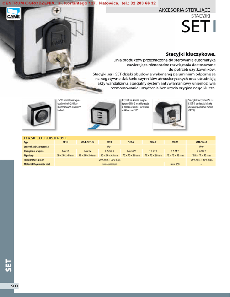 AKCESORIA STERUJĄCE STACYJKI AUTOMATYKA DO BRAM SET Stacyjki kluczykowe. Linia produktów przeznaczona do sterowania automatyką zawierająca różnorodne rozwiązania dostosowane do potrzeb użytkowników. Stacyjki serii SET dzięki obudowie wykonanej z aluminium odporne są na negatywne działanie czynników atmosferycznych oraz utrudniają akty wandalizmu. Specjalny system antywłamaniowy uniemożliwia rozmontowanie urządzenia bez użycia oryginalnego klucza. TSP01 umożliwia wprowadzenie do 250 kart zbliżeniowych o różnych kodach. Czytnik na klucze magnetyczne SEM-2 współpracuje z bardzo lekkimi i niewielkimi kluczami SEC. Stacyjki kluczykowe SET-J i SET-K posiadają klapkę chroniącą cylinder zamka (SET-J). DA N E T EC HNIC Z N E Typ SET-I SET-E/SET-EN Obciążenie wyjścia Wymiary SET-J SET-K SEM-2 TSPO1 SMA/SMA2 3 A 250 V 3 A 250 V 1 A 24 V 5 A 24 V 5 A 230 V 70 × 70 × 45 mm 70 × 70 × 86 mm 70 × 70 × 86 mm 70 × 70 × 43 mm IP54 Stopień zabezpieczenia 1 A 24 V 1 A 24 V 70 × 70 × 43 mm 70 × 70 × 86 mm Temperatura pracy IP40 -20°C min. +55°C max. Materiał/Pojemność kart stop aluminium 105 × 77 × 40 mm -30°C min. +40°C max. max. 250 – S E T: KOMPL E T N A S ERI A SET C EN Y NE T T O/ B RU T T O P L N 98 Stacyjka kluczykowa, wewnętrzna z cylindrem DIN. SET-I 105,00 / 129,15 Czytnik kart zbliżeniowych. Maksymalna pojemność 250 kart, zasilanie 12/24 V A.C./D.C. TSP01 270,00 / 332,10 Stacyjka kluczykowa, zewnętrzna z cylindrem DIN. SET-E 120,00 / 147,60 Karta zbliżeniowa 64 bity, 125 kHz z otworem na taśmę. TR KARTA1 9,50 / 11,69 Stacyjka kluczykowa, zewnętrzna w czarnej obudowie z cylindrem DIN. SET-EN 120,00 / 147,60 Karta zbliżeniowa 64 bity, 125 kHz. TR KARTA 9,50 / 11,69 Stacyjka kluczykowa, wewnętrzna z klapką osłaniającą cylinder. SET-K 85,00 / 104,55 Stacyjka kluczykowa, zewnętrzna z klapką osłaniającą cylinder. SET-J 95,00 / 116,85 Chip zbliżeniowy. TR BRELOK 9,50 / 11,69 Aluminiowa kolumna do stacyjki i czytnika o wysokości 1m. Kolor srebrny. CSS 160,00 / 196,80 Szklany transponder, można go zainstalować w pilotach ATOMO/TOP-432NA/TOP-434NA. TAG 35,00 / 43,05 Aluminiowa kolumna do stacyjki i czytnika o wysokości 1 m. Kolor czarny. CSSN 160,00 / 196,20 Czytnik na klucze magnetyczne. SEM-2 590,00 / 725,70 Klucz magnetyczny. SEC 15,00 / 18,45 Detektor jednokanałowy, zasilanie 24 V A.C./D.C. SMA 499,00 / 613,77 Detektor dwukanałowy, zasilanie 24 V A.C./D.C. SMA2 699,00 / 859,77