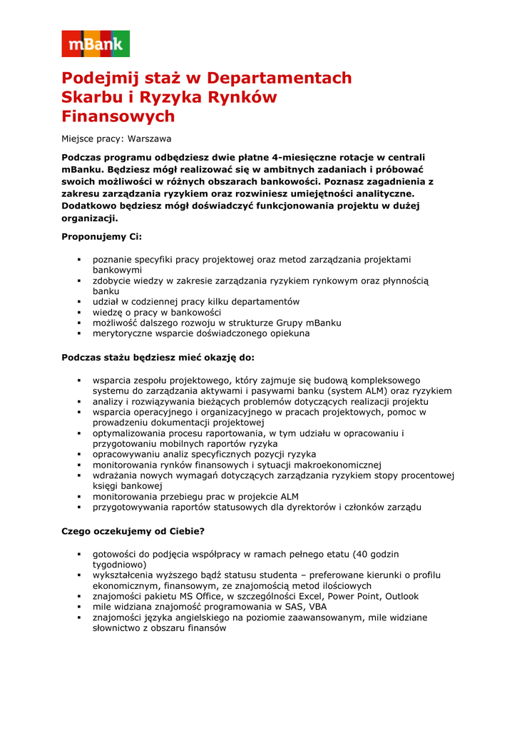 Podejmij staż w Departamentach Skarbu i Ryzyka Rynków Finansowych Miejsce pracy: Warszawa Podczas programu odbędziesz dwie płatne 4-miesięczne rotacje w centrali mBanku. Będziesz mógł realizować się w ambitnych zadaniach i próbować swoich możliwości w różnych obszarach bankowości. Poznasz zagadnienia z zakresu zarządzania ryzykiem oraz rozwiniesz umiejętności analityczne. Dodatkowo będziesz mógł doświadczyć funkcjonowania projektu w dużej organizacji. Proponujemy Ci: poznanie specyfiki pracy projektowej oraz metod zarządzania projektami bankowymi zdobycie wiedzy w zakresie zarządzania ryzykiem rynkowym oraz płynnością banku udział w codziennej pracy kilku departamentów wiedzę o pracy w bankowości możliwość dalszego rozwoju w strukturze Grupy mBanku merytoryczne wsparcie doświadczonego opiekuna Podczas stażu będziesz mieć okazję do: wsparcia zespołu projektowego, który zajmuje się budową kompleksowego systemu do zarządzania aktywami i pasywami banku (system ALM) oraz ryzykiem analizy i rozwiązywania bieżących problemów dotyczących realizacji projektu wsparcia operacyjnego i organizacyjnego w pracach projektowych, pomoc w prowadzeniu dokumentacji projektowej optymalizowania procesu raportowania, w tym udziału w opracowaniu i przygotowaniu mobilnych raportów ryzyka opracowywaniu analiz specyficznych pozycji ryzyka monitorowania rynków finansowych i sytuacji makroekonomicznej wdrażania nowych wymagań dotyczących zarządzania ryzykiem stopy procentowej księgi bankowej monitorowania przebiegu prac w projekcie ALM przygotowywania raportów statusowych dla dyrektorów i członków zarządu Czego oczekujemy od Ciebie? gotowości do podjęcia współpracy w ramach pełnego etatu (40 godzin tygodniowo) wykształcenia wyższego bądź statusu studenta – preferowane kierunki o profilu ekonomicznym, finansowym, ze znajomością metod ilościowych znajomości pakietu MS Office, w szczególności Excel, Power Point, Outlook mile widziana znajomość programowania w SAS, VBA znajomości języka angielskiego na poziomie zaawansowanym, mile widziane słownictwo z obszaru finansów W razie zainteresowania ofertą prosimy o przesłanie CV na adres mailowy: [email protected] w temacie wiadomości należy podać nazwę stanowiska. W treści CV należy dołączyć następującą klauzulę: „Wyrażam zgodę na przetwarzanie moich danych osobowych dla potrzeb niezbędnych do realizacji procesu rekrutacji na okres 6 miesięcy zgodnie z Ustawą z dnia 29.08.1997 r. o Ochronie Danych Osobowych (Dz. U. Nr 133 poz. 883.)”