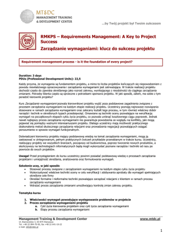 ...by Twój projekt był Twoim sukcesem RMKPS – Requirements Management: A Key to Project Success Zarządzanie wymaganiami: klucz do sukcesu projektu Requirement management process - is it the foundation of every project? Duration: 3 days PDUs (Professional Development Units): 22,5 Każdy przyzna, że wymagania są fundamentem projektu, a mimo to liczba projektów kończących się niepowodzeniem z powodu niewłaściwego opracowywania i zarządzania wymaganiami jest zatrważająca. W trakcie realizacji projektu dochodzi często do zjawiska określanego jako rozrost zakresu, wynikającego z niezdolności do ciągłego zarządzania zmianami. Potrzeby klienta często są sprzeczne z potrzebami sponsora projektu. W jaki sposób, zatem, ma sobie z tym poradzić kierownik projektu? Kurs Zarządzanie wymaganiami pozwala kierownikowi projektu wyjść poza podstawowe zagadnienia związane z procesem zarządzania wymaganiami na każdym etapie realizacji projektu. Uczestnicy poznają najnowsze rozwiązania stosowane w ramach zarządzania wymaganiami oraz zalecany kształt tego procesu, w tym również właściwy dobór narzędzi i technik w określonych typach przedsięwzięć. Omawiane są techniki oceny pozwalające na weryfikację wymagań na początkowych etapach cyklu życia projektu, co pozwala uniknąć kosztownego ciągu poprawek. Jednak nawet najlepszy proces zarządzania wymaganiami nie gwarantuje powodzenia ze względu na konflikty, jaki mogą pojawiać się pomiędzy ważnymi interesariuszami projektu. Dlatego uczestnicy mają możliwość praktycznego doskonalenia metod skutecznego zarządzania relacjami oraz prowadzenia negocjacji pozwalających osiągać porozumienie w sprawie wymagań funkcjonalnych. Doświadczeni kierownicy projektu mający podstawową wiedzę na temat zarządzania wymaganiami, mogą ją zastosować w zintegrowanym, pełnym praktycznych ćwiczeń przykładzie przerabianym w trakcie kursu. Uczestnicy, realizujący projekty we wszystkich branżach, począwszy od budownictwa, poprzez tworzenie nowych produktów, a skończywszy na technologiach informatycznych będą mogli wykorzystać poznane narzędzia i techniki od razu po powrocie do swych projektów. Uwaga! Przed przystąpieniem do kursu uczestnicy powinni posiadać podstawową wiedzę o procesach zarządzania projektami i umiejętność określania, analizowania oraz formułowania wymagań. Szkolenie uczy, w jaki sposób: Stosować procesy związane z zarządzaniem wymaganiami na każdym etapie cyklu życia projektu Wykorzystywać właściwe techniki oceny w celu weryfikacji i zdobywania aprobaty dla wymagań spełniających określone cele firmy Określać formalne i nieformalne techniki pozwalające zarządzać relacjami z klientem w ramach procesu zarządzania wymaganiami Wdrażać proces zarządzania zmianami umożliwiający kontrolę zmian zakresu projektu. Tematyka kursu 1. 2. Właściwości wymagań powodujące występowanie problemów w projekcie Proces zarządzania wymaganiami projektu a. Cykl życia kierowania projektem oraz cykl życia zarządzania wymaganiami b. Etapy procesu zarządzania wymaganiami Management Training & Development Center Ul. Klarnecistów 3, 02-875 Warszawa Tel. +48 22 894-70-50, fax +48 22 641-10-22 e-mail: [email protected] www.mtdc.pl 1 ...by Twój projekt był Twoim sukcesem RMKPS – Requirements Management: A Key to Project Success Zarządzanie wymaganiami: klucz do sukcesu projektu Requirement management process - is it the foundation of every project? c. Stałe i zmienne wymagania d. Normy organizacyjne 3. Ocena interesariuszy a. Identyfikacja i klasyfikacja b. Zarządzanie relacjami c. Plan komunikacji d. Czynniki ryzyka 4. Identyfikacja wymagań a. Przeprowadzenie analizy interesariuszy b. Rozpoznanie ryzyka i określenie strategii łagodzenia 5. Kluczowe czynniki sukcesu a. Macierz identyfikowalności b. Globalna analiza wymagań c. Plan testowania d. Standardy zarządzania wymaganiami 6. Formułowanie wymagań a. Wymagania funkcjonalne i niefunkcjonalne b. Wymagania globalne c. Ustalenie różnych punktów widzenia d. Narzędzia i techniki e. Standardy dokumentowania 7. Ocena i zatwierdzanie a. Wybór narzędzi i technik b. Ocena wymagań/ prototypu c. Ocena ryzyka d. Dokumentacja planu bazowego e. Przeglądy wewnętrzne i zewnętrzne 8. Zarządzanie zmianami a. Procedury oceny potrzeb projektu b. Określenie kryteriów kontroli zmian c. Wybór narzędzi i technik d. Kryteria sukcesu 9. Weryfikacja rezultatów projektu a. Kryteria akceptacyjne b. Wyniki testów projektu 10. Procedury zamknięcia Obszary wiedzy PMBOK® Guide: Zarządzanie zakresem projektu Zarządzanie jakością w projekcie Zarządzanie ryzykiem w projekcie Zarządzanie komunikacją w projekcie Management Training & Development Center Ul. Klarnecistów 3, 02-875 Warszawa Tel. +48 22 894-70-50, fax +48 22 641-10-22 e-mail: [email protected] www.mtdc.pl 2