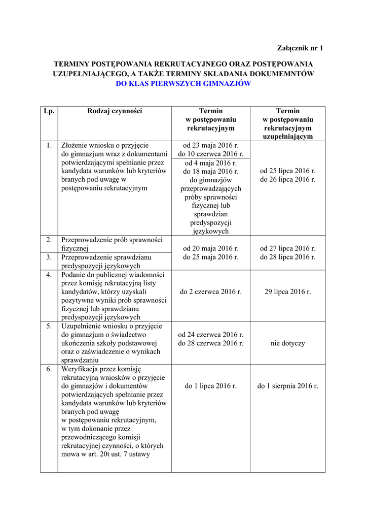 Załącznik nr 1 TERMINY POSTĘPOWANIA REKRUTACYJNEGO ORAZ POSTĘPOWANIA UZUPEŁNIAJĄCEGO, A TAKŻE TERMINY SKŁADANIA DOKUMEMNTÓW DO KLAS PIERWSZYCH GIMNAZJÓW Lp. Rodzaj czynności Termin w postępowaniu rekrutacyjnym 1. Złożenie wniosku o przyjęcie do gimnazjum wraz z dokumentami potwierdzającymi spełnianie przez kandydata warunków lub kryteriów branych pod uwagę w postępowaniu rekrutacyjnym od 23 maja 2016 r. do 10 czerwca 2016 r. od 4 maja 2016 r. do 18 maja 2016 r. do gimnazjów przeprowadzających próby sprawności fizycznej lub sprawdzian predyspozycji językowych 2. 3. 4. 5. 6. Przeprowadzenie prób sprawności fizycznej Przeprowadzenie sprawdzianu predyspozycji językowych Podanie do publicznej wiadomości przez komisję rekrutacyjną listy kandydatów, którzy uzyskali pozytywne wyniki prób sprawności fizycznej lub sprawdzianu predyspozycji językowych Uzupełnienie wniosku o przyjęcie do gimnazjum o świadectwo ukończenia szkoły podstawowej oraz o zaświadczenie o wynikach sprawdzaniu Weryfikacja przez komisję rekrutacyjną wniosków o przyjęcie do gimnazjów i dokumentów potwierdzających spełnianie przez kandydata warunków lub kryteriów branych pod uwagę w postępowaniu rekrutacyjnym, w tym dokonanie przez przewodniczącego komisji rekrutacyjnej czynności, o których mowa w art. 20t ust. 7 ustawy Termin w postępowaniu rekrutacyjnym uzupełniającym od 25 lipca 2016 r. do 26 lipca 2016 r. od 20 maja 2016 r. do 25 maja 2016 r. od 27 lipca 2016 r. do 28 lipca 2016 r. do 2 czerwca 2016 r. 29 lipca 2016 r. od 24 czerwca 2016 r. do 28 czerwca 2016 r. nie dotyczy do 1 lipca 2016 r. do 1 sierpnia 2016 r. 7. 8. 9. Podanie do publicznej wiadomości przez komisję rekrutacyjną listy kandydatów zakwalifikowanych i kandydatów niezakwalifikowanych Potwierdzenie przez rodzica kandydata woli przyjęcia w postaci przedłożenia oryginału świadectwa ukończenia szkoły podstawowej i oryginału zaświadczenia o wynikach sprawdzaniu, o ile nie zostały one złożone w uzupełnieniu wniosku o przyjęcie do gimnazjum Podanie do publicznej wiadomości przez komisję rekrutacyjną listy kandydatów przyjętych i kandydatów nieprzyjętych do 18 sierpnia 2016 r. do 18 lipca 2016 r. (jeden dzień po rozpatrzeniu odwołania od rozstrzygnięcia komisji rekrutacyjnej; termin wynika z art. 20zc ustawy o systemie oświaty) do 20 lipca 2016 r. do 22 sierpnia 2016 r. do 22 lipca 2016 r. do 24 sierpnia 2016 r.