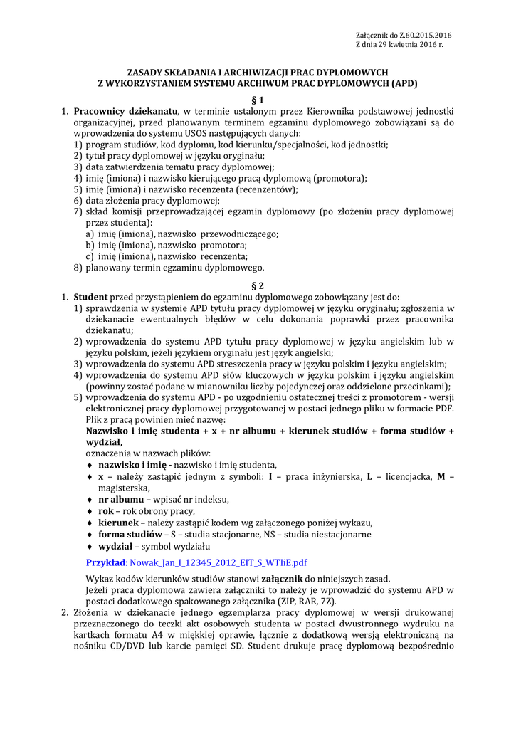 Załącznik do Z.60.2015.2016 Z dnia 29 kwietnia 2016 r. ZASADY SKŁADANIA I ARCHIWIZACJI PRAC DYPLOMOWYCH Z WYKORZYSTANIEM SYSTEMU ARCHIWUM PRAC DYPLOMOWYCH (APD) §1 1. Pracownicy dziekanatu, w terminie ustalonym przez Kierownika podstawowej jednostki organizacyjnej, przed planowanym terminem egzaminu dyplomowego zobowiązani są do wprowadzenia do systemu USOS następujących danych: 1) program studiów, kod dyplomu, kod kierunku/specjalności, kod jednostki; 2) tytuł pracy dyplomowej w języku oryginału; 3) data zatwierdzenia tematu pracy dyplomowej; 4) imię (imiona) i nazwisko kierującego pracą dyplomową (promotora); 5) imię (imiona) i nazwisko recenzenta (recenzentów); 6) data złożenia pracy dyplomowej; 7) skład komisji przeprowadzającej egzamin dyplomowy (po złożeniu pracy dyplomowej przez studenta): a) imię (imiona), nazwisko przewodniczącego; b) imię (imiona), nazwisko promotora; c) imię (imiona), nazwisko recenzenta; 8) planowany termin egzaminu dyplomowego. §2 1. Student przed przystąpieniem do egzaminu dyplomowego zobowiązany jest do: 1) sprawdzenia w systemie APD tytułu pracy dyplomowej w języku oryginału; zgłoszenia w dziekanacie ewentualnych błędów w celu dokonania poprawki przez pracownika dziekanatu; 2) wprowadzenia do systemu APD tytułu pracy dyplomowej w języku angielskim lub w języku polskim, jeżeli językiem oryginału jest język angielski; 3) wprowadzenia do systemu APD streszczenia pracy w języku polskim i języku angielskim; 4) wprowadzenia do systemu APD słów kluczowych w języku polskim i języku angielskim (powinny zostać podane w mianowniku liczby pojedynczej oraz oddzielone przecinkami); 5) wprowadzenia do systemu APD - po uzgodnieniu ostatecznej treści z promotorem - wersji elektronicznej pracy dyplomowej przygotowanej w postaci jednego pliku w formacie PDF. Plik z pracą powinien mieć nazwę: Nazwisko i imię studenta + x + nr albumu + kierunek studiów + forma studiów + wydział, oznaczenia w nazwach plików: nazwisko i imię - nazwisko i imię studenta, x – należy zastąpić jednym z symboli: I – praca inżynierska, L – licencjacka, M – magisterska, nr albumu – wpisać nr indeksu, rok – rok obrony pracy, kierunek – należy zastąpić kodem wg załączonego poniżej wykazu, forma studiów – S – studia stacjonarne, NS – studia niestacjonarne wydział – symbol wydziału Przykład: Nowak_Jan_I_12345_2012_EIT_S_WTIiE.pdf Wykaz kodów kierunków studiów stanowi załącznik do niniejszych zasad. Jeżeli praca dyplomowa zawiera załączniki to należy je wprowadzić do systemu APD w postaci dodatkowego spakowanego załącznika (ZIP, RAR, 7Z). 2. Złożenia w dziekanacie jednego egzemplarza pracy dyplomowej w wersji drukowanej przeznaczonego do teczki akt osobowych studenta w postaci dwustronnego wydruku na kartkach formatu A4 w miękkiej oprawie, łącznie z dodatkową wersją elektroniczną na nośniku CD/DVD lub karcie pamięci SD. Student drukuje pracę dyplomową bezpośrednio z systemu APD, po uzyskaniu w systemie APD akceptacji kierującego pracą (promotora). Praca dyplomowa wydrukowana z systemu APD zawiera unikatowe numery kontrolne. 3. Złożenia dodatkowej dokumentacji wynikającej ze specyfiki studiów na określonym kierunku, zgodnie z obowiązującymi na danym wydziale zasadami dyplomowania. 4. Wraz z pracą dyplomową student składa: 1) oświadczenie o oryginalności pracy dyplomowej i samodzielności w jej napisaniu oraz o nienaruszeniu praw autorskich; 2) oświadczenie o przekazaniu Uniwersytetowi prawa do eksploatacji pracy dyplomowej w systemie antyplagiatowym. Oświadczenia te muszą być podpisane i trwale złączone z pracą dyplomową. §3 1. Kierownik podstawowej jednostki organizacyjnej: 1) wyznacza recenzenta; 2) w przypadku negatywnej oceny pracy dyplomowej wyznacza kolejnego recenzenta; 3) w przypadku przekroczenia, chociaż jednego współczynnika prawdopodobieństwa lub wystąpienia „alertu”, po otrzymaniu Rozszerzonego Raportu Podobieństwa oraz Protokołu kontroli oryginalności pracy dyplomowej wraz z opinią podejmuje decyzję o sposobie dalszego postępowania; 4) po wypełnieniu wymogów określonych w regulaminie studiów zatwierdza skład komisji i termin egzaminu dyplomowego. §4 1. Promotor, w terminie określonym przez Kierownika podstawowej jednostki organizacyjnej, zobowiązany jest do: 1) sprawdzenia poprawności danych wprowadzonych przez studenta do systemu APD; 2) zatwierdzenia danych wprowadzonych przez studenta; 3) przeprowadzenia kontroli antyplagiatowej pracy dyplomowej za pomocą systemu APD; każda praca dyplomowa sprawdzana jest w systemie antyplagiatowym tylko raz; w wyjątkowych przypadkach ponowne przekazanie pracy przez promotora wymaga pisemnej zgody Kierownika podstawowej jednostki organizacyjnej; 4) wypełnienia i zatwierdzenia w systemie APD formularza oceny pracy dyplomowej (recenzja pracy dyplomowej); 5) złożenia w dziekanacie wydrukowanej z systemu APD i podpisanej recenzji; 6) złożenia w dziekanacie wydrukowanej z APD skróconej wersji Raportu Podobieństwa z kontroli antyplagiatowej (a w przypadku przekroczenia odpowiednich współczynników Rozszerzonego Raportu Podobieństwa) oraz wypełnionego i podpisanego Protokołu kontroli oryginalności pracy dyplomowej wraz z opinią. §5 1. Recenzent, w terminie określonym przez Kierownika podstawowej jednostki organizacyjnej, zobowiązany jest do: 1) wypełnienia i zatwierdzenia w systemie APD formularza oceny pracy dyplomowej (recenzja pracy dyplomowej); 2) złożenia w dziekanacie wydrukowanej z systemu APD i podpisanej recenzji. §6 1. Pracownik dziekanatu, w terminie określonym przez Kierownika podstawowej jednostki organizacyjnej, przed przystąpieniem studenta do egzaminu dyplomowego zobowiązany jest sprawdzić czy: 1) praca dyplomowa studenta i dane, o których mowa w §2 ust. 1 zostały wprowadzone do systemu APD; 2) praca dyplomowa wprowadzona przez studenta do systemu A