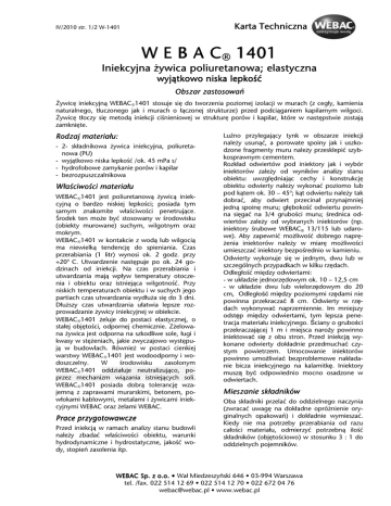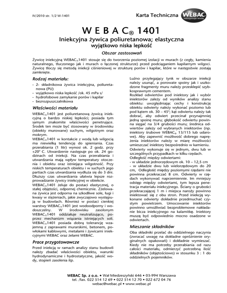 Karta Tech Techniczna IV/2010 str. 1/2 W-1401 W E B A C 1401 Iniekcyjna ż ywica poliuretanowa; elastyczna wyją wyjątkowo niska lepkość lepkość Obszar zastosowań zastosowa ń Żywicę iniekcyjną WEBAC1401 stosuje się do tworzenia poziomej izolacji w murach (z cegły, kamienia naturalnego, tłuczonego jak i murach o łączonej strukturze) przed podciąganiem kapilarnym wilgoci. Żywicę tłoczy się metodą iniekcji ciśnieniowej w strukturę porów i kapilar, które w następstwie zostają zamknięte. Rodzaj materiał materia łu: - 2- składnikowa żywica iniekcyjna, poliuretanowa (PU) - wyjątkowo niska lepkość /ok. 45 mPa s/ - hydrofobowe zamykanie porów i kapilar - bezrozpuszczalnikowa Wła ś ciwoś ciwo ś ci materiał materia łu WEBAC1401 jest poliuretanową żywicą iniekcyjną o bardzo niskiej lepkości; posiada tym samym znakomite właściwości penetrujące. Środek ten może być stosowany w środowisku (obiekty murowane) suchym, wilgotnym oraz mokrym. WEBAC1401 w kontakcie z wodą lub wilgocią ma niewielką tendencję do spieniania. Czas przerabiania (1 litr) wynosi ok. 2 godz. przy +20o C. Utwardzenie następuje po ok. 24 godzinach od iniekcji. Na czas przerabiania i utwardzania mają wpływ temperatury otoczenia i obiektu oraz istniejąca wilgotność. Przy niskich temperaturach obiektu i w suchych jego partiach czas utwardzania wydłuża się do 3 dni. Dłuższy czas utwardzania ułatwia lepsze rozprowadzanie żywicy iniekcyjnej w obiekcie. WEBAC1401 żeluje do postaci elastycznej, o stałej objętości, odpornej chemicznie. Zżelowana żywica jest odporna na szkodliwe sole, ługi i kwasy w stężeniach, jakie zwyczajowo występują w budowlach. Również w postaci cienkiej warstwy WEBAC1401 jest wodoodporny i wodoszczelny. W środowisku zasolonym WEBAC1401 oddziałuje neutralizująco, poprzez mechanizm wiązania istniejących soli. WEBAC1401 posiada dobrą tolerancję wzajemną z zaprawami murarskimi, betonem, powłokami kablowymi, metalami i żywicami iniekcyjnymi WEBAC oraz żelami WEBAC. Prace przygotowawcze Przed iniekcją w ramach analizy stanu budowli należy zbadać właściwości obiektu, warunki hydrodynamiczne i hydrostatyczne, jakość wody, stopień zasolenia itp. Luźno przylegający tynk w obszarze iniekcji należy usunąć, a porowate spoiny jak i uszkodzone fragmenty muru należy przesklepić szybkosprawnym cementem. Rozkład odwiertów pod iniektory jak i wybór iniektorów zależy od wyników analizy stanu obiektu: uwzględniając cechy i konstrukcję obiektu odwierty należy wykonać poziomo lub pod kątem ok. 30 – 45o; kąt odwiertu należy tak dobrać, aby odwiert przecinał przynajmniej jedną spoinę muru; głębokość odwiertu powinna sięgać na 3/4 grubości muru; średnica odwiertów zależy od wybranych iniektorów (np. iniektory śrubowe WEBAC® 13/115 lub udarowe). Aby zapewnić możliwość dobrego naprężenia iniektorów należy w miarę możliwości umieszczać iniektory bezpośrednio w kamieniu. Odwierty wykonuje się w jednym, dwu lub w szczególnych przypadkach w kilku rzędach. Odległość między odwiertami: - w układzie jednorzędowym ok. 10 – 12,5 cm - w układzie dwu lub wielorzędowym do 20 cm, Odległość między poziomymi rzędami nie powinna przekraczać 8 cm. Odwierty w rzędach wykonywać naprzemiennie. Im mniejszy odstęp między odwiertami, tym lepsza penetracja materiału iniekcyjnego. Ściany o grubości przekraczającej 1 m i miejsca naroży powinno iniektować się z obu stron. Przed iniekcją wykonane odwierty dokładnie przedmuchać czystym powietrzem. Umocowanie iniektorów powinno umożliwiać bezproblemowe nakładanie bicza iniekcyjnego na kalamitkę. Iniektory muszą być odpowiednio mocno osadzone w odwiertach. Mieszanie skł składników Oba składniki przelać do oddzielnego naczynia (zwracać uwagę na dokładne opróżnienie oryginalnych opakowań) i dokładnie wymieszać. Kiedy nie ma potrzeby przerabiania od razu całości materiału, odmierzyć potrzebną ilość składników (objętościowo) w stosunku 3 : 1 do oddzielnych pojemników. WEBAC Sp. z o.o. • Wał Miedzeszyński 646 • 03-994 Warszawa tel. /fax. 022 514 12 69 • 022 514 12 70 • 022 672 04 76 [email protected] • www.webac.pl Karta Tech Techniczna IV/2010 str. 2/2 W-1401 Wymieszane składniki przelać do zasobnika pompy i krótko mieszać; materiał przerabiać zgodnie z podanym czasem przerabiania. Prace iniekcyjne WEBAC®1401 przerabia się pompą 1- składnikową (patrz pompy iniekcyjne WEBAC®). Należy upewnić się, czy poza materiałem WEBAC®1401 nie tłoczy się resztek żadnego innego medium lub rozpuszczalnika. Iniekcję przeprowadzać ciśnieniem ciągłym, dostosowanym do cech budowli (iniekcja niskociśnieniowa poniżej 10 bar; przy iniekcji wysokociśnieniowej rozpoczynać ciśnieniem ok. 20 bar). Jeśli w czasie iniekcji ciśnienie robocze nie wzrośnie, należy zbadać czy w okolicy rysy nie występują przecieki lub czy spoiny nie są luźne, czy też nie występują inne puste miejsca. W takim przypadku należy przerwać iniekcję i podjąć odpowiednie działania. Iniekcję przeprowadza się tak długo, aż zaobserwujemy wyciek żywicy z iniektorów sąsiadujących lub w ich pobliżu, co oznacza wysycenie spoin lub utworzenie równomiernej poziomej przegrody. Zużycie materiału zależy od objętości pustek i miejsc do wypełnień w danym murze. Każdy mur może mieć różne parametry zużycia materiału iniekcyjnego, zależne od konstrukcji, objętości porów, stanu zawilgocenia, stanu iniektowanego obiektu oraz rozkładu iniektorów i ich średnicy. Zasada ogólna: ok. 1 kg/mb na każ każ de 10 10 cm gruboś gruboś ci ś ciany. Wskazówka: Temperatura własna pompy może skrócić czas żelowania materiału. Jeżeli temperatura materiału z zasobniku pompy zwiększy się, należy go bezzwłocznie przerobić lub usunąć z zasobnika. Prace koń ko ńcowe Po stwardnieniu żywicy (ok. 24 go