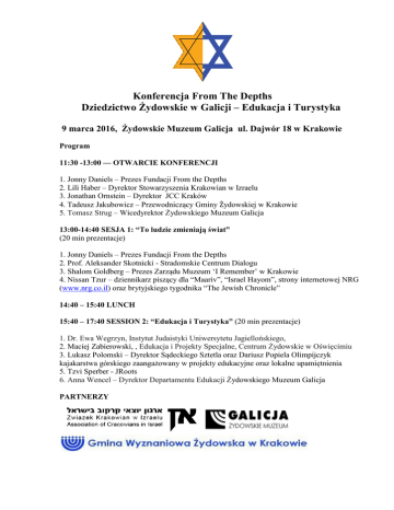 Konferencja From The Depths Dziedzictwo Żydowskie Ż w Galicji – Edukacja i Turystyka 9 marca 2016, Żydowskie Muzeum Galicja ul. Dajwór 18 w Krakowie Program 11:30 -13:00 — OTWARCIE KONFERENCJI 1. Jonny Daniels – Prezes Fundacji From the Depths 2. Lili Haber – Dyrektor Stowarzyszenia Krakowian w Izraelu 3. Jonathan Ornstein – Dyrektor JCC Kraków 4. Tadeusz Jakubowicz – Przewodniczący Przewodniczą Gminy Żydowskiej w Krakowie 5. Tomasz Strug – Wicedyrektor Żydowskiego Ż Muzeum Galicja 13:00-14:40 SESJA 1: “To To ludzie zmieniają śświat” (20 min prezentacje) 1. Jonny Daniels – Prezes Fundacji From the Depths 2. Prof. Aleksander Skotnicki - Stradomskie Centrum Dialogu 3. Shalom Goldberg – Prezes Zarządu Zarzą Muzeum ‘I Remember’ w Krakowie 4. Nissan Tzur – dziennikarz piszący piszą dla “Maariv”, “Israel Hayom”, strony internetowej NRG (www.nrg.co.il) oraz brytyjskiego tygodnika “The Jewish Chronicle” 14:40 – 15:40 LUNCH 15:40 – 17:40 SESSION 2: “Edukacja i Turystyka” (20 min prezentacje) prezentacje 1. Dr. Ewa Wegrzyn, Instytut Judaistyki Uniwersytetu Jagiellońskiego,, 2. Maciej Zabierowski, , Edukacja i Projekty Specjalne, Specjalne Centrum Żydowskie w Oświęcimiu Oś ę 3. Lukasz Polomski – Dyrektor Sądeckiego Sztetla oraz Dariusz Popiela Olimpijczyk kajakarstwa górskiego zaangażowany zaangażżowany w projekty edukacyjne oraz lokalne upamiętnienia upamięę 5. Tzvi Sperber - JRoots 6. Anna Wencel – Dyrektor Departamentu Edukacji Żydowskiego Muzeum Galicja PARTNERZY