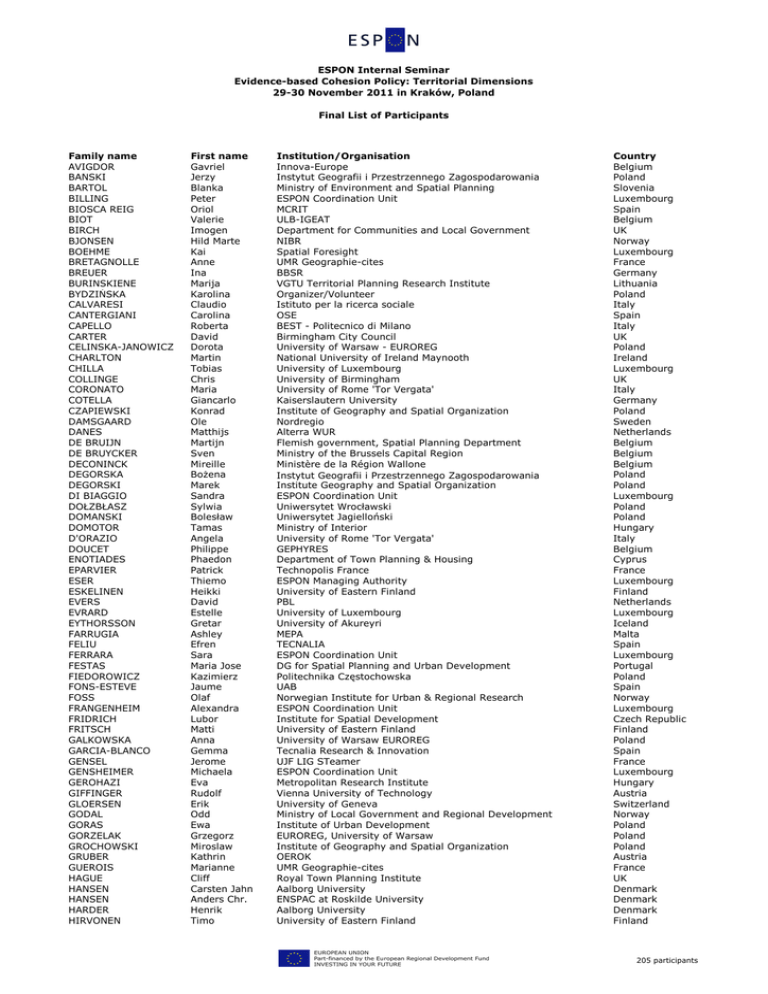 ESPON Internal Seminar Evidence-based Cohesion Policy: Territorial Dimensions 29-30 November 2011 in Kraków, Poland Final List of Participants Family name AVIGDOR BAŃSKI BARTOL BILLING BIOSCA REIG BIOT BIRCH BJONSEN BOEHME BRETAGNOLLE BREUER BURINSKIENE BYDZIŃSKA CALVARESI CANTERGIANI CAPELLO CARTER CELINSKA-JANOWICZ CHARLTON CHILLA COLLINGE CORONATO COTELLA CZAPIEWSKI DAMSGAARD DANES DE BRUIJN DE BRUYCKER DECONINCK DEGÓRSKA DEGORSKI DI BIAGGIO DOŁZBŁASZ DOMAŃSKI DOMOTOR D'ORAZIO DOUCET ENOTIADES EPARVIER ESER ESKELINEN EVERS EVRARD EYTHORSSON FARRUGIA FELIU FERRARA FESTAS FIEDOROWICZ FONS-ESTEVE FOSS FRANGENHEIM FRIDRICH FRITSCH GALKOWSKA GARCIA-BLANCO GENSEL GENSHEIMER GEROHAZI GIFFINGER GLOERSEN GODAL GORAS GORZELAK GROCHOWSKI GRUBER GUEROIS HAGUE HANSEN HANSEN HARDER HIRVONEN First name Gavriel Jerzy Blanka Peter Oriol Valerie Imogen Hild Marte Kai Anne Ina Marija Karolina Claudio Carolina Roberta David Dorota Martin Tobias Chris Maria Giancarlo Konrad Ole Matthijs Martijn Sven Mireille Bożena Marek Sandra Sylwia Bolesław Tamas Angela Philippe Phaedon Patrick Thiemo Heikki David Estelle Gretar Ashley Efren Sara Maria Jose Kazimierz Jaume Olaf Alexandra Lubor Matti Anna Gemma Jerome Michaela Eva Rudolf Erik Odd Ewa Grzegorz Miroslaw Kathrin Marianne Cliff Carsten Jahn Anders Chr. Henrik Timo Institution/Organisation Innova-Europe Instytut Geografii i Przestrzennego Zagospodarowania Ministry of Environment and Spatial Planning ESPON Coordination Unit MCRIT ULB-IGEAT Department for Communities and Local Government NIBR Spatial Foresight UMR Geographie-cites BBSR VGTU Territorial Planning Research Institute Organizer/Volunteer Istituto per la ricerca sociale OSE BEST - Politecnico di Milano Birmingham City Council University of Warsaw - EUROREG National University of Ireland Maynooth University of Luxembourg University of Birmingham University of Rome 'Tor Vergata' Kaiserslautern University Institute of Geography and Spatial Organization Nordregio Alterra WUR Flemish government, Spatial Planning Department Ministry of the Brussels Capital Region Ministère de la Région Wallone Instytut Geografii i Przestrzennego Zagospodarowania Institute Geography and Spatial Organization ESPON Coordination Unit Uniwersytet Wrocławski Uniwersytet Jagielloński Ministry of Interior University of Rome 'Tor Vergata' GEPHYRES Department of Town Planning & Housing Technopolis France ESPON Managing Authority University of Eastern Finland PBL University of Luxembourg University of Akureyri MEPA TECNALIA ESPON Coordination Unit DG for Spatial Planning and Urban Development Politechnika Częstochowska UAB Norwegian Institute for Urban & Regional Research ESPON Coordination Unit Institute for Spatial Development University of Eastern Finland University of Warsaw EUROREG Tecnalia Research & Innovation UJF LIG STeamer ESPON Coordination Unit Metropolitan Research Institute Vienna University of Technology University of Geneva Ministry of Local Government and Regional Development Institute of Urban Development EUROREG, University of Warsaw Institute of Geography and Spatial Organization OEROK UMR Geographie-cites Royal Town Planning Institute Aalborg University ENSPAC at Roskilde University Aalborg University University of Eastern Finland Country Belgium Poland Slovenia Luxembourg Spain Belgium UK Norway Luxembourg France Germany Lithuania Poland Italy Spain Italy UK Poland Ireland Luxembourg UK Italy Germany Poland Sweden Netherlands Belgium Belgium Belgium Poland Poland Luxembourg Poland Poland Hungary Italy Belgium Cyprus France Luxembourg Finland Netherlands Luxembourg Iceland Malta Spain Luxembourg Portugal Poland Spain Norway Luxembourg Czech Republic Finland Poland Spain France Luxembourg Hungary Austria Switzerland Norway Poland Poland Poland Austria France UK Denmark Denmark Denmark Finland 205 participants ESPON Internal Seminar Evidence-based Cohesion Policy: Territorial Dimensions 29-30 November 2011 in Kraków, Poland Final List of Participants HOFFMANN HUBEROVA HUMER JANCIC JOHANSEN JOHANSSON KAROLCZUK KELLENBERGER KEMPER KEARNEY KOMORNICKI KONSTANTOPOULOU KORCELLI-OLEJNICZAK KOZAK KUUSIK KYVELOU LABORDE LACHOWSKI LAMBERT LAZAUSKAITE LE RUBRUS LEIBERT LEJINS LENZI LESCINSKA LINDBLAD LIOTARD LOIS LOSKOVA LUDLOW LUPPRIAN MAROT MARQUES DA COSTA MATOUSKOVA MAZIAREK MEHLBYE MICHAL MIERZEJEWSKA MILEGO MINNIBERGER MITOVA MONFORT MORGAN MORI MUCHER MURGU NEMETH NEUSE NIELSEN NIKODEMUSA NOWOROL NURMI OLECHNICKA PACCHI PAIN PALENBERG PARKINSON PASTOR PAUL PAVARD PEETERS PEREZ-SOBA PETER PETRUZZI PIERIK PLOSZAJ PONNIKAS POPOVA PRENGER-BERNINGHOF PREZIOSO RACHLEWICZ RADVANSKI RAGNARSSON Csilla Jana Alois Margarita Steinar Mats Jakub Marco Denise Kieran Tomasz Mathilde Ewa Marek Maila Stella Martine Maciej Nicolas Dovile Benoit Tim Girts Camilla Zane Sverker Martine Ruben Camilo Elena David Eva Naja Eduarda Kamila Szlzepan Peter Didier Lidia Roger Christina Emiliya Philippe Selyf Francois Sander Georgiana Sarolta Ann-Gritt Marc Alda Aleksander Juha Agnieszka Carolina Kathryn Dorothea Michael Rudolf Valeria Antonin Didier Marta Szolt Pierina Silvia Adam Jouni Raina Kathrin Maria Marta Adam Arni VATI Ministry of Regional Development University of Vienna Ministry of Environment and Spatial Planning and energy NIBR KTH, Division of Urban and Regional Studies Organizer/Volunteer Swiss Federal Office for Spatial Development BBR ESPON Coordination Unit Polish Academy of Sciences Ministry for Development, Competitiveness and Shipping Institute of Geography and Spatial Organization Uniwersytet Warszawski - EUROREG Ministry of Interior Panteion University CNRS Organizer UMS RIATE VGTU Territorial Planning Research Institute UJF LIG STeamer Leibniz Institute for Regional Geography State Regional Development Agency BEST - Politecnico di Milano State Regional Development Agency Ministry of Enterprise, Energy and Communications IAU-IDF Universidade de Santiago de Compostela Institute for Spatial Development UWE blue! a