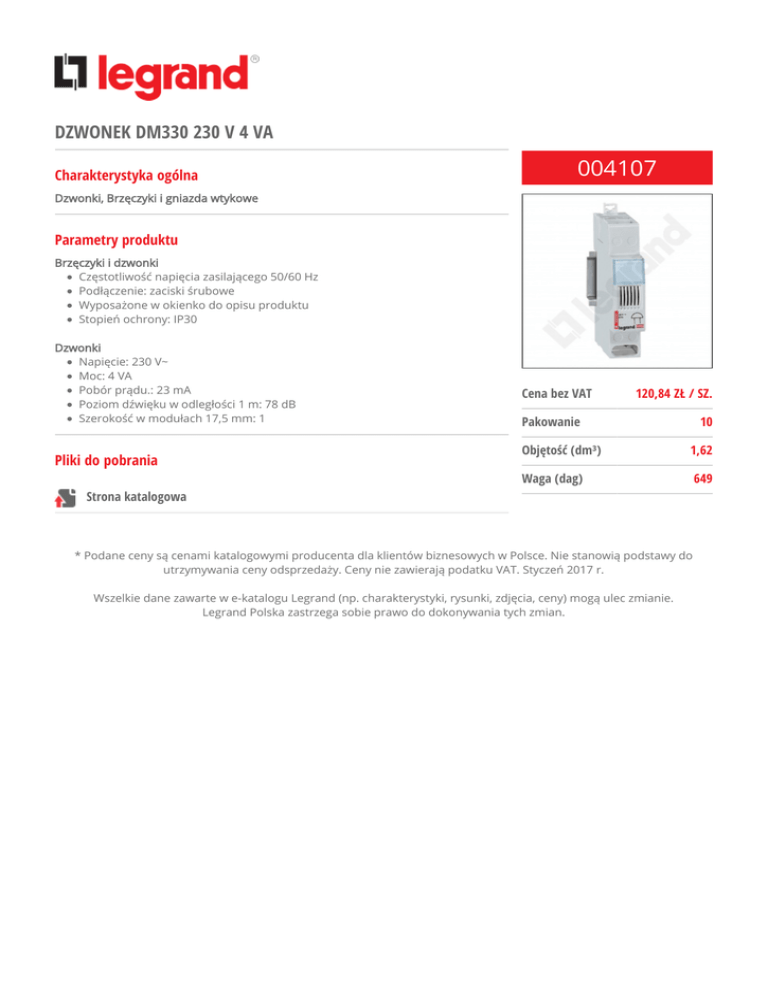 DZWONEK DM330 230 V 4 VA Charakterystyka ogólna 004107 Dzwonki, Brzęczyki i gniazda wtykowe Parametry produktu Brzęczyki i dzwonki Częstotliwość napięcia zasilającego 50/60 Hz Podłączenie: zaciski śrubowe Wyposażone w okienko do opisu produktu Stopień ochrony: IP30 Dzwonki Napięcie: 230 V~ Moc: 4 VA Pobór prądu.: 23 mA Poziom dźwięku w odległości 1 m: 78 dB Szerokość w modułach 17,5 mm: 1 Pliki do pobrania Cena bez VAT 120,84 ZŁ / SZ. 10 Pakowanie Objętość (dm³) 1,62 Waga (dag) 649 Strona katalogowa * Podane ceny są cenami katalogowymi producenta dla klientów biznesowych w Polsce. Nie stanowią podstawy do utrzymywania ceny odsprzedaży. Ceny nie zawierają podatku VAT. Styczeń 2017 r. Wszelkie dane zawarte w e-katalogu Legrand (np. charakterystyki, rysunki, zdjęcia, ceny) mogą ulec zmianie. Legrand Polska zastrzega sobie prawo do dokonywania tych zmian.
