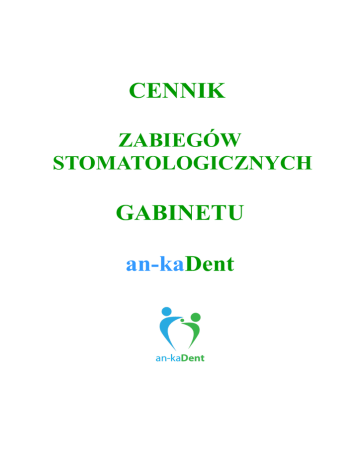 CENNIK ZABIEGÓW STOMATOLOGICZNYCH GABINETU an-kaDent BADANIE Przegląd uzębienia z ustaleniem planu leczenia (pierwsza wizyta w gabinecie) Przegląd uzębienia- kolejna, regularna wizyta kontrolna (co 6 miesięcy) po zakończonym leczeniu w naszym gabinecie 50 zł bezpłatnie Konsultacja stomatologiczna 50 zł Wykonanie zdjęcia rentgenowskiego na potrzeby gabinetu 30 zł Wypisanie recepty 50 zł Wypisanie zaświadczenia 50 zł STOMATOLOGIA DZIECIĘCA Wizyta adaptacyjna / brak współpracy z pacjentem 50 zł Przegląd uzębienia z ustaleniem planu leczenia (pierwsza wizyta w gabinecie) 50 zł Fluoryzacja zębów mlecznych i stałych 70 zł Lakowanie bruzd w zębie stałym 80 zł Impregnacja zębów mlecznych (lapisowanie) - cykl 3 wizyt 150 zł Wypełnienie chemoutwardzalne- ketac 100 zł Wypełnienie światłoutwardzalne w zębie mlecznym kolorowe 100- 120 zł Opatrunek 60 zł Leczenie amputacyjne 80 zł Usunięcie zęba mlecznego 50- 80 zł LECZENIE ZACHOWAWCZE Znieczulenie 20 zł Wypełnienie ubytku przyszyjkowego 130 zł Wypełnienie małego ubytku- 1 powierzchnia 130 zł Wypełnienie ubytku średniej wielkości- 2 powierzchnie 150 zł Wypełnienie dużego ubytku- 3 powierzchnie 170 zł Rozległa odbudowa zęba- więcej niż 3 powierzchnie 200 zł Odbudowa zęba na bazie wkładu z włókna szklanego 350 zł Odbudowa zęba z wkładem standardowym (Anker) 250 zł Licówka kompozytowa 200 zł LECZENIE KANAŁOWE - ENDODONCJA Opatrunek 80 zł Opracowanie i wypełnienie 1 kanału 270 zł Opracowanie i wypełnienie 2 kanałów 350 zł Opracowanie i wypełnienie 3 kanałów 420 zł Opracowanie i wypełnienie każdego następnego kanału 460 zł Opracowanie i wypełnienie 1 kanału- powtórne leczenie endodontyczne (reendo) 400 zł Opracowanie i wypełnienie 2 kanałów- powtórne leczenie endodontyczne (reendo) 520 zł Opracowanie i wypełnienie 3 kanałów- powtórne leczenie endodontyczne (reendo) 630 zł Opracowanie i wypełnienie każdego następnego kanału (leczenie reendo) 670 zł LECZENIE POD MIKROSKOPEM Zamknięcie perforacji materiałem MTA 100- 200 zł Udrożnienie zobliterowanego kanału 200- 400 zł Usunięcie złamanego narzędzia endodontycznego 200- 400 zł LECZENIE CHIRURGICZNE Konsultacja 50 zł Usunięcie zęba stałego 100- 150 zł Usunięcie zęba przez dłutowanie 200- 300 zł Usunięcie zęba zatrzymanego 250- 450 zł Usunięcie zęba mlecznego 80- 100 zł Resekcja wierzchołka zęba 350 zł Wyłuszczenie torbieli 250- 450 zł Zamknięcie połączenia z zatoką szczękową - powstałego po usunięciu zęba w naszym gabinecie - powstałego po usunięciu zęba w innym gabinecie 150 zł 300 zł Usunięcie torbieli zastoinowej wargi 200 zł Usunięcie zmiany w obrębie jamy ustnej Nacięcie ropnia Plastyka wyrostka zębodołowego 150- 350 zł 50 zł 150- 300 zł Podcięcie wędzidełka 150 zł Wycięcie kieszonki dziąsłowej 150 zł Radektomia 300 zł Hemisekcja 350 zł Odsłonięcie zęba ze wskazań ortodontycznych 300- 400 zł Kortykotomia- 1 ząb 150 zł Replantacja 400 zł Wydłużenie korony klinicznej 200 zł Pogłębienie przedsionka jamy ustnej 300 zł Kiretaż otwarty- 1 ząb 150 zł Opatrunek, zmiana sączków, płukanie po zabiegu w naszym gabinecie bezpłatnie Zdjęcie szwów po zabiegu w naszym gabinecie bezpłatnie Przedziały cenowe zależą od rozległości i trudności zabiegu IMPLANTOLOGIA Konsultacja implantologiczna Wszczepienie implantu (firma OSSTEM) Śruba gojąca 100 zł 2500 zł bezpłatnie Podniesienie dna zatoki 1500- 2500 zł Augmentacja kości (odbudowa kości) 1000- 2500 zł Korona na implancie 2500 zł WYBIELANIE ZĘBÓW Wybielanie nakładkowe- wykonanie indywidualnych szyn do wielokrotnego wybielania zębów w domu z zastosowaniem specjalistycznego żelu wybielającego 500 zł INNE Indywidualna szyna relaksacyjna- wykonanie i instruktaż 350 zł CHOROBY DZIĄSEŁ Płukanie kieszonek dziąsłowych z aplikacją leku 50- 60 zł Ultradźwiękowe usuwanie kamienia (scaling) 120 zł Usuwanie osadu i przebarwień- piaskowanie (2 łuki) 120 zł Lakierowanie zębów- fluoryzacja 70 zł Pakiet czyszczenia zębów (scaling, piaskowanie i fluoryzacja) 200 zł Szynowanie rozchwianych (6) zębów 600 zł Leczenie nadwrażliwości- 1 ząb 20 zł PROTETYKA STOMATOLOGICZNA Konsultacja protetyczna Korona porcelanowa na metalu Korona porcelanowa na złocie 80 zł 700 zł 700 zł + złoto Korona stal: porcelana + margin 750 zł Korona stal: porcelana + margin + frezowanie do protezy szkieletowej 750 zł Korona porcelanowa na cerkonie- bezmetalowa 1500 zł Korona pełnoceramiczna 1200 zł Most: 1 punkt 700 zł Most na włóknie szklanym 1000 zł Proteza szkieletowa 1300 zł Proteza acetalowa elastyczna 1500 zł Proteza całkowita 1000 zł Punkt w protezie częściowej (ząb, klamra, płyta protezy) 70 zł Wkład korzeniowy odlewany ze stali 300 zł Wkład korzeniowy szklany 250 zł Praca składana- proteza szkieletowa, zasuwy, korony, frezowanie wycena indywidualna Dostawienie zęba do protezy 100 zł Naprawa protezy- pęknięcie 100 zł Proteza natychmiastowa - do 3 zębów - powyżej 3 zębów 250 zł 600 zł Dostosowanie protezy- korekta (proteza wykonana w naszym gabinecie) bezpłatnie Wyciski do modeli orientacyjnych 100 zł Onlay, inlay, endokorona- kompozyt 600 zł Zacementowanie korony wykonanej poza naszym gabinetem 50 zł ORTODONCJA Konsultacja Konsultacja z modelami Plan leczenia 50 zł 150 zł 50 zł Aparat modelowy na 1łuk 1500 zł Aparat kosmetyczny (szafirowy) na 1 łuk 2500 zł Aparat kosmetyczny (porcelanowy) na 1 łuk 2100 zł Aparat samoligaturujący na 1 łuk 2400 zł Clear aligner (1 etap) 800 zł Wizyta kontrolna z aparatem stałym 180 zł Wizyta kontrolna - z 1 łukiem - z 2 łukami 150 zł 200 zł Wymiana ligatur jako samodzielna wizyta 50 zł Płytka Schwarza 550 zł Aparat Stockfischa 850 zł Kontrola aparatu ruchomego 50 zł Separacja 50 zł Maska twarzowa 500 zł Head Gear 500 zł Twin Force 1000 zł Hyrax 700 zł Quad Helix 600 
