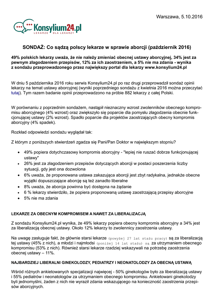 Warszawa, 5.10.2016 SONDAŻ: Co sądzą polscy lekarze w sprawie aborcji (październik 2016) 49% polskich lekarzy uważa, że nie należy zmieniać obecnej ustawy aborcyjnej, 34% jest za pewnym złagodzeniem przepisów, 12% za ich zaostrzeniem, a 5% nie ma zdania - wynika z sondażu przeprowadzonego przez największy portal dla lekarzy www.konsylium24.pl W dniu 5 października 2016 roku serwis Konsylium24.pl po raz drugi przeprowadził sondaż opinii lekarzy na temat ustawy aborcyjnej (wyniki poprzedniego sondażu z kwietnia 2016 można przeczytać tutaj). Tym razem badanie opinii przeprowadzono na próbie 882 lekarzy z całej Polski. W porównaniu z poprzednim sondażem, nastąpił nieznaczny wzrost zwolenników obecnego kompromisu aborcyjnego (4% wzrost) oraz zwiększyło się poparcie dla pomysłu złagodzenia obecnie funkcjonującej ustawy (2% wzrost). Spadło poparcie dla projektów zaostrzających obecny kompromis aborcyjny (4% spadek). Rozkład odpowiedzi sondażu wyglądał tak: Z którym z poniższych stwierdzeń zgadza się Pani/Pan Doktor w największym stopniu? 49% popiera dotychczasowy kompromis aborcyjny - "lepiej nie ruszać dobrze funkcjonującej ustawy" 26% jest za złagodzeniem przepisów dotyczących aborcji w postaci poszerzenia liczby sytuacji, gdy jest ona dozwolona 6% uważa, że proponowana ustawa zakazująca aborcji jest zbyt radykalna, jednakże obecne wyjątki dopuszczające aborcję są też zanadto liberalne 8% uważa, że aborcja powinna być dostępna na żądanie 6 % lekarzy stwierdziło, że popiera proponowaną ustawę zaostrzającą przepisy aborcyjne 5% nie ma zdania LEKARZE ZA OBECNYM KOMPROMISEM A NAWET ZA LIBERALIZACJĄ Z sondażu Konsylium24.pl wynika, że 49% lekarzy popiera obecny kompromis aborcyjny a 34% jest za liberalizacją obecnej ustawy. Około 12% lekarzy to zwolennicy zaostrzenia ustawy. Na uwagę zasługuje fakt, że głównie starsi lekarze (powyżej 27 lat stażu pracy) są za liberalizacją tej ustawy (45% z nich), a młodzi i najmłodsi (poniżej 14 lat stażu) są za utrzymaniem obecnego kompromisu (53% z nich). Również starsi lekarze rzadziej wskazywali na potrzebę zaostrzenia obecnej ustawy – 11%. NAJBARDZIEJ LIBERALNI GINEKOLODZY, PEDIATRZY I NEONATOLODZY ZA OBECNĄ USTAWĄ Wśród różnych ankietowanych specjalizacji najwięcej - 50% ginekologów było za liberalizacją ustawy i 55% pediatrów i neonatologów za utrzymaniem obecnego kompromisu. Ankietowani ginekolodzy byli jednomyślni, żaden z nich nie wyraził zdania wskazującego na konieczność zaostrzenia przepisów aborcyjnych. KOBIETY LEKARKI TAK SAMO ODPOWIADAŁY JAK MĘŻCZYŹNI LEKARZE Konsylium24.pl sprawdziło, czy odpowiedzi różniły się w zależności od płci odpowiadających lekarzy. Nieco więcej lekarzy mężczyzn (7% vs 4%) nie miało zdania na temat przepisów antyaborcyjnych. Sam rozkład odpowiedzi tych, którzy mieli zdanie na tak lub na nie, pozostał jednak bardzo podobny u obu płci. Sondaż został przeprowadzony w dniu 5 października 2016 roku. W sondażu wzięło udział 882 losowo dobranych lekarzy. Poprzednie sondaże przeprowadzane wśród polskich lekarzy, szczegóły dotyczące komentarzy do badania oraz zamawiania nowych sondaży znajdują się pod adresem: http://gruparx.com.pl/notes Dodatkowych informacji udziela Edyta Puchalska: e-mail: [email protected] tel. +48 606 802 266 www.Konsylium24.pl to największy opiniotwórczy serwis społecznościowy przeznaczony tylko dla lekarzy. Ponad 60 000 lekarzy pomaga sobie nawzajem każdego dnia rozwiązywać kilkadziesiąt problemów najtrudniejszych przypadków klinicznych polskich pacjentów. W serwisie toczą się również żywe dyskusje etyczne i światopoglądowe związane z wykonywaniem zawodu lekarza. Archiwum informacji prasowych