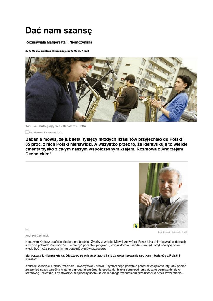 Dać nam szansę Rozmawiała Małgorzata I. Niemczyńska 2008-03-28, ostatnia aktualizacja 2008-03-28 11:33 Ron, Roi i Ruth grają na pl. Bohaterów Getta Fot. Mateusz Skwarczek / AG Badania mówią, że już setki tysięcy młodych Izraelitów przyjechało do Polski i 85 proc. z nich Polski nienawidzi. A wszystko przez to, że identyfikują to wielkie cmentarzysko z całym naszym współczesnym krajem. Rozmowa z Andrzejem Cechnickim* Andrzej Cechnicki Fot. Paweł Ulatowski / AG Niedawno Kraków opuściło pięcioro nastoletnich Żydów z Izraela. Mówili, że wrócą. Przez kilka dni mieszkali w domach u swoich polskich rówieśników. To ma być początek programu, dzięki któremu młodzi stamtąd i stąd nawiążą nowe więzi. Być może pomogą im nie popełnić błędów przeszłości. Małgorzata I. Niemczyńska: Dlaczego psychiatrzy zabrali się za organizowanie spotkań młodzieży z Polski i Izraela? Andrzej Cechnicki: Polsko-Izraelskie Towarzystwo Zdrowia Psychicznego powstało przed dziesięcioma laty, aby pomóc zrozumieć naszą wspólną historię poprzez bezpośrednie spotkania, bliską obecność, empatyczne wczuwanie się w rozmówcę. Powstało, aby stworzyć bezpieczny kontekst, dla lepszego zrozumienia przeszłości, a przez zrozumienie - porozumienia. To zaowocowało wieloma spotkaniami, wymianami z udziałem naszych przyjaciół z Izraela i sympozjami. Przez lata tworzyły się związki, przyjaźnie i inne przejawy współpracy polsko-izraelskiej i równolegle w trójkącie PolskaIzrael-Niemcy. To było najważniejsze doświadczenie dla mnie, przede wszystkim kolegów bliskich mi pokoleniowo z krakowskiej Katedry Psychiatrii i naszych nauczycieli. Ale tak naprawdę zawsze byliśmy głęboko przekonani, że nasza wspólna przyszłość tkwi w spotkaniu młodych ludzi. Marsz Żywych budził i budzi wiele wątpliwości, bo zdaje się zaprzeczać idei spotkania i bliskości. Przebiega w izolacji. Z całej złożonej historii polsko-żydowskich stosunków młodzi ludzie są w Izraelu uczeni o okropnościach, jakie się działy na terenie Polski, są uczeni o obozach śmierci i przyjeżdżają je odwiedzać. Ale to wszystko przebiega w zdumiewającej izolacji. Na miejscu są odcięci nie tylko od tradycji Żydów w Polsce, ale też od ludzi. Oficerowie Mosadu nie dopuszczają do kontaktów, co tłumaczy się zagrożeniem terrorystycznym. Wielu nauczycieli i psychiatrów izraelskich boleje nad tym. Okazuje się, że młodzież izraelska zupełnie inaczej przygotowywana jest do wyjazdów do Niemiec i do wymiany z tamtejszą młodzieżą. Wszystko odbywa się na zasadzie partnerstwa. Szkoły nawiązują kontakty ze szkołami i tak powstają programy na długie lata. Uczniowie mieszkają u siebie, poznają się, biorą udział we wspólnych warsztatach poświęconych przeszłości. U nas jest inaczej? - Gdy nasi przyjaciele z Izraela przyjechali na Marsz Żywych ze swoimi dziećmi, chcieliśmy ich dzieci poznać z naszymi. I nagle okazało się, że się nie da. Można przyjść ich odwiedzić w zamkniętej przestrzeni hotelu i pomachać przez szybę. Ale przebywać razem - nie. A przecież przez ostatnie lata byli z nami w Krakowie wielokrotnie - na sympozjach, na Festiwalu Kultury Żydowskiej, na innych imprezach. Natomiast w tym marszu było to niemożliwe. Wiedzieliśmy, że są próby przełamania tego dramatycznego doświadczenia. Na przykład szkoła w Gołdapi przed dziesięcioma laty znalazła małą szkołę w Izraelu i prowadzi z nią od tego czasu wymianę bezpośrednią - młodzież z młodzieżą. Wymianę, w której nie omija się też oczywiście trudnych tematów, bolesnych, tematów przeszłości. Tak buduje się ludzkie związki. To kultura otwarcia na przyszłość. To wychowanie do wspólnego bytowania na świecie. Doszliśmy do wniosku, że musimy dokonać jakiegoś choćby symbolicznego gestu. Coś się musi wydarzyć. Coś już się wydarzyło. - Było to trudne, bo gdyby np. dyrekcja szkoły w Izraelu zgłosiła taką inicjatywę w sposób oficjalny do dyrekcji szkoły w Polsce, to natychmiast musiałoby zostać o tym poinformowane izraelskie ministerstwo edukacji, natychmiast wkroczyłyby do akcji odpowiednie służby bezpieczeństwa i zostały uruchomione wszystkie procedury. Dlatego poprzez naszych izraelskich przyjaciół znaleźliśmy pewną szkołę muzyczną w Tel Awiwie, która tę inicjatywę podjęła, ale niejako nieoficjalnie, przez zaangażowanie rodziców. Tak się złożyło, że ta szkoła ma kilka poziomów, aż do wyższej uczelni muzycznej. Prowadzi ich mistrz gry na saksofonie Profesor Gersh Geller. Są więc różne grupy wiekowe, wśród nich także młodzież odpowiadająca naszym gimnazjalistom. Postanowiliśmy poznać ich z młodzieżą, która także wyraża się przez sztukę - stąd Zespół Państwowych Szkół Plastycznych na Salwatorze prowadzony przez Panią Małgorzate Hołówkę. Chodziło o to, żeby znaleźć odpowiednich partnerów. Małgorzata Hołówka i Gersh Geller zaangażowali się całym sercem. Zresztą mistrz Geller stworzył kwartet saksofonistów psychiatrów, a w nim gra m.in. prezydent PolskoIzraelskiego Towarzystwa Zdrowia Psychicznego Haim Knobler. Haim od lat przygotowywał to spotkanie. Wróćmy jednak do tematu. Istota wymiany była taka, że młodzi z Izraela przyjechali do Krakowa i mieszkali w domach u swoich tutejszych kolegów. Byli z nimi w szkole, grali koncerty, robili wspólne warsztaty, byli razem w Auschwitz, a potem w synagodze, gdzie kwartet młodych saksofonistów dał przepiękny koncert. A na koniec uczestniczyli razem w Marszu Pamięci w Płaszowie. Podczas podsumowania warsztatów młodzi z Krakowa powiedzieli, że chcieliby, aby ich koledzy z Izraela zostali z nimi i chodzili z nimi do szkoły. A z kolei młodzi z Izraela powiedzieli, że im szkoda wyjeżdżać i na pewno wrócą. To dopiero początek. Co będzie dalej? - Już jest planowana wizyta szkoły krakowskiej w Izrael