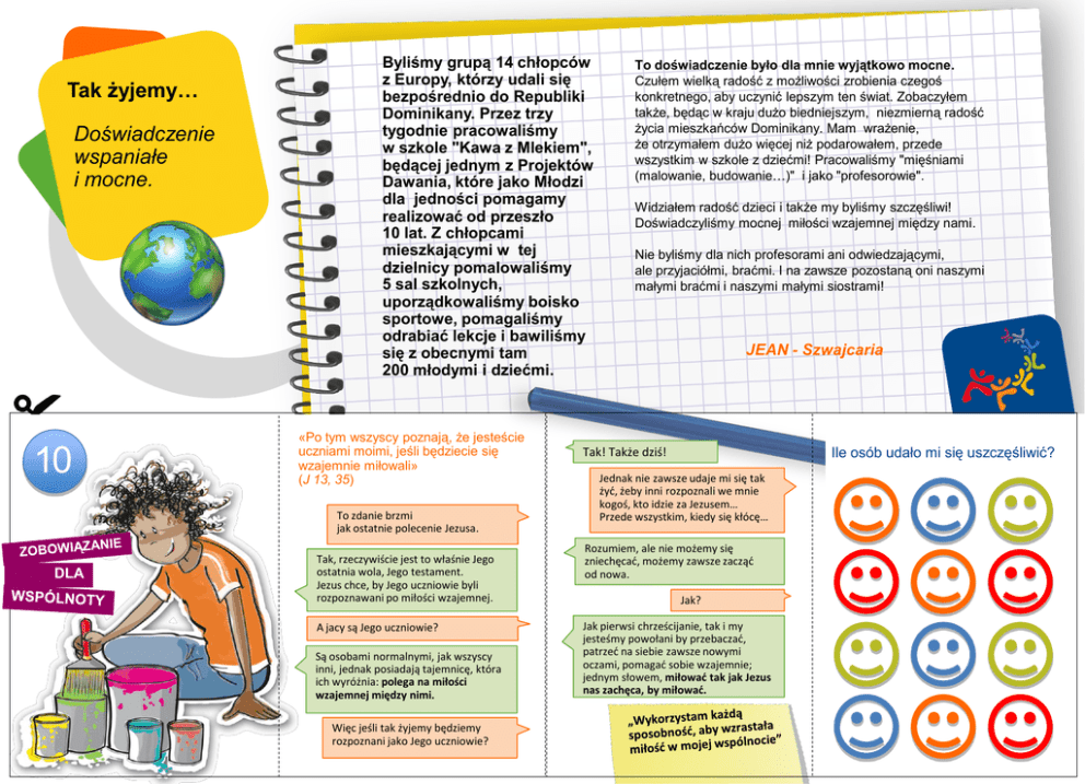 Tak żyjemy… Doświadczenie wspaniałe i mocne. 10 Byliśmy grupą 14 chłopców z Europy, którzy udali się bezpośrednio do Republiki Dominikany. Przez trzy tygodnie pracowaliśmy w szkole "Kawa z Mlekiem", będącej jednym z Projektów Dawania, które jako Młodzi dla jedności pomagamy realizować od przeszło 10 lat. Z chłopcami mieszkającymi w tej dzielnicy pomalowaliśmy 5 sal szkolnych, uporządkowaliśmy boisko sportowe, pomagaliśmy odrabiać lekcje i bawiliśmy się z obecnymi tam 200 młodymi i dziećmi. «Po tym wszyscy poznają, że jesteście uczniami moimi, jeśli będziecie się wzajemnie miłowali» (J 13, 35) To zdanie brzmi jak ostatnie polecenie Jezusa. DLA Tak, rzeczywiście jest to właśnie Jego ostatnia wola, Jego testament. Jezus chce, by Jego uczniowie byli rozpoznawani po miłości wzajemnej. A jacy są Jego uczniowie? Są osobami normalnymi, jak wszyscy inni, jednak posiadają tajemnicę, która ich wyróżnia: polega na miłości wzajemnej między nimi. Więc jeśli tak żyjemy będziemy rozpoznani jako Jego uczniowie? To doświadczenie było dla mnie wyjątkowo mocne. Czułem wielką radość z możliwości zrobienia czegoś konkretnego, aby uczynić lepszym ten świat. Zobaczyłem także, będąc w kraju dużo biedniejszym, niezmierną radość życia mieszkańców Dominikany. Mam wrażenie, że otrzymałem dużo więcej niż podarowałem, przede wszystkim w szkole z dziećmi! Pracowaliśmy "mięśniami (malowanie, budowanie…)" i jako "profesorowie". Widziałem radość dzieci i także my byliśmy szczęśliwi! Doświadczyliśmy mocnej miłości wzajemnej między nami. Nie byliśmy dla nich profesorami ani odwiedzającymi, ale przyjaciółmi, braćmi. I na zawsze pozostaną oni naszymi małymi braćmi i naszymi małymi siostrami! JEAN - Szwajcaria Ile osób udało mi się uszczęśliwić? Tak! Także dziś! Jednak nie zawsze udaje mi się tak żyć, żeby inni rozpoznali we mnie kogoś, kto idzie za Jezusem… Przede wszystkim, kiedy się kłócę… Rozumiem, ale nie możemy się zniechęcać, możemy zawsze zacząć od nowa. Jak? Jak pierwsi chrześcijanie, tak i my jesteśmy powołani by przebaczać, patrzeć na siebie zawsze nowymi oczami, pomagać sobie wzajemnie; jednym słowem, miłować tak jak Jezus nas zachęca, by miłować.