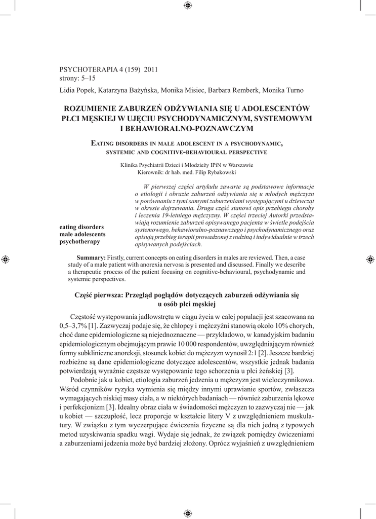 Psychoterapia 4 (159) 2011 strony: 5–15 Lidia Popek, Katarzyna Bażyńska, Monika Misiec, Barbara Remberk, Monika Turno Rozumienie zaburzeń odżywiania się u adolescentów płci męskiej w ujęciu psychodynamicznym, systemowym i behawioralno-poznawczym Eating disorders in male adolescent in a psychodynamic, systemic and cognitive-behavioural perspective Klinika Psychiatrii Dzieci i Młodzieży IPiN w Warszawie Kierownik: dr hab. med. Filip Rybakowski eating disorders male adolescents psychotherapy W pierwszej części artykułu zawarte są podstawowe informacje o etiologii i obrazie zaburzeń odżywiania się u młodych mężczyzn w porównaniu z tymi samymi zaburzeniami występującymi u dziewcząt w okresie dojrzewania. Druga część stanowi opis przebiegu choroby i leczenia 19-letniego mężczyzny. W części trzeciej Autorki przedstawiają rozumienie zaburzeń opisywanego pacjenta w świetle podejścia systemowego, behawioralno-poznawczego i psychodynamicznego oraz opisują przebieg terapii prowadzonej z rodziną i indywidualnie w trzech opisywanych podejściach. Summary: Firstly, current concepts on eating disorders in males are reviewed. Then, a case study of a male patient with anorexia nervosa is presented and discussed. Finally we describe a therapeutic process of the patient focusing on cognitive-behavioural, psychodynamic and systemic perspectives. Część pierwsza: Przegląd poglądów dotyczących zaburzeń odżywiania się u osób płci męskiej Częstość występowania jadłowstrętu w ciągu życia w całej populacji jest szacowana na 0,5–3,7% [1]. Zazwyczaj podaje się, że chłopcy i mężczyźni stanowią około 10% chorych, choć dane epidemiologiczne są niejednoznaczne — przykładowo, w kanadyjskim badaniu epidemiologicznym obejmującym prawie 10 000 respondentów, uwzględniającym również formy subkliniczne anoreksji, stosunek kobiet do mężczyzn wynosił 2:1 [2]. Jeszcze bardziej rozbieżne są dane epidemiologiczne dotyczące adolescentów, wszystkie jednak badania potwierdzają wyraźnie częstsze występowanie tego schorzenia u płci żeńskiej [3]. Podobnie jak u kobiet, etiologia zaburzeń jedzenia u mężczyzn jest wieloczynnikowa. Wśród czynników ryzyka wymienia się między innymi uprawianie sportów, zwłaszcza wymagających niskiej masy ciała, a w niektórych badaniach — również zaburzenia lękowe i perfekcjonizm [3]. Idealny obraz ciała w świadomości mężczyzn to zazwyczaj nie — jak u kobiet — szczupłość, lecz proporcje w kształcie litery V z uwzględnieniem muskulatury. W związku z tym wyczerpujące ćwiczenia fizyczne są dla nich jedną z typowych metod uzyskiwania spadku wagi. Wydaje się jednak, że związek pomiędzy ćwiczeniami a zaburzeniami jedzenia może być bardziej złożony. Oprócz wyjaśnień z uwzględnieniem 6 Lidia Popek i wsp. mechanizmów psychologicznych, warto także pamiętać, że ograniczona podaż pokarmu, zarówno u zwierząt, jak i u ludzi, wywołuje zwiększenie aktywności w nie do końca poznanym mechanizmie [3]. Opisano ponadto kilka przypadków mężczyzn, u których anoreksja współwystępowała z zaburzeniami identyfikacji płciowej [4, 5]. Zwracano uwagę również na związek pomiędzy anoreksją a homoseksualną lub biseksualną orientacją u mężczyzn, choć dane nie są tutaj jednoznaczne [5, 6, 7]. Obraz psychopatologiczny anoreksji u mężczyzn i kobiet wydaje się podobny. BMI, wiek zachorowania i obraz kliniczny zazwyczaj nie różnią się w sposób istotny. U obu płci mogą współwystępować inne zaburzenia psychiczne, zwłaszcza lękowe i depresyjne [7]. W badaniu Carlata i wsp. [6], dotyczącym 135 pacjentów z zaburzeniami jedzenia, stwierdzono, że zarówno u mężczyzn, jak i kobiet aktualnie lub w wywiadzie stwierdzano depresję (54%), nadużywanie substancji psychoaktywnych (37%) i zaburzenia osobowości (24%). Z kolei w badaniu Woodside’a i wsp. [2] zaobserwowano częstsze występowanie uzależnienia od alkoholu u mężczyzn, depresji zaś u kobiet [2]. Różnice w ciężkości przebiegu choroby u obu płci zaobserwowała Siegel [8] i wsp. W badaniu obejmującym 10 adolescentów płci męskiej stwierdzono znaczne wyniszczenie, zaniki korowe i poważny stan somatyczny. U trzech z nich wystąpiła niewydolność krążenia. Ponadto ośmiu pacjentów miało wzrost poniżej 50 centyli, trzech zaś — poniżej 10. Na zahamowanie wzrostu u adolescentów płci męskiej chorujących na anoreksję wskazuje także praca Modana-Mosesa i wsp. [9]. Przebieg leczenia wydaje się podobny u obu płci, a pewne dane wskazują nawet na lepsze rokowanie u mężczyzn. W jednym z badań [za: 3] mężczyźni w ciągu roku po zakończeniu hospitalizacji przybierali na wadze więcej niż kobiety i w przeciwieństwie do kobiet żaden z nich nie trafił ponownie do szpitala. Z kolei w badaniu Stovinga i wsp. [10] zauważono u nich znacznie krótszy okres od pojawienia się objawów do wystąpienia remisji (3 lata vs 7). W trakcie rocznej obserwacji przeprowadzonej przez Strobera i wsp. [11] stwierdzono częstsze utrzymywanie się objawów u kobiet. Natomiast Lindblad i wsp. [12] zaobserwowali, że ponowne hospitalizacje psychiatryczne z powodu zaburzeń psychicznych innych niż anoreksja u mężczyzn były równie częste, jak w populacji ogólnej u mężczyzn, podczas gdy u kobiet z anoreksją ten odsetek był wyższy. Część druga: Przebieg choroby i leczenia 19-letniego pacjenta Dane medyczne Choroba pacjenta rozpoczęła się w 16. r.ż., w pierwszej klasie technikum, utratą 15 kg masy ciała. Do istotnego zaostrzenia doszło dwa lata później, jesienią 2010 r., i z tego powodu został on skierowany do szpitala. Od początku hospitalizacji był objęty behawioralnym programem zaburzeń odżywiania się. W dniu przyjęcia został zakwalifikowany do drugiej fazy programu. Ponieważ jego wskaźnik BMI wynosił 16, pominięto pierwszą bardziej restrykcyjną fazę leczenia. W 