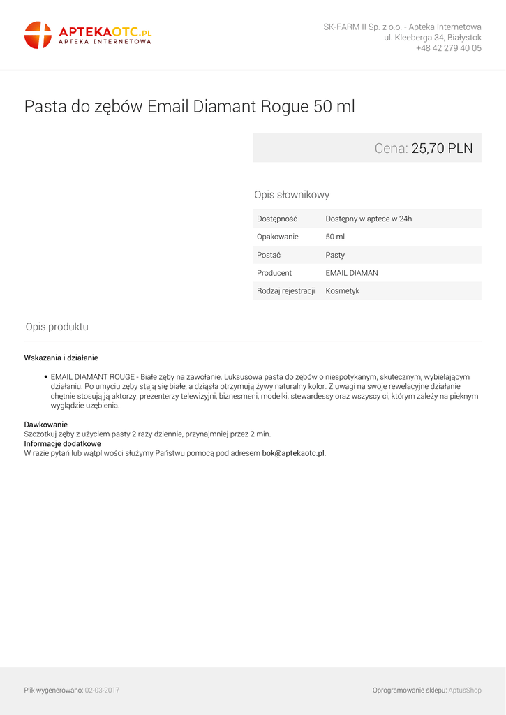 SK-FARM II Sp. z o.o. - Apteka Internetowa ul. Kleeberga 34, Białystok +48 42 279 40 05 Pasta do zębów Email Diamant Rogue 50 ml Cena: 25,70 PLN Opis słownikowy Dostępność Dostępny w aptece w 24h Opakowanie 50 ml Postać Pasty Producent EMAIL DIAMAN Rodzaj rejestracji Kosmetyk Opis produktu Wskazania i działanie EMAIL DIAMANT ROUGE - Białe zęby na zawołanie. Luksusowa pasta do zębów o niespotykanym, skutecznym, wybielającym działaniu. Po umyciu zęby stają się białe, a dziąsła otrzymują żywy naturalny kolor. Z uwagi na swoje rewelacyjne działanie chętnie stosują ją aktorzy, prezenterzy telewizyjni, biznesmeni, modelki, stewardessy oraz wszyscy ci, którym zależy na pięknym wyglądzie uzębienia. Dawkowanie Szczotkuj zęby z użyciem pasty 2 razy dziennie, przynajmniej przez 2 min. Informacje dodatkowe W razie pytań lub wątpliwości służymy Państwu pomocą pod adresem [email protected]. Plik wygenerowano: 02-03-2017 Powered by TCPDF (www.tcpdf.org) Oprogramowanie sklepu: AptusShop