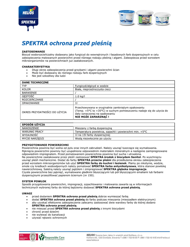 SPEKTRA ochrona przed pleśnią ZASTOSOWANIE Biocyd wodorozcieńczalny dodawany jako fungicyd do wewnętrznych i fasadowych farb dyspersyjnych w celu zabezpieczenia malowanych powierzchni przed różnego rodzaju pleśnią i algami. Zabezpiecza przed wzrostem mikroorganizmów na powierzchniach już zaatakowanych. CHARAKTERYSTYKA • Długi okres zabezpieczenia przed grzybami i algami powierzchni ścian • Może być dodawany do różnego rodzaju farb dyspersyjnych • Nie jest szkodliwy dla ludzi DANE TECHNICZNE TYP KOLOR BARWIENIE GĘSTOŚĆ ROZCIEŃCZANIE OPAKOWANIE OKRES PRZYDATNOŚCI DO UŻYCIA SPOSÓB UŻYCIA NANOSZENIE WARUNKI PRACY WYDAJNOŚĆ MYCIE NARZĘDZI Fungicyd/algicyd w wodzie Biała, nieprzeźroczysta ciecz / 1.0 kg/l / 1l Przechowywana w oryginalnie zamkniętym opakowaniu (Temp. +5°C to +35°C) w suchym pomieszczeniu nadaje się do użycia do daty oznaczonej na opakowaniu NIE MOŻE ZAMARZNĄĆ ! Mieszany z farbą dyspersyjną Temperatura powietrza, szpachli i powierzchni min. +5°C 1l na 15l farby dyspersyjnej Wodą niezwłocznie po użyciu PRZYGOTOWANIE POWIERZCHNI Powierzchnia powinna być wolna od pyłu oraz innych zabrudzeń. Należy usunąć łuszczące się wymalowania. Pęknięcia powierzchni powinny być uzupełnione odpowiednim materiałem mineralnym a następnie zaimpregnowane odpowiednim impregnatem. Przed pomalowaniem powierzchnia powinna być sucha i utrwalona. Na powierzchnie zaatakowane przez pleśń zastosować SPEKTRA środek z biocydem Sanitol. Po wyschnięciu usunąć pleśń mechanicznie. Dodać do farby SPEKTRA przeciw pleśni dla przedłużenia okresu zabezpieczenia przed wzrostem mikroorganizmów lub użyć SPEKTRA farby do kuchni i łazienek. Plamy po nikotynie, wodzie, smole czy kredkach wodoodpornych należy pomalować SPEKTRA farba antynikotynowa, która stanowi powłokę nawierzchniową. Saletrą należy usunąć pędzlem i zimpregnować SPEKTRA głęboka impregnacja. Czyste powierzchnie bez pęknięć, wymalowane gładkimi błyszczącymi lub pół błyszczącymi emaliami lub farbami dyspersyjnymi przeszlifować papierem ściernym (nr 150). SYSTEM POWŁOK Sposób przygotowania powierzchni, impregnacji, szpachlowania i malowania zawarte są w informacjach technicznych wybranej farby do której będziemy dodawać SPEKTRA ochrona przed pleśnią. UWAGI • przed dodaniem SPEKTRA ochrona przed pleśnią dobrze wymieszać farbę • dodać SPEKTRA ochrona przed pleśnią do farby podczas mieszania (mieszadłem elektrycznym) • aby uzyskać efektywne zabezpieczenie zalecamy zastosować dwie warstwy farby do której dodano SPEKTRA ochrona przed pleśnią • nie mieszać przed SPEKTRA ochrona przed pleśnią z innymi biocydami • chronić przed dziećmi • nie wylewać do kanalizacji • używać rękawic ochronnych