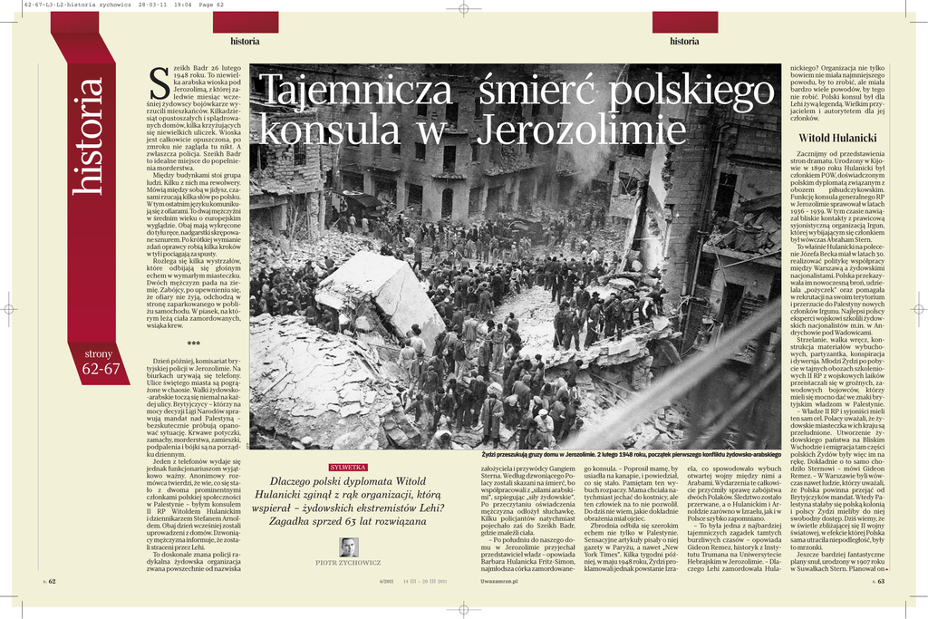 62-67–L3-L2-historia zychowicz 28-03-11 19:04 Page 62 strony 62-67 s. 62 zeikh Badr 26 lutego 1948 roku. To niewielka arabska wioska pod Jerozolimą, z której zaledwie miesiąc wcześniej żydowscy bojówkarze wyrzucili mieszkańców. Kilkadziesiąt opustoszałych i splądrowanych domów, kilka krzyżujących się niewielkich uliczek. Wioska jest całkowicie opuszczona, po zmroku nie zagląda tu nikt. A zwłaszcza policja. Szeikh Badr to idealne miejsce do popełnienia morderstwa. Między budynkami stoi grupa ludzi. Kilku z nich ma rewolwery. Mówią między sobą w jidysz, czasami rzucają kilka słów po polsku. Wtym ostatnim języku komunikują się z ofiarami. To dwaj mężczyźni w średnim wieku o europejskim wyglądzie. Obaj mają wykręcone do tyłu ręce, nadgarstki skrępowane sznurem. Po krótkiej wymianie zdań oprawcy robią kilka kroków w tył i pociągają za spusty. Rozlega się kilka wystrzałów, które odbijają się głośnym echem w wymarłym miasteczku. Dwóch mężczyzn pada na ziemię. Zabójcy, po upewnieniu się, że ofiary nie żyją, odchodzą w stronę zaparkowanego w pobliżu samochodu. W piasek, na którym leżą ciała zamordowanych, wsiąka krew. S historia Tajemnicza śmierć polskiego konsula w Jerozolimie *** Dzień później, komisariat brytyjskiej policji w Jerozolimie. Na biurkach urywają się telefony. Ulice świętego miasta są pogrążone w chaosie. Walki żydowsko-arabskie toczą się niemal na każdej ulicy. Brytyjczycy – którzy na mocy decyzji Ligi Narodów sprawują mandat nad Palestyną – bezskutecznie próbują opanować sytuację. Krwawe potyczki, zamachy, morderstwa, zamieszki, podpalenia i bójki są na porządku dziennym. Jeden z telefonów wydaje się jednak funkcjonariuszom wyjątkowo ważny. Anonimowy rozmówca twierdzi, że wie, co się stało z dwoma prominentnymi członkami polskiej społeczności w Palestynie – byłym konsulem II RP Witoldem Hulanickim i dziennikarzem Stefanem Arnoldem. Obaj dzień wcześniej zostali uprowadzeni z domów. Dzwoniący mężczyzna informuje, że zostali straceni przez Lehi. To doskonale znana policji radykalna żydowska organizacja zwana powszechnie od nazwiska AFP historia historia Żydzi przeszukują gruzy domu w Jerozolimie. 2 lutego 1948 roku, początek pierwszego konfliktu żydowsko-arabskiego SYLWETKA Dlaczego polski dyplomata Witold Hulanicki zginął z rąk organizacji, którą wspierał – żydowskich ekstremistów Lehi? Zagadka sprzed 63 lat rozwiązana piotr zychowicz 6/2011 14 III – 20 III 2011 założyciela i przywódcy Gangiem Sterna. Według dzwoniącego Polacy zostali skazani na śmierć, bo współpracowali z „siłami arabskimi”, szpiegując „siły żydowskie”. Po przeczytaniu oświadczenia mężczyzna odłożył słuchawkę. Kilku policjantów natychmiast pojechało zaś do Szeikh Badr, gdzie znaleźli ciała. – Po południu do naszego domu w Jerozolimie przyjechał przedstawiciel władz – opowiada Barbara Hulanicka Fritz-Simon, najmłodsza córka zamordowaneUwazamrze.pl go konsula. – Poprosił mamę, by usiadła na kanapie, i powiedział, co się stało. Pamiętam ten wybuch rozpaczy. Mama chciała natychmiast jechać do kostnicy, ale ten człowiek na to nie pozwolił. Do dziś nie wiem, jakie dokładnie obrażenia miał ojciec. Zbrodnia odbiła się szerokim echem nie tylko w Palestynie. Sensacyjne artykuły pisały o niej gazety w Paryżu, a nawet „New York Times”. Kilka tygodni później, w maju 1948 roku, Żydzi proklamowali jednak powstanie Izra- ela, co spowodowało wybuch otwartej wojny między nimi a Arabami. Wydarzenia te całkowicie przyćmiły sprawę zabójstwa dwóch Polaków. Śledztwo zostało przerwane, a o Hulanickim i Arnoldzie zarówno w Izraelu, jak i w Polsce szybko zapomniano. – To była jedna z najbardziej tajemniczych zagadek tamtych burzliwych czasów – opowiada Gideon Remez, historyk z Instytutu Trumana na Uniwersytecie Hebrajskim w Jerozolimie. – Dlaczego Lehi zamordowała Hula- nickiego? Organizacja nie tylko bowiem nie miała najmniejszego powodu, by to zrobić, ale miała bardzo wiele powodów, by tego nie robić. Polski konsul był dla Lehi żywą legendą. Wielkim przyjacielem i autorytetem dla jej członków. Witold Hulanicki Zacznijmy od przedstawienia stron dramatu. Urodzony w Kijowie w 1890 roku Hulanicki był członkiem POW, doświadczonym polskim dyplomatą związanym z obozem piłsudczykowskim. Funkcję konsula generalnego RP w Jerozolimie sprawował w latach 1936 – 1939. W tym czasie nawiązał bliskie kontakty z prawicową syjonistyczną organizacją Irgun, której wybijającym się członkiem był wówczas Abraham Stern. To właśnie Hulanicki na polecenie Józefa Becka miał w latach 30. realizować politykę współpracy między Warszawą a żydowskimi nacjonalistami. Polska przekazywała im nowoczesną broń, udzielała „pożyczek” oraz pomagała w rekrutacji na swoim terytorium i przerzucie do Palestyny nowych członków Irgunu. Najlepsi polscy eksperci wojskowi szkolili żydowskich nacjonalistów m.in. w Andrychowie pod Wadowicami. Strzelanie, walka wręcz, konstrukcja materiałów wybuchowych, partyzantka, konspiracja i dywersja. Młodzi Żydzi po pobycie w tajnych obozach szkoleniowych II RP z wojskowych laików przeistaczali się w groźnych, zawodowych bojowców, którzy mieli się mocno dać we znaki brytyjskim władzom w Palestynie. – Władze II RP i syjoniści mieli ten sam cel. Polacy uważali, że żydowskie miasteczka w ich kraju są przeludnione. Utworzenie żydowskiego państwa na Bliskim Wschodzie i emigracja tam części polskich Żydów były więc im na rękę. Dokładnie o to samo chodziło Sternowi – mówi Gideon Remez. – W Warszawie byli wówczas nawet ludzie, którzy uważali, że Polska powinna przejąć od Brytyjczyków mandat. Wtedy Palestyna stałaby się polską kolonią i polscy Żydzi mieliby do niej swobodny dostęp. Dziś wiemy, że w świetle zbliżając