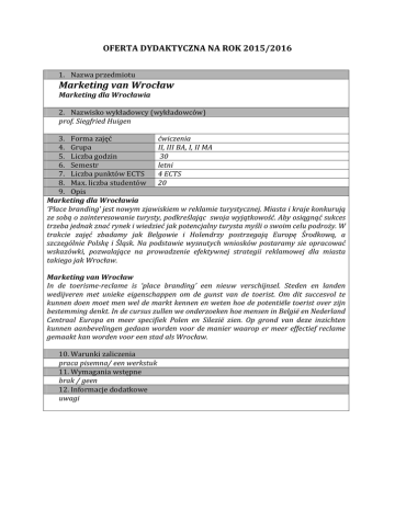 OFERTA DYDAKTYCZNA NA ROK 2015/2016 1. Nazwa przedmiotu Marketing van Wrocław Marketing dla Wrocławia 2. Nazwisko wykładowcy (wykładowców) prof. Siegfried Huigen 3. Forma zajęć ćwiczenia 4. Grupa II, III BA, I, II MA 5. Liczba godzin 30 6. Semestr letni 7. Liczba punktów ECTS 4 ECTS 8. Max. liczba studentów 20 9. Opis Marketing dla Wrocławia ‘Place branding’ jest nowym zjawiskiem w reklamie turystycznej. Miasta i kraje konkurują ze sobą o zainteresowanie turysty, podkreślając swoja wyjątkowość. Aby osiągnąć sukces trzeba jednak znać rynek i wiedzieć jak potencjalny turysta myśli o swoim celu podroży. W trakcie zajęć zbadamy jak Belgowie i Holendrzy postrzegają Europę Środkową, a szczególnie Polskę i Śląsk. Na podstawie wysnutych wniosków postaramy sie opracować wskazówki, pozwalające na prowadzenie efektywnej strategii reklamowej dla miasta takiego jak Wrocław. Marketing van Wrocław In de toerisme-reclame is ‘place branding’ een nieuw verschijnsel. Steden en landen wedijveren met unieke eigenschappen om de gunst van de toerist. Om dit succesvol te kunnen doen moet men wel de markt kennen en weten hoe de potentiële toerist over zijn bestemming denkt. In de cursus zullen we onderzoeken hoe mensen in België en Nederland Centraal Europa en meer specifiek Polen en Silezië zien. Op grond van deze inzichten kunnen aanbevelingen gedaan worden voor de manier waarop er meer effectief reclame gemaakt kan worden voor een stad als Wrocław. 10. Warunki zaliczenia praca pisemna/ een werkstuk 11. Wymagania wstępne brak / geen 12. Informacje dodatkowe uwagi