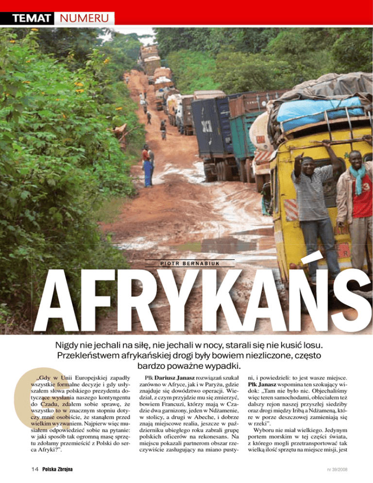 TEMAT NUMERU PIOTR BERNABIUK Nigdy nie jechali na siłę, nie jechali w nocy, starali się nie kusić losu. Przekleństwem afrykańskiej drogi były bowiem niezliczone, często bardzo poważne wypadki. „Gdy w Unii Europejskiej zapadły wszystkie formalne decyzje i gdy usłyszałem słowa polskiego prezydenta dotyczące wysłania naszego kontyngentu do Czadu, zdałem sobie sprawę, że wszystko to w znacznym stopniu dotyczy mnie osobiście, że stanąłem przed wielkim wyzwaniem. Najpierw więc musiałem odpowiedzieć sobie na pytanie: w jaki sposób tak ogromną masę sprzętu zdołamy przemieścić z Polski do serca Afryki?”. 14 Polska Zbrojna Płk Dariusz Janasz rozwiązań szukał zarówno w Afryce, jak i w Paryżu, gdzie znajduje się dowództwo operacji. Wiedział, z czym przyjdzie mu się zmierzyć, bowiem Francuzi, którzy mają w Czadzie dwa garnizony, jeden w Ndżamenie, w stolicy, a drugi w Abeche, i dobrze znają miejscowe realia, jeszcze w październiku ubiegłego roku zabrali grupę polskich oficerów na rekonesans. Na miejscu pokazali partnerom obszar rzeczywiście zasługujący na miano pusty- ni, i powiedzieli: to jest wasze miejsce. Płk Janasz wspomina ten szokujący widok: „Tam nie było nic. Objechaliśmy więc teren samochodami, obleciałem też dalszy rejon naszej przyszłej siedziby oraz drogi między Iribą a Ndżameną, które w porze deszczowej zamieniają się w rzeki”. Wyboru nie miał wielkiego. Jedynym portem morskim w tej części świata, z którego mogli przetransportować tak wielką ilość sprzętu na miejsce misji, jest nr 39/2008 | | | | | | | | | | PKW CZAD | ARCHIWUM SZEFOSTWA TRANSPORTU I RUCHU WOJSK ZAPIS FORUM NA CELOWNIKU WOJSKO KULISY PORADY PO SŁUŻBIE HISTORIA MILITARIA PRASA ŚWIAT TO I OWO kameruński Douali. Jedyna, licząca 2700 kilometrów droga prowadząca do rejonu działania, wyłożona jest najpierw asfaltem, a potem afrykańskimi szutrami. Jedyna linia kolejowa z portu w kierunku Czadu kończy się po 650 kilometrach w N’Gaoundere. Musiał racjonalnie wykorzystać w odpowiednich proporcjach wszystkie środki – transport lotniczy, morski, drogowy i kolejowy, synchronizując to w czasie i przestrzeni tak, by zakończyć przed porą deszczową. Samolotami przyleciały więc grupy przygotowawcza i śmigłowcowa, nie chcieli bowiem wieźć delikatnych maszyn czy sprzętu łączności blisko 2,7 tysiąca kilometrów po niepewnych drogach nr 39/2008 między Doualą a Iribą. Jeden przelot wynajętą komercyjnie maszyną kosztuje 300 tysięcy euro, jednak oni skorzystali z limitu przyznanego w programie SALIS i zapłacili ukraińskiej firmie znacznie mniej, bo 25 tysięcy euro za godzinę lotu. Ciężki sprzęt musiał popłynąć statkiem, bo przerzut samolotami kosztowałby ogromne pieniądze. Ponadto z wynajmem samolotów był wówczas spory kłopot, gdyż Rusłanów lata jedynie 21 egzemplarzy, i gdy wszyscy naraz zaczynają przemieszczać się po świecie, tworzy się kolejka. Statek wprawdzie jest wolniejszy, ale w efekcie znacznie tańszy, gdyż zabiera ogromną ilość sprzętu. Transport prawie całego dobytku PKW Czad zbudowanym w stoczni szczecińskiej, a pływającym pod holenderską banderą statkiem „Statengracht”, kosztował 1,4 miliona euro. Presja czasu Gdy grupa przeładunkowa dolatywała do Kamerunu, statek wchodził akurat do portu w Douali. W Szczecinie załadowali na pokład 556 kontenerów oraz 93 pojazdy. Tę niewyobrażalną masę sprzętu musieli przeładować na transport drogowy i kolejowy, a następnie wyprawić w liczącą 2700 kilometrów trasę do Iriby. Płk Dariusz Janasz zaproponował wówczas, by trzon grupy, która rozładowywała statek i ładowała sprzęt na ciąg- Polska Zbrojna 15 TEMAT NUMERU W ciągu dwóch miesięcy przerzucili cały sprzęt, poza jedną kolumną, która utknęła na jakiś czas w Abeche, zaledwie 200 kilometrów od Iriby niki i na wagony, pozostał w Douali. Utworzył też punkt kontrolny w N’Gaoundere, gdzie kończyły się tory. Sześciu żołnierzy zajmowało się przeładunkiem na transport drogowy, od nich też nadchodziły informacje o tym, jak jadą kolumny. Kolejny punkt powstał w Ndżamenie, stolicy Czadu, gdzie ciężarówki zjeżdżały się i gdzie przygotowywano się do transportu do Abeche i Iriby, zmieniając przewoźników z kameruńskich na czadyjskich. Tam też przylatywały Rusłany, z których sprzęt przeładowywano i włączano do kolumn jadących z Kamerunu. Wszystko odbywało się pod ogromną presją czasu. Polacy otrzymali rejon najbardziej wysunięty na północ, a tym samym przemieszczali się na szarym końcu, po Francuzach, Irlandczykach, Szwedach, Austriakach, Włochach. Wszyscy chcieli zdążyć przed porą deszczową, która zaczyna się w maju, i trwa, z kulminacją w lipcu i sierpniu, do października. Jednak nie tylko pogoda usiłowała wówczas pokrzyżować im plany. „Byliśmy już w Czadzie i mieliśmy wszystkie kontrakty podpisane, gdy okazało się, że brakuje środków transportu”, wspomina płk Janasz. „Znaczna ich część została użyta do przerzutu kontyngentów idących przed nami. Musieliśmy czekać, aż pojazdy wrócą. Na dobitkę, w kolejach 16 Polska Zbrojna kameruńskich brakowało również wagonów. Jakby tego było mało, w efekcie kolejnej rebelii w Czadzie pierwszeństwo miały transporty żywności dla uchodźców z Sudanu”. Rozumieli sytuację, dlatego ustępowali miejsca potrzebującym, dzielili się wagonami i samochodami. Niemniej nieustannie musieli zabiegać o transport, zdobywać kolejne wagony i ciężarówki, a następnie wysyłać je pod nadzorem firmy Daher w trasę. Jakby tego było mało, pora deszczowa zaczęła się o dwa tygodnie wcześniej. Gdy tylko przyjechali do Douali, zaczęło padać. Pierwsze konwoje utknęły jeszcze w Kamerunie, po trzystu kilometrach. Drogi były zalane i zamknięte dla ruchu. Biały ma pieniądze Ponieważ korzystali z usług miejscowych firm i 
