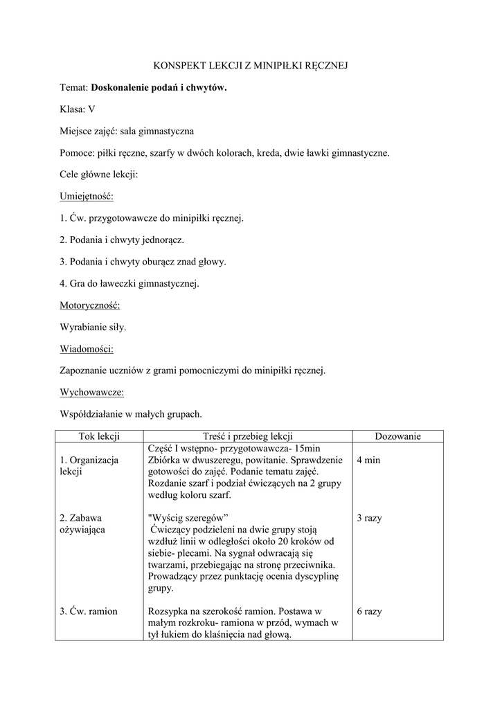 KONSPEKT LEKCJI Z MINIPIŁKI RĘCZNEJ Temat: Doskonalenie podań i chwytów. Klasa: V Miejsce zajęć: sala gimnastyczna Pomoce: piłki ręczne, szarfy w dwóch kolorach, kreda, dwie ławki gimnastyczne. Cele główne lekcji: Umiejętność: 1. Ćw. przygotowawcze do minipiłki ręcznej. 2. Podania i chwyty jednorącz. 3. Podania i chwyty oburącz znad głowy. 4. Gra do ławeczki gimnastycznej. Motoryczność: Wyrabianie siły. Wiadomości: Zapoznanie uczniów z grami pomocniczymi do minipiłki ręcznej. Wychowawcze: Współdziałanie w małych grupach. Tok lekcji 1. Organizacja lekcji Treść i przebieg lekcji Część I wstępno- przygotowawcza- 15min Zbiórka w dwuszeregu, powitanie. Sprawdzenie gotowości do zajęć. Podanie tematu zajęć. Rozdanie szarf i podział ćwiczących na 2 grupy według koloru szarf. Dozowanie 4 min 2. Zabawa ożywiająca "Wyścig szeregów” Ćwiczący podzieleni na dwie grupy stoją wzdłuż linii w odległości około 20 kroków od siebie- plecami. Na sygnał odwracają się twarzami, przebiegając na stronę przeciwnika. Prowadzący przez punktację ocenia dyscyplinę grupy. 3 razy 3. Ćw. ramion Rozsypka na szerokość ramion. Postawa w małym rozkroku- ramiona w przód, wymach w tył łukiem do klaśnięcia nad głową. 6 razy 4. Ćw. nóg W miejscu marsz w rytmie 1-2-3, na 4 przyklęk na nodze zakrocznej, powstań. 6 razy 5. Ćw. tułowia Siad rozkroczny- skłon do przodu z dotknięciem podłoża całymi dłońmi, wytrzymanie i swobodny wyprost. Klęk podparty- marsz rękami (dłońmi) w lewą, prawą stronę. Kolana i nogi znajdują się w jednym miejscu. 8 razy 6. Ćw. mm. brzucha Leżenie przodem- chwyt za topy tyłem, krótkie wytrzymanie i powrót do leżenia. 3 razy 7. Ćw. grzbietu Przysiad podparty- "koci grzbiet"- wznos bioder i opust tułowia. 5 razy 8. Podskoki Postawa zwarta, podskoki zwarte obunóż półobrotem o 180 stopni- powrót. 4 razy 9. Musztra Ćwiczący swobodnie biegają po całym boisku. Na sygnał zmiana kierunku- bieg bokiem, przodem, półobroty, wyskoki itp. Część II- główna 25 min Rozsypka parami. Swobodne podania i chwyty piłki w parach jednorącz znad głowy. Podanie i chwyt jak wyżej ze zwrotem. 1 min Indywidualne kozłowanie piłki w miejscu, w parach; po 10 kozłach zmiana ćwiczącego. Kozłowanie piłki prawą i lewą ręką w rytmie 2x4 w parze na zmianę. Kozłowanie do wysokości pasa. 1 min Ustawienie grup w dwóch parzystych rzędach w odległości 3-4 kroków od siebie. Podania i chwyty w parach piłek półgórnychnon stop. Po ćwiczeniach wszystkie pary stają rzędami po drugiej stronie boiska. Podanie piłek w biegu kolejno parami do linii startu. Zwracać uwagę, że nie należy biec bokiem, tylko przodem i przy podawaniu i wymijaniu piłki patrzeć na współćwiczącego. 4 min 2 piłki. Połowa grupy staje naprzeciw linii mety. Bieg wahadłowy grupy z kozłowaniem piłki jednorącz. Po dobiegnięciu do linii mety przekazujemy piłkę następnemu ćwiczącemu, który biegnie na linię startu. Ćwiczenie trwa do przejścia grup na drugą stronę boiska. Ćwiczenie 5 min 1. Podania i chwyty 2. Kozłowanie 3. Podania i chwyty w ruchu 4. Kozłowanie 3 razy 2 min 1 min 3 min można potraktować jako wyścig grupowy ze współzawodnictwem. 5. Rzuty Każda grupa (podział pierwotny na 4 grupy) kolejno celuje piłką z miejsca do ustawionej ławki z odległości 3- 4 m. Prowadzący liczy trafienia i ogłasza wynik. 4 min 6. Gra "Gra do ławeczki gimnastycznej" Na boisku ustawiamy ławeczki gimnastyczne w odległości 4-5 m od linii pola bramkowego. Gra odbywa sie zgodnie z zasadami minipiłki ręcznej. Uczeń wykonuje strzał (rzut) do bramki. Bramka liczy się, kiedy piłka trafi w deskę ławeczki, blat ławki. Część III- końcowa 5 min Swobodny marsz po boisku z luźnym wymachem ramion w górę, w dół. W marszu swobodny skłon do przodu, wyprost. 5 min Zbiórka w siadzie przed prowadzącym. Omówienie zadań lekcji, wyróżnienie najlepszych. Pożegnanie. 3 min Ćw. uspokajające Zakończenie lekcji 1 min 1 min