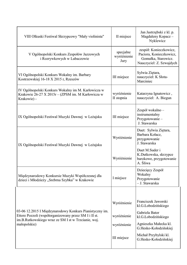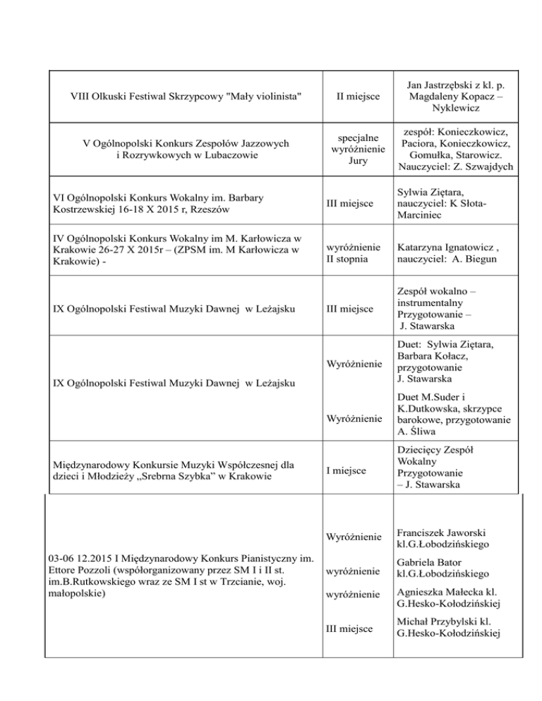 VIII Olkuski Festiwal Skrzypcowy "Mały violinista" II miejsce Jan Jastrzębski z kl. p. Magdaleny Kopacz – Nyklewicz V Ogólnopolski Konkurs Zespołów Jazzowych i Rozrywkowych w Lubaczowie specjalne wyróżnienie Jury zespół: Konieczkowicz, Paciora, Konieczkowicz, Gomułka, Starowicz. Nauczyciel: Z. Szwajdych VI Ogólnopolski Konkurs Wokalny im. Barbary Kostrzewskiej 16-18 X 2015 r, Rzeszów III miejsce Sylwia Ziętara, nauczyciel: K SłotaMarciniec IV Ogólnopolski Konkurs Wokalny im M. Karłowicza w Krakowie 26-27 X 2015r – (ZPSM im. M Karłowicza w Krakowie) - wyróżnienie II stopnia Katarzyna Ignatowicz , nauczyciel: A. Biegun III miejsce Zespół wokalno – instrumentalny Przygotowanie – J. Stawarska Wyróżnienie Duet: Sylwia Ziętara, Barbara Kołacz, przygotowanie J. Stawarska Wyróżnienie Duet M.Suder i K.Dutkowska, skrzypce barokowe, przygotowanie A. Śliwa I miejsce Dziecięcy Zespół Wokalny Przygotowanie – J. Stawarska Wyróżnienie Franciszek Jaworski kl.G.Łobodzińskiego wyróżnienie Gabriela Bator kl.G.Łobodzińskiego wyróżnienie Agnieszka Małecka kl. G.Hesko-Kołodzińskiej III miejsce Michał Przybylski kl. G.Hesko-Kołodzińskiej IX Ogólnopolski Festiwal Muzyki Dawnej w Leżajsku IX Ogólnopolski Festiwal Muzyki Dawnej w Leżajsku Międzynarodowy Konkursie Muzyki Współczesnej dla dzieci i Młodzieży „Srebrna Szybka” w Krakowie 03-06 12.2015 I Międzynarodowy Konkurs Pianistyczny im. Ettore Pozzoli (współorganizowany przez SM I i II st. im.B.Rutkowskiego wraz ze SM I st w Trzcianie, woj. małopolskie) III miejsce Emma Czubak kl. E.Hoffman III miejsce Pola Czubak kl. E.Hoffman II miejsce Hanna Czubak E.Hoffman Wyróżnienie Monika Jaworska kl. S.Krzywickiej (fort.dod.) wyróżnienie wyróżnienie Franciszek Jaworski kl.G.Lobodzińskiego wyróżnienie Piotr Lara kl. M.Wosiek wyróżnienie Sebastian Locher kl. M.Wosiek – wyróżnienie I Ogólnopolski Konkurs Pianistyczny w Trzcianie 11.01.2016 Maja Żurek kl. M. Karbowskiej wyróżnienie wyróżnienie II miejsce II miejsce III miejsce III miejsce III miejsce III miejsce III miejsce III miejsce II miejsce I miejsce I miejsce kl. Wojciech Krzywicki kl.M.Wosiek – Krystyna Ojczenasz kl. E.Hoffman Agnieszka Małecka kl. G.Hesko-Kołodzińskiej Maksymilian Leńczyk Magdalena Surmacz kl. M.Wosiek Wojciech Wais kl. W.Cieciory Pola Czubak - kl. E.Hoffman Karolina Kapusta kl. S.Krzywickiej (fort.dod) Hanna Czubak - kl. E.Hoffman Andrzej Seweryniak – kl. P.Kowala Michał Przybylski kl. G.Hesko-Kołodzińskiej Julia Galos kl. G.HeskoKołodzińskiej Magdalena Surmacz kl. M.Wosiek Emma Czubak - kl. E.Hoffman Daniel Aulak – kl. P.Filka 21 11 2015 V Ogólnopolski Konkurs Pianistyczny im. Karola Nicze w Pabianicach III miejsce Piotr Lara kl. M.Wosiek 5-7 02 2016 Ogólnopolski Konkurs Zespołów Kameralnych „Muzykowanie w Trzcianie” II miejsce Pola Czubak kl. E.Hoffman 5-7 02 2016 Ogólnopolski Konkurs Zespołów Kameralnych „Muzykowanie w Trzcianie” II miejsce Hanna Czubak kl. E.Hoffman III miejsce Agnieszka Małecka kl. G.Hesko-Kołodzińskiej wyróżnienie Maksymilian Leńczyk kl. E.Hoffman III miejsce Michał Gałowicz kl. E.Hoffman 04 04 2015 Konkurs pianistyczny „Inspiracje muzyczne dla klas 1-3 w Lubaczowie 04 04 2015 Konkurs pianistyczny „Inspiracje muzyczne” dla klas 1-3 w Lubaczowie 04 04 2015 Konkurs pianistyczny „Inspiracje muzyczne” dla klas 1-3 w Lubaczowie 01-03.06.2016 III Ogólnopolski Konkurs Pianistyczny im. Moniki Sikorskiej – Wojtacha „Czerwcowe Dźwiękobranie” III miejsce i nagroda Magdalena Surmacz kl. specjalna M.Wosiek 9.02.2016 Międzynarodowye Forum Pianistyczne „Bieszczady bez granic” w Sanoku Dyplom Srebrnego Wirtuoza Agnieszka Małecka – kl. G.Hesko-Kołodzińskiej 09-12.03.2016 Międzynarodowy Konkurs „Srebrna Szybka” w Krakowie I miejsce Piotr Lara – kl. M.Wosiek 09-12.03.2016 Międzynarodowy Konkurs „Srebrna Szybka” w Krakowie II miejsce Maria Stachowska – kl. W.Króla III miejsce Pola Czubak – kl. E.Hoffman III miejsce Emma Czubak – kl. E.Hoffman – I miejsce Magdalena Surmacz – kl. M.Wosiek 09-12.03.2016 Międzynarodowy Konkurs „Srebrna Szybka” w Krakowie 09-12.03.2016 Międzynarodowy Konkurs „Srebrna Szybka” w Krakowie 31 .03.2016 International Music Competition, Belgrad/ Serbia 31.03.2016 International Music Competition, Belgrad/ Serbia I miejsce Piotr Lara – kl. M.Wosiek 01-05.04 2016 VIII Międzynarodowy Konkurs „Giovani Musicisti - Citta di Treviso”we Włoszech, kategoria muzyki współczesnej I miejsce Piotr Lara – kl. M.Wosiek 01-05.2016 VIII Międzynarodowy Konkurs „Giovani Musicisti - Citta di Treviso”we Włoszech, kategoria muzyki współczesnej I miejsce i Premio assoluto Magdalena Surmacz – kl. M.Wosiek 01-05.04 2016 VIII Międzynarodowy Konkurs „Giovani Musicisti - Citta di Treviso”we Włoszech, kategoria muzyki współczesnej II miejsce Maria Stachowska – kl. W.Króla 01-05.04 2016 VIII Międzynarodowy Konkurs „Giovani Musicisti - Citta di Treviso”we Włoszech, kategoria zespoły kameralne I miejsce Maria Stachowska – kl. W.Króla wraz z Sarą Majkowską (skrzypce, klasa J.Piotrowskiej) 30.04.2016 internetowy ’eMuse” Online Music Competition, Ateny/Grecja I miejsce Magdalena Surmacz – kl. M.Wosiek 30.04.2016 internetowy ’eMuse” Online Music Competition, Ateny/Grecja II miejsce Piotr Lara – kl. M.Wosiek 30.04.2016 internetowy ’eMuse” Online Music Competition, Ateny/Grecja III miejsce Agnieszka Małecka – kl. G.Hesko-Kołodzińskiej 30.04.2016 internetowy ’eMuse” Online Music Competition, Ateny/Grecja III miejsce Emma Czubak – kl. E.Hoffman 30.04.2016 internetowy ’eMuse” Online Music Competition, Ateny/Grecja II miejsce Pola Czubak – kl. E.Hoffman 30.04.2016 internetowy ’eMuse” Online Music Competition, Ateny/Grecja III miejsce Hanna Czubak – kl. E.Hoffman 18 05 2016 Międzynarodowy Konkurs im. Janiny Garści w Stalowej Woli II miejsce F