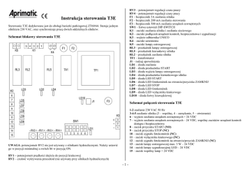 RV3 – potencjometr regulacji czasu pauzy RV4 – potencjometr regulacji czasy pracy F1 – bezpiecznik 5A zasilania silnika F2 – bezpiecznik 200 mA zasilania sterowania F3 – bezpiecznik 500 mA zasilania urządzeń zewnętrznych SW1 – listwa ustawień DIP-SWITCH K1 – zaciski zasilania silnika i zasilania sieciowego K2 – zaciski podłączeń urządzeń kontroli, bezpieczeństwa i sygnalizacji K3 – wejście odbiornika UNICO K4 – zaciski uziemienia K5 – zaciski lampy ostrzegawczej RL3 – przekaźnik lampy ostrzegawczej RL5 – przekaźnik kierunkowy silnika RL2 – przekaźnik zasilania silnika TF1 – transformator J1 – rodzaj spowolnienia LD1 – dioda zasilania LD2 – dioda przekaźnika START LD3 – dioda wyjścia lampy ostrzegawczej LD4 – dioda przekaźnika kierunkowego silnika LD5 – dioda LED START LD6 – dioda LED fotokomórek na otwarciu/przycisku ZAMKNIJ LD7 – dioda LED STOP LD8 – dioda LED fotokomórek LD9 – dioda LED wyłącznika krańcowego LD10 – dioda listwy krawędziowej Instrukcja sterowania T3E Sterowanie T3E dedykowane jest do obsługi barierki parkingowej ZT60/64. Steruje jednym silnikiem 230 VAC, oraz synchronizuje pracę dwóch oddzielnych silników. Schemat blokowy sterowania T3E Schemat połączeń sterowania T3E 1-2 zasilanie 230 VAC 50 Hz 3-4-5 zasilanie silnika (3 – wspólny, 4 – zamykanie, 5 – otwieranie) 6 – wyjście zasilania urządzeń zewnętrznych + 24 VDC 7 – wyjście zasilania urządzeń zewnętrznych – 24 VDC, wspólny zacisków urządzeń kontroli dostępu i bezpieczeństwa 8 – zacisk przycisku START (NO) 9 – zacisk przycisku STOP (NC) 10 – zacisk sygnału fotokomórek (NC) 11 – zacisk wyłącznika krańcowego (NC) 12 – zacisk sygnału fotokomórek na otwarciu/przycisk ZAMKNIJ (NC) 13 – zacisk lampy ostrzegawczej max. 3 W – 24 VDC 14 – zacisk lampy sygnalizacyjnej LED – 24 VDC 15 – zacisk wspólny lamp + 24 VDC UWAGA: potencjometr RV2 nie jest uŜywany z silnikami hydraulicznymi. NaleŜy ustawić go w pozycji minimalnej a switch S6 w pozycję ON. RV1 – potencjometr prędkości dojścia do pozycji krańcowej RV2 – czułość wykrywania przeszkód (nie uŜywany przy silnikach hydraulicznych) -1- Barierka hydrauliczna ze sterowaniem T3E jest fabrycznie przygotowana do pracy z proponowanymi ustawieniami parametrów pracy ustalonymi na potencjometrach RV i suwakach DIP-SWITCH. Aby ustalić parametry pracy uŜytkownika naleŜy je modyfikować wg poniŜszych opisów. Pamiętać naleŜy, Ŝe zmiana ustawień DIP-SWICH wymaga wyłączenia i ponownego załączenia zasilania. UWAGA: wszystkie zaciski NC, jeŜeli nie są wykorzystywane muszą być zmostkowane do masy (9, 10, 11, 12 do 7) Ustawienie parametrów przy pomocy potencjometrów. Potencjometr RV1 – uŜywany przy bramach garaŜowych do spowolnienia ruchu pod koniec fazy otwarcia i zamknięcia. Potencjometr RV2 – uŜywany jako regulacja momentu obrotowego. Zwiększa lub zmniejsza siłę nacisku jako zabezpieczenie przeciwzgnieceniowe. Nie uŜywany przy silnikach hydraulicznych (wartość na minimum, S6 w pozycję ON) Potencjometr RV3 – uŜywany do regulacji czasu pauzy przy automatycznym zamykaniu w zakresie od 0 do 120 sekund. Potencjometr RV4 – uŜywany do regulacji czasu pracy silnika w zakresie od 0 do 180 sekund. Optymalne ustawienie czasu pracy dla szlabanów: ZT64 to 6 sekund, dla szlabanu ZT60 to 12 sekund. Ustawienie parametrów przy pomocy DIP-SWICH SW1 S1 ON OFF ON OFF S2 ON ON OFF OFF Rodzaj pracy Automatyczna Półautomatyczna z zatrzymaniem Półautomatyczna z odwróceniem biegu Dead man Automatyczna: podanie komendy START powoduje otwieranie do pozycji otwartej, zamykanie następuje po upływie czasu pauzy. W trakcie otwierania komenda START jest ignorowana, w trakcie zamykania spowoduje zatrzymanie i powrót do pozycji otwartej. Półautomatyczna z zatrzymaniem: podanie komendy START powoduje otwieranie do pozycji otwartej, zamykanie następuje po ponownej komendzie START. W trakcie otwierania podanie komendy START spowoduje zatrzymanie w danej pozycji, w trakcie zamykania spowoduje zatrzymanie i powrót do pozycji otwartej. Półautomatyczna z odwróceniem biegu: praca półautomatyczna z wykorzystaniem dwóch oddzielnych przycisków OTWÓRZ i ZAMKNIJ. W trakcie zamykania podanie komendy START spowoduje zatrzymanie i powrót do pozycji otwartej. Podanie komendy ZAMKNIJ w trakcie otwierania spowoduje zamknięcie. Dead man: wymaga obecności człowieka. Działanie silnika następuje przy ciągłym naciśnięciu przycisku. Puszczenie przycisku spowoduje zatrzymanie ruchu. -2- NOTATKI: S3 ON OFF Funkcja zacisku 12 Zabezpieczenie w fazie otwierania (np. fotokomórki) Przycisk ZAMKNIJ …………………………………………………………………………………. …………………………………………………………………………………. Wybór funkcji zacisku 12. Podłączenie elementów bezpieczeństwa działających w fazie otwierania lub podłączenie przycisku ZAMKNIJ. …………………………………………………………………………………. …………………………………………………………………………………. S4 ON OFF …………………………………………………………………………………. Przebłyski lampy sygnalizacyjnej 24 VDC LED Funkcja aktywna Funkcja nieaktywna …………………………………………………………………………………. JeŜeli funkcja jest aktywna, to lampa sygnalizacyjna wykonuje serię błysków ostrzegawczych, po 3 sekundach zacznie pracować silnik. Funkcja ta nie działa w przypadku lamp sygnalizacyjnych 230 VAC. …………………………………………………………………………………. …………………………………………………………………………………. S5 ON OFF Odwrócenie pracy Funkcja aktywna Funkcja nieaktywna ……