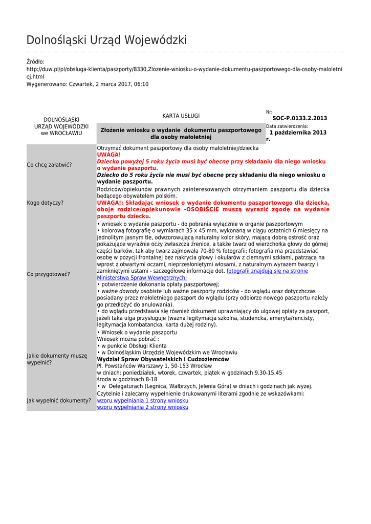 Dolnośląski Urząd Wojewódzki Źródło: http://duw.pl/pl/obsluga-klienta/paszporty/8330,Zlozenie-wniosku-o-wydanie-dokumentu-paszportowego-dla-osoby-maloletni ej.html Wygenerowano: Czwartek, 2 marca 2017, 06:10 DOLNOŚLĄSKI URZĄD WOJEWÓDZKI we WROCŁAWIU Co chcę załatwić? Kogo dotyczy? Co przygotować? Jakie dokumenty muszę wypełnić? Jak wypełnić dokumenty? KARTA USŁUGI Nr: SOC-P.0133.2.2013 Data zatwierdzenia: Złożenie wniosku o wydanie dokumentu paszportowego 1 października 2013 dla osoby małoletniej r. Otrzymać dokument paszportowy dla osoby małoletniej/dziecka UWAGA! Dziecko powyżej 5 roku życia musi być obecne przy składaniu dla niego wniosku o wydanie paszportu. Dziecko do 5 roku życia nie musi być obecne przy składaniu dla niego wniosku o wydanie paszportu. Rodziców/opiekunów prawnych zainteresowanych otrzymaniem paszportu dla dziecka będącego obywatelem polskim. UWAGA!: Składając wniosek o wydanie dokumentu paszportowego dla dziecka, oboje rodzice/opiekunowie -OSOBIŚCIE muszą wyrazić zgodę na wydanie paszportu dziecku. • wniosek o wydanie paszportu - do pobrania wyłącznie w organie paszportowym • kolorową fotografię o wymiarach 35 x 45 mm, wykonaną w ciągu ostatnich 6 miesięcy na jednolitym jasnym tle, odwzorowującą naturalny kolor skóry, mającą dobrą ostrość oraz pokazujące wyraźnie oczy zwłaszcza źrenice, a także twarz od wierzchołka głowy do górnej części barków, tak aby twarz zajmowała 70-80 % fotografii; fotografia ma przedstawiać osobę w pozycji frontalnej bez nakrycia głowy i okularów z ciemnymi szkłami, patrzącą na wprost z otwartymi oczami, nieprzesłoniętymi włosami, z naturalnym wyrazem twarzy i zamkniętymi ustami - szczegółowe informacje dot. fotografii znajdują się na stronie Ministerstwa Spraw Wewnętrznych; • potwierdzenie dokonania opłaty paszportowej; • ważne dowody osobiste lub ważne paszporty rodziców - do wglądu oraz dotyczhczas posiadany przez małoletniego paszport do wglądu (przy odbiorze nowego paszportu należy go przedłożyć do anulowania). • do wglądu przedstawia się również dokument uprawniający do ulgowej opłaty za paszport, jeżeli taka ulga przysługuje (ważna legitymacja szkolna, studencka, emeryta/rencisty, legitymacja kombatancka, karta dużej rodziny). • Wniosek o wydanie paszportu Wniosek można pobrać : • w punkcie Obsługi Klienta • w Dolnośląskim Urzędzie Wojewódzkim we Wrocławiu Wydział Spraw Obywatelskich i Cudzoziemców Pl. Powstańców Warszawy 1, 50-153 Wrocław w dniach: poniedziałek, wtorek, czwartek, piątek w godzinach 9.30-15.45 środa w godzinach 8-18 • w Delegaturach (Legnica, Wałbrzych, Jelenia Góra) w dniach i godzinach jak wyżej. Czytelnie i zalecamy wypełnienie drukowanymi literami zgodnie ze wskazówkami: wzoru wypełniania 1 strony wniosku wzoru wypełniania 2 strony wniosku Ile muszę zapłacić? Kiedy złożyć dokumenty? Gdzie załatwię sprawę? • Opłata ulgowa za paszport biometryczny dla dzieci do 13 roku życia (od 7 roku życia wymagana jest ważna legitymacja uczniowska) - 30 zł W przypadku braku ważnej legitymacji uczniowskiej - 60 zł • Opłata ulgowa za paszport dla osób powyżej 13 roku życia, po okazaniu odpowiedniego ważnego dokumentu będącego podstawą do ulgowej opłaty 70 zł W przypadku braku legitymacji uczniowskiej - 140 zł • opłata paszportowa dla posiadaczy Karty Dużej Rodziny Opłaty można dokonać w kasie Dolnośląskiego Urzędu Wojewódzkiego. Proponujemy aby przed wizytą w urzędzie dokonać opłaty paszportowej np. w formie przelewu na konto wpisując w tytuł przelewu imię i nazwisko osoby ubiegającej się o dokument paszportowy a następnie przynieść do złożenia wniosku wydrukowane potwierdzenie przelewu. Przelew na rachunek bankowy Dolnośląskiego Urzędu Wojewódzkiego we Wrocławiu na konto: Dolnośląski Urząd Wojewódzki Wydział Organizacji i Rozwoju Pl. Powstańców Warszawy 1 50-153 Wrocław NBP O/O Wrocław 42 1010 1674 0000 7122 3100 0000 Ponadto w Oddziale Paszportowym we Wrocławiu w sąsiedztwie poczekalni znajduje się stanowisko internetowe umożliwiające dokonanie przelewu. UWAGA: (brak możliwości opłaty kartą płatniczą) Zapraszamy wszystkich klientów o składanie wniosków paszportowych przed sezonem letnim (maj-sierpień). Dzięki temu unikniecie Państwo kolejek i długiego oczekiwania na dokument paszportowy. Oddział Paszportowy Wrocław Pl. Powstańców Warszawy 1 Infolinia Wydziału Spraw Obywatelskich i Cudzoziemców 0 801 43 00 86 adres e-mail: [email protected] Oddziały Zamiejscowe: • Jelenia Góra ul. Piłsudskiego 12 • Legnica ul. F. Skarbka 3 • Wałbrzych ul. Słowackiego 23a Co zrobi Urząd? Jaki jest czas reakcji? Jak się odwołać? Oddziały Paszportowe Dolnośląskiego Urzędu Wojewódzkiego obsługują Klientów: • poniedziałek, wtorek, czwartek, piątek - w godzinach 9.30-15.45 • środa - w godzinach 8-18 W przypadku braków formalnych w dostarczonej do wniosku paszportowego dokumentacji otrzymacie Państwo pismo o konieczności uzupełnienia wniosku w terminie 7 dni od dnia doręczenia zawiadomienia. Organ paszportowy przyjmuje wniosek, następnie weryfikuje poprawność danych osobowych oraz kieruje wniosek do realizacji w celu personalizacji dokumentu paszportowego. Rodzice/opiekunowie prawni małoletniego, który nie ukończył 5 lat otrzymują paszport z terminem ważności 5 lat. Rodzice/opiekunowie prawni małoletniego, który ukończył 5 lat a nie ukończył 13 roku życia otrzymują paszport z terminem ważności 5 lat. Rodzice/opiekunowie prawni małoletniego, który ukończył 13 rok życia otrzymują paszport z terminem ważności 10 lat. Maksymalny czas oczekiwania na dokument wynosi 30 dni. Informację na temat etapu realizacji wydania paszportu można sprawdzić na stronie internetowej www.paszporty.mswia.gov.pl lub kontaktując się z organem paszportowym (telefonicznie lu