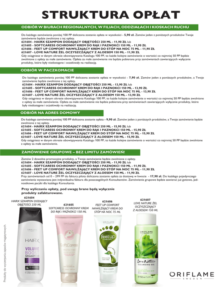 STRUKTURA OPŁAT ODBIÓR W BIURACH REGIONALNYCH, W FILIACH, ODDZIA¸ACH I KIOSKACH RUCHU Do ka˝dego zamówienia poni˝ej 100 PP doliczona zostanie opłata w wysokoÊci - 5,90 zł. Zamów jeden z poni˝szych produktów Twoje zamówienie b´dzie zwolnione z tej opłaty. 621604 - HAIRX SZAMPON DODAJÑCY OBJ¢TOÂCI 250 ML - 11,90 ZŁ lub 621605 - SOFTCARESS OCHRONNY KREM DO RÑK I PAZNOKCI 150 ML - 11,90 ZŁ 621606 - FEET UP COMFORT NAWIL˚AJÑCY KREM DO STÓP NA NOC 75 ML - 11,90 ZŁ 621607 - LOVE NATURE ˚EL OCZYSZCZAJÑCY Z ALOESEM 150 ML - 11,90 ZŁ Gdy osiàgniesz w danym okresie obowiàzywania Katalogu 100 PP, to ka˝de kolejne zamówienie o wartoÊci co najmniej 50 PP b´dzie zwolnione z opłaty za małe zamówienie. Opłata za małe zamówienie nie b´dzie pobierana przy zamówieniach zawierajàcych wyłàcznie produkty, które były niedost´pne i oczekiwały na realizacj´. ODBIÓR W PACZKOMACIE Do ka˝dego zamówienia poni˝ej 100 PP doliczona zostanie op∏ata w wysokoÊci - 7,90 z∏. Zamów jeden z poni˝szych produktów, a Twoje zamówienie b´dzie zwolnione z tej op∏aty. 621604 - HAIRX SZAMPON DODAJÑCY OBJ¢TOÂCI 250 ML - 13,90 ZŁ lub 621605 - SOFTCARESS OCHRONNY KREM DO RÑK I PAZNOKCI 150 ML - 13,90 ZŁ 621606 - FEET UP COMFORT NAWIL˚AJÑCY KREM DO STÓP NA NOC 75 ML - 13,90 ZŁ 621607 - LOVE NATURE ˚EL OCZYSZCZAJÑCY Z ALOESEM 150 ML - 13,90 ZŁ Gdy osiàgniesz w danym okresie obowiàzywania Katalogu 100 PP, to ka˝de kolejne zamówienie o wartoÊci co najmniej 50 PP b´dzie zwolnione z opłaty za małe zamówienie. Opłata za małe zamówienie nie b´dzie pobierana przy zamówieniach zawierajàcych wyłàcznie produkty, które były niedost´pne i oczekiwały na realizacj´. ODBIÓR NA ADRES DOMOWY Do ka˝dego zamówienia poni˝ej 100 PP doliczona zostanie opłata - 9,90 zł. Zamów jeden z poni˝szych produktów, a Twoje zamówienie b´dzie zwolnione z tej opłaty. 621604 - HAIRX SZAMPON DODAJÑCY OBJ¢TOÂCI 250 ML - 15,90 ZŁ lub 621605 - SOFTCARESS OCHRONNY KREM DO RÑK I PAZNOKCI 150 ML - 15,90 ZŁ 621606 - FEET UP COMFORT NAWIL˚AJÑCY KREM DO STÓP NA NOC 75 ML - 15,90 ZŁ 621607 - LOVE NATURE ˚EL OCZYSZCZAJÑCY Z ALOESEM 150 ML - 15,90 ZŁ Gdy osiàgniesz w danym okresie obowiàzywania Katalogu 100 PP, to ka˝de kolejne zamówienie o wartoÊci co najmniej 50 PP b´dzie zwolnione z opłaty za małe zamówienie. ZAMÓWIENIE GRUPOWE – BEZ LIMITU ZAMÓWIE¡! Zamów 2 dowolne promocyjne produkty, a Twoje zamówienie b´dzie zwolnione z opłaty. 621604 - HAIRX SZAMPON DODAJÑCY OBJ¢TOÂCI 250 ML - 11,90 ZŁ lub 621605 - SOFTCARESS OCHRONNY KREM DO RÑK I PAZNOKCI 150 ML - 11,90 ZŁ 621606 - FEET UP COMFORT NAWIL˚AJÑCY KREM DO STÓP NA NOC 75 ML - 11,90 ZŁ 621607 - LOVE NATURE ˚EL OCZYSZCZAJÑCY Z ALOESEM 150 ML - 11,90 ZŁ Przy zamówieniach od 0 – 299 PP do faktury pilota doliczona zostanie opłata za dostaw´ w kwocie - 17,90 zł. Do ka˝dego pojedynczego zamówienia wystawiana jest indywidualna faktura dla poszczególnych Konsultantów. Zamówienie grupowe b´dzie zawieraç ju˝ gotowe, jednostkowe paczki dla ka˝dego Konsultanta. Przy wyliczaniu opłaty, pod uwag´ brane b´dà wyłàcznie produkty zafakturowane. Produkty do wyczerpania zapasów magazynowych. 621604 HAIRX SZAMPON DODAJÑCY OBJ¢TOÂCI 250 ML 621605 SOFTCARESS OCHRONNY KREM DO RÑK I PAZNOKCI 150 ML 621606 FEET UP COMFORT NAWIL˚AJÑCY KREM DO STÓP NA NOC 75 ML 621607 LOVE NATURE ˚EL OCZYSZCZAJÑCY Z ALOESEM 150 ML