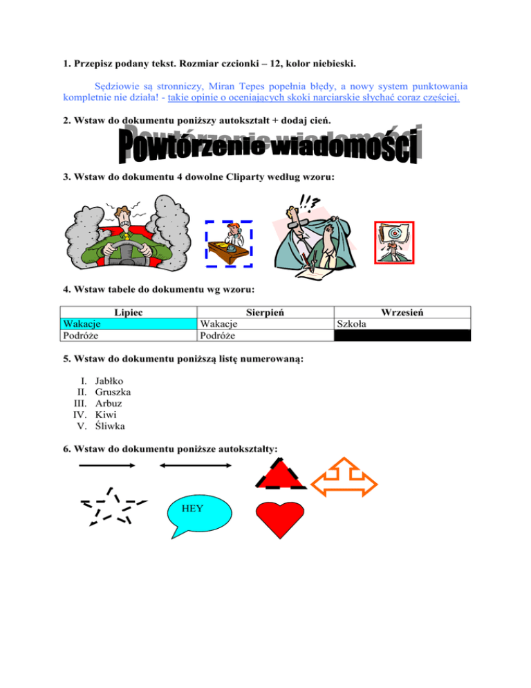 1. Przepisz podany tekst. Rozmiar czcionki – 12, kolor niebieski. Sędziowie są stronniczy, Miran Tepes popełnia błędy, a nowy system punktowania kompletnie nie działa! - takie opinie o oceniających skoki narciarskie słychać coraz częściej. 2. Wstaw do dokumentu poniższy autokształt + dodaj cień. 3. Wstaw do dokumentu 4 dowolne Cliparty według wzoru: 4. Wstaw tabele do dokumentu wg wzoru: Lipiec Wakacje Podróże Sierpień Wakacje Podróże 5. Wstaw do dokumentu poniższą listę numerowaną: I. II. III. IV. V. Jabłko Gruszka Arbuz Kiwi Śliwka 6. Wstaw do dokumentu poniższe autokształty: HEY Wrzesień Szkoła