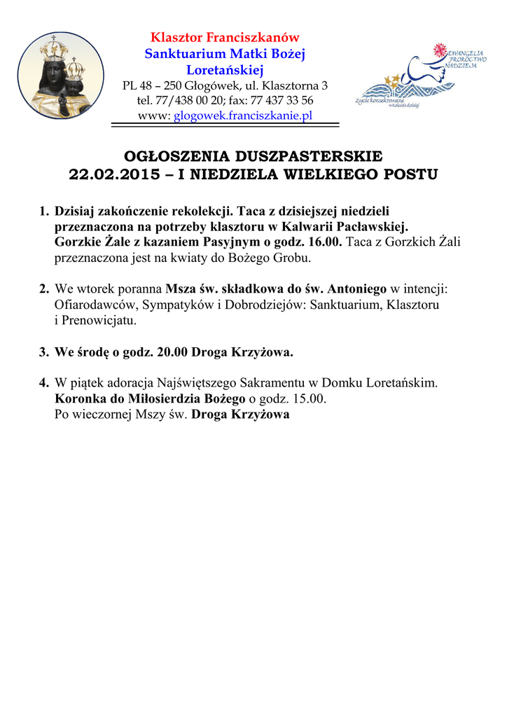 Klasztor Franciszkanów Sanktuarium Matki Bożej Loretańskiej PL 48 – 250 Głogówek, ul. Klasztorna 3 tel. 77/438 00 20; fax: 77 437 33 56 www: glogowek.franciszkanie.pl OGŁOSZENIA DUSZPASTERSKIE 22.02.2015 – I NIEDZIELA WIELKIEGO POSTU 1. Dzisiaj zakończenie rekolekcji. Taca z dzisiejszej niedzieli przeznaczona na potrzeby klasztoru w Kalwarii Pacławskiej. Gorzkie Żale z kazaniem Pasyjnym o godz. 16.00. Taca z Gorzkich Żali przeznaczona jest na kwiaty do Bożego Grobu. 2. We wtorek poranna Msza św. składkowa do św. Antoniego w intencji: Ofiarodawców, Sympatyków i Dobrodziejów: Sanktuarium, Klasztoru i Prenowicjatu. 3. We środę o godz. 20.00 Droga Krzyżowa. 4. W piątek adoracja Najświętszego Sakramentu w Domku Loretańskim. Koronka do Miłosierdzia Bożego o godz. 15.00. Po wieczornej Mszy św. Droga Krzyżowa