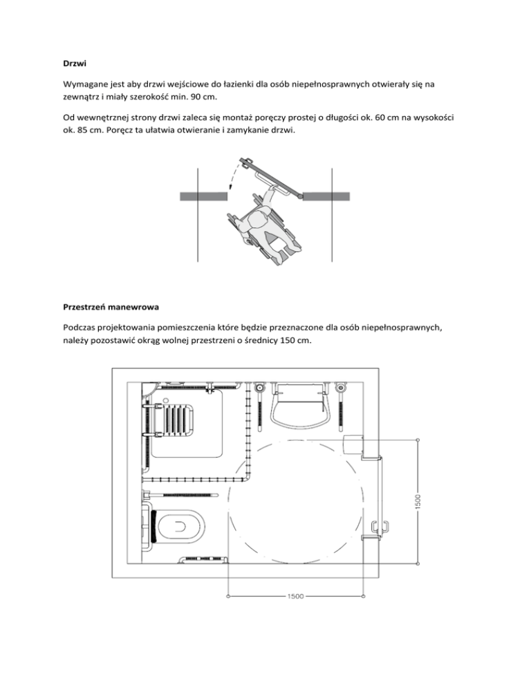 Drzwi Wymagane jest aby drzwi wejściowe do łazienki dla osób niepełnosprawnych otwierały się na zewnątrz i miały szerokość min. 90 cm. Od wewnętrznej strony drzwi zaleca się montaż poręczy prostej o długości ok. 60 cm na wysokości ok. 85 cm. Poręcz ta ułatwia otwieranie i zamykanie drzwi. Przestrzeń manewrowa Podczas projektowania pomieszczenia które będzie przeznaczone dla osób niepełnosprawnych, należy pozostawić okrąg wolnej przestrzeni o średnicy 150 cm. Strefa umywalkowa – wymagania wg. norm DIN - dostęp do umywalki musi być zapewniony z pozycji siedzącej - pod umywalką musi być miejsce na nogi i częściowo na wózek inwalidzki - kształt i wymiary umywalki muszą pozwalać na wygodne oparcie łokci na umywalce Poręcze przy umywalce należy montować po bokach w odległości ok. 40-45 cm od osi umywalki. Wysokość montażu poręczy powinna wynosić ok. 80-85 cm od posadzki do górnej krawędzi poręczy. Wymagane jest lustro uchylne (z możliwością regulacji przez użytkownika) w celu prawidłowego ustawienia kąta dla osoby siedzącej na wózku inwalidzkim. Zalecana wysokość montażu lustra to ok. 95 cm od posadzki. Strefa WC Wymagane jest aby WC miało długość nie mniejszą niż 70 cm, oraz wysokość siedziska znajdowało się na poziomie 48 cm (razem z deską). W przypadku montażu WC na stelażu należy tak zamontować podwieszany WC aby uzyskać ww. wysokość poziomu siedziska. W przypadku braku możliwości zamocowania poręczy do ściany (np. z powodu karton gipsu, stelaża, rur itp.), należy zastosować poręcze montowane do podłogi. Ww. poręcze montowane do podłogi mają już stałą wysokość ustawioną przez producenta. Poręcze montowane do ściany należy mocować podobnie jak przy strefie umywalkowej tj. ok. 35-45 cm od osi WC. W zasięgu ręki musi znajdować się papier toaletowy, przycisk do spłuczki, oraz jeśli wymagany – przycisk do przywołania pomocy. Zalecany jest montaż dwóch poręczy uchylnych przy WC. Ze względu na wymaganą długość WC – 70 cm, poręcze montowane przy WC nie powinny być krótsze niż 70 cm, czyli powinny być długości WC lub wystawać przed WC do 15 cm. Wymiar ten nie dotyczy poręczy montowanych do podłogi które montuje się w odległości ok. 10 cm od ściany ze względu na możliwość przemieszczenia stopy mocującej. Poręcz uchylna powinna być zamontowana od strony gdzie jest więcej miejsca i gdzie osoba niepełnosprawna będzie mogła podjechać wózkiem tyłem i po podniesieniu poręczy będzie mogła przesiąść się z wózka na WC. Sposoby przesiadania się na WC przez osobę niepełnosprawną W przypadku odległości od osi WC do ściany mniejszej lub równej niż 45 cm, możliwe jest zamocowanie poręczy na ścianie bocznej. Na ww. ścianie bocznej można zamontować poręcz prostą, jednak lepszym rozwiązaniem jest montaż poręczy w kształcie litery L. Wysokość poręczy od posadzki powinna wynosić ok. 80-85 cm do górnej krawędzi poręczy. W przypadku montażu poręczy do ściany za WC, oprócz montażu na wysokości ok. 80-85 cm, należy pamiętać o odległości po bokach ok. 35-45 cm od osi WC. Strefa prysznicowa Strefa prysznicowa powinna mieć powierzchnię min. 90x90 cm. Najlepszym rozwiązaniem konstrukcji podłoża strefy prysznicowej jest brodzik bezprogowy. Taki brodzik umożliwia częściowe wjechanie wózkiem w strefę prysznicową i komfortowe zajęcie miejsca na siedzisku pod prysznicem przez osobę niepełnosprawną. Wymagane jest aby w strefie znalazło się siedzisko dla osoby niepełnosprawnej i min. jedna poręcz ułatwiająca przesiadanie się na siedzisko. Siedzisko może być montowane na stałe do ściany lub zawieszane na poręczy, jak również z oparciem lub bez oparcia. Zalecana wysokość montażu siedziska to ok. 46-48 cm od poziomu brodzika. Strefa wannowa W celu wygodnego korzystania z wanny zalecane jest zastosowanie siedziska nawannowego. Siedzisko to umożliwia komfortowe i bezpieczne korzystanie z wanny przez osobę niepełnosprawną. Aby komfortowo przesiąść się na siedzisko wymagane jest aby na ścianie zamocowana była min. jedna poręcz o długości min. 60 cm. Poręcz należy zamocować min. 10 cm nad wanną. Dodatkowa poręcz – w poprzek wanny ułatwia przemieszczanie się i zwiększa bezpieczeństwo osoby korzystającej z wanny. Przykładowe aranżacje