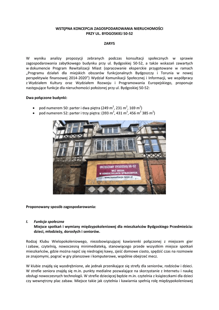 WSTĘPNA KONCEPCJA ZAGOSPODAROWANIA NIERUCHOMOŚCI PRZY UL. BYDGOSKIEJ 50-52 ZARYS W wyniku analizy propozycji zebranych podczas konsultacji społecznych w sprawie zagospodarowania zabytkowego budynku przy ul. Bydgoskiej 50-52, a także wskazań zawartych w dokumencie Program Rewitalizacji Miast (opracowanie eksperckie przygotowane w ramach „Programu działań dla miejskich obszarów funkcjonalnych Bydgoszczy i Torunia w nowej perspektywie finansowej 2014-2020”) Wydział Komunikacji Społecznej i Informacji, we współpracy z Wydziałem Kultury oraz Wydziałem Rozwoju i Programowania Europejskiego, proponuje następujące funkcje dla nieruchomości położonej przy ul. Bydgoskiej 50-52: Dwa połączone budynki: pod numerem 50: parter i dwa piętra (249 m2, 231 m2, 169 m2) pod numerem 52: parter i trzy piętra: (393 m2, 431 m2, 456 m2 385 m2) Proponowany sposób zagospodarowania: I. Funkcja społeczna Miejsce spotkań i wymiany międzypokoleniowej dla mieszkańców Bydgoskiego Przedmieścia: dzieci, młodzieży, dorosłych i seniorów. Rodzaj Klubu Wielopokoleniowego, niezobowiązującej kawiarenki połączonej z miejscem gier i zabaw, czytelnią, nowoczesną minimediateką, stanowiącego przede wszystkim miejsce spotkań mieszkańców, gdzie można napić się niedrogiej kawy, zjeść domowe ciasto, spędzić czas na rozmowie ze znajomymi, pograć w gry planszowe i komputerowe, wspólnie obejrzeć mecz. W klubie znajdą się wyodrębnione, ale jednak przenikające się strefy dla seniorów, rodziców i dzieci. W strefie seniora znajdą się m.in. punkty medialne pozwalające na skorzystanie z Internetu i naukę obsługi nowoczesnych technologii. W strefie dziecięcej będzie m.in. czytelnia z książeczkami dla dzieci czy wewnętrzny plac zabaw. Miejsce takie jak czytelnia i kawiarnia spełnią rolę międzypokoleniowej platformy wymiany doświadczeń - w czytelni będą np. organizowanie spotkania, na których seniorzy czytaliby książki małym dzieciom. Czytelnia dawałaby dodatkowo możliwość skorzystania z nowoczesnych audiobooków, elektronicznych czytników książek, itp. Odbywać się tu będą cykliczne spotkania z autorami książek, które właśnie ukazują się na rynku wydawniczym. W kawiarni zafunkcjonuje modny bookcrossing - nieodpłatne przekazywanie książek poprzez pozostawianie ich w miejscu publicznym, by znalazca mógł je przeczytać i przekazać dalej. Miejsce zostanie urządzone nowocześnie i wygodnie. Przy klubie będzie także działać Centrum Informacyjne Rewitalizacji, którego utworzenie jest planowane w ramach opracowywania Programu Rewitalizacji Torunia do roku 2020. Zadania „CIR” obejmą m.in.: pełnienie roli pierwszego punktu informacji o planach i działaniach rewitalizacyjnych; pełnienie roli centrum spotkań różnych grup interesariuszy w celu zapewnienia ciągłości komunikacji pomiędzy stronami zaangażowanymi w proces; zbieranie danych na temat potrzeb, oczekiwań mieszkańców/interesariuszy stanowiących wkład w diagnozę obszaru wskazywanego do rewitalizacji; organizowanie konsultacji społecznych, warsztatów, spacerów badawczych; przeprowadzanie ankiet i obserwacji; realizacja projektów własnych z zakresu działań społecznych i infrastrukturalnych; monitoring realizacji projektów rewitalizacyjnych; współpraca z Koordynatorem rewitalizacji w celu synchronizacji działań w odniesieniu do całego Programu. Poniżej zdjęcie przedstawiające przykładowe rozwiązanie zaaranżowania wnętrza czytelni dla dzieci z nietypowymi siedziskami, czytelni, gdzie każdy może czytać książki, gdzie chce oraz przykład zaaranżowania kawiarni z czytelnią: Należy tu zaplanować także sale umożliwiające organizowanie spotkań, prelekcji, niedużych konferencji. Przewidzieć możliwość łączenia i dzielenia pomieszczeń, łatwej zmiany funkcji, łatwej aranżacji mebli i krzeseł do różnych układów (kinowy, stolikowy, itp.). Wyposażyć w nowoczesny sprzęt multimedialny i prezentacyjny. W budynku powinna znaleźć się także sala taneczna, która byłaby wykorzystywana częściowo na zajęcia prowadzone przez organizacje pozarządowe, np. warsztaty taneczne dla młodzieży oraz dla instytucji prowadzących częściowo odpłatną działalność w tym zakresie, a także na cele komercyjne dla szkół tańca, które będą płacić czynsz najmu wg cen rynkowych. W miejscu tym mogłyby być organizowane również potańcówki i imprezy taneczne dla mieszkańców, na których torunianie mogliby pobawić się przy dźwiękach starych i nowych przebojów - co będzie dobrym nawiązaniem do tradycji organizowania wieczorków tanecznych na Bydgoskiem. Sala taneczna może być także wynajmowana podmiotom prywatnym np. na organizację imprezy sylwestrowej. Przy sali będą funkcjonować pomieszczenia socjalne, gospodarcze (w tym przebieralnia dla uczestników warsztatów tanecznych). Należy także wziąć pod uwagę potrzebę urządzenia małej sali tanecznej - do organizacji indywidualnych zajęć techniki tańca. Przestrzeń na parterze pełniłaby także dodatkowe funkcje, przede wszystkim ekspozycyjne, pozwalając na prezentację efektów działań prowadzonych w budynku. W razie potrzeby zamieniałaby się także w scenę prób i prezentacji teatralnych i muzycznych. Sala taneczna mogłaby też być używana na zajęcia sportowe i rekreacyjne, które odbywałyby się do południa, np. zajęcia fitness (zajęcia dla mam z małymi dziećmi, warsztaty zumba dla wszystkich, zumba cardio dla seniorów), warsztaty capoiery dla młodzieży, zajęcia z jogi (np. sesje jogi śmiechu), ćwiczenia z samoobrony dla seniorów. II. Funkcja kulturalna Pracownie artystów i warsztaty edukacji kulturalnej Miejsce przeznaczone na działalność Centrum Edukacji Kulturalnej, w którym realizowane będą programy edukacji kulturalnej dla dzieci i młodzieży oraz seniorów. CEK umożliwi tworzenie nowych projektów artystycznych, wypromuje k