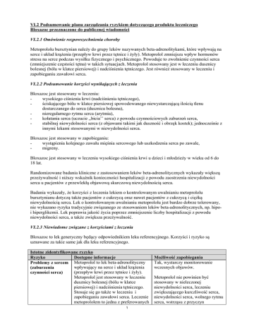 VI.2 Podsumowanie planu zarządzania ryzykiem dotyczącego produktu leczniczego Bloxazoc przeznaczone do publicznej wiadomości VI.2.1 Omówienie rozpowszechnienia choroby Metoprololu bursztynian należy do grupy leków nazywanych beta-adrenolitykami, które wpływają na serce i układ krążenia (przepływ krwi przez tętnice i żyły). Metoprolol zmniejsza wpływ hormonów stresu na serce podczas wysiłku fizycznego i psychicznego. Powoduje to zwolnienie czynności serca (zmniejszenie częstości tętna) w takich sytuacjach. Metoprolol stosowany jest w leczeniu dusznicy bolesnej (bólu w klatce piersiowej) i nadciśnienia tętniczego. Jest również stosowany w leczeniu i zapobieganiu zawałowi serca. VI.2.2 Podsumowanie korzyści wynikających z leczenia Bloxazoc jest stosowany w leczeniu: wysokiego ciśnienia krwi (nadciśnienia tętniczego), ściskającego bólu w klatce piersiowej spowodowanego niewystarczającą ilością tlenu dostarczanego do serca (dusznica bolesna), nieregularnego rytmu serca (arytmia), kołatania serca (uczucie ,,bicia’’ serca) z powodu czynnościowych zaburzeń serca, stabilnej niewydolności serca (z objawami takimi jak duszność i obrzęk kostek); jednocześnie z innymi lekami stosowanymi w niewydolności serca. Bloxazoc jest stosowany w zapobieganiu: wystąpienia kolejnego zawału mięśnia sercowego lub uszkodzenia serca po zawale, migreny. Bloxazoc jest stosowany w leczeniu wysokiego ciśnienia krwi u dzieci i młodzieży w wieku od 6 do 18 lat. Randomizowane badania kliniczne z zastosowaniem leków beta-adrenolitycznych wykazały większą przeżywalność i niższy wskaźnik konieczności hospitalizacji z powodu zaostrzenia niewydolności serca u pacjentów z przewlekłą objawową skurczową niewydolnością serca. Badania wykazały, że korzyści z leczenia lekiem o kontrolowanym uwalnianiu metoprololu bursztynianu dotyczą także pacjentów z cukrzycą oraz nawet pacjentów z cukrzycą i ciężką niewydolnością serca. Lek o kontrolowanym uwalnianiu metoprololu jest bardzo dobrze tolerowany, nie wykazano ryzyka tradycyjnie związanego ze stosowaniem leków beta-adrenolitycznych, np. hipoi hiperglikemii. Lek poprawia jakość życia poprzez zmniejszenie liczby hospitalizacji z powodu niewydolności serca, a także zwiększa przeżywalność. VI.2.3 Niewiadome związane z korzyściami z leczenia Bloxazoc to lek generyczny będący odpowiednikiem leku referencyjnego. Korzyści i ryzyko są uznawane za takie same jak dla leku referencyjnego. Istotne zidentyfikowane ryzyko Ryzyko Dostępne informacje Problemy z sercem Metoprolol to lek beta-adrenolityczny wpływający na serce i układ krążenia (zaburzenia (przepływ krwi przez tętnice i żyły). czynności serca) Metoprolol jest stosowany w leczeniu dusznicy bolesnej (bólu w klatce piersiowej) i nadciśnienia tętniczego. Stosuje się go także w leczeniu i zapobieganiu zawałowi serca. Leczenie metoprololem to jedna z preferowanych 1 Możliwość zapobiegania Tak, wystarczy monitorowanie wczesnych objawów. Metoprolol nie powinien być stosowany w nieleczonej niewydolności serca, leczeniu zwiększającego kurczliwość serca, niewydolności serca, wolnego rytmu serca, wstrząsu z przyczyn Istotne zidentyfikowane ryzyko Ryzyko Dostępne informacje terapii pierwszego rzutu u pacjentów z nadciśnieniem tętniczym i chorobą niedokrwienną serca, niewydolnością serca lub cukrzycą. U pacjentów z chorobami serca kurczliwość serca może być zmniejszona, zatem dalsze jej zmniejszanie może zwiększać ryzyko dodatkowych zaburzeń pracy serca. Jednakże choroby serca są spodziewanym efektem długotrwale utrzymującego się nadciśnienia tętniczego i dusznicy bolesnej. Możliwość zapobiegania sercowych, zaburzeniach przewodnictwa lub rytmu serca (zespół chorego węzła zatokowoprzedsionkowego), ciężkich zaburzeń krążenia (zaawansowana choroba tętnic obwodowych), niskiego ciśnienia tętniczego. Należy poinformować lekarza lub farmaceutę jeśli u pacjenta występują: zaburzenia krążenia krwi, które mogą powodować uczucie mrowienia, zasinienie lub bladość palców rąk i stóp, ściskający ból w klatce piersiowej, zazwyczaj w nocy (dławica piersiowa typu Prinzmetala), zaburzenia przewodzenia serca (blok serca), niewydolność serca. Należy powiedzieć lekarzowi lub farmaceucie o wszystkich lekach stosowanych przez pacjenta obecnie lub ostatnio, a także o lekach, które pacjent planuje przyjmować. Następujące leki mogą nasilić działanie obniżające ciśnienie krwi: leki nasercowe. Nagłe zwężenie dróg oddechowych poprzez skurcz oskrzeli (skurcz oskrzeli) Rzadko występujący (zazwyczaj Na ogół leki beta-adrenolityczne nie powinny być stosowane u pacjentów z chorobami bronchospastycznymi. Blokada receptorów beta może niekorzystnie wpływać na czynność płuc, zmniejsza wpływ katecholamin rozszerzających oskrzela przez stymulację receptorów beta 2 . Jeśli leczenie lekami beta-adrenolitycznymi jest niezbędne, bezpieczniejsze jest stosowanie leku działającego selektywnie na receptory beta 1 (np. metoprololu), jednak i tak konieczne jest zachowanie ostrożności. Kardioselektywność leku nie jest całkowita i może zostać osłabiona przy większych dawkach. Guz chromochłonny to rodzaj guza nadnercza, powodujący zwiększone wydzielanie adrenaliny i noradrenaliny. 2 Jak każdy lek, lek ten może powodować działania niepożądane, chociaż nie u każdego one wystąpią. Tak, wystarczy monitorowanie wczesnych objawów. Metoprololu nie należy stosować u pacjentów z ciężką postacią astmy lub POChP (przewlekłą obturacyjną chorobą płuc). Należy poinformować lekarza lub farmaceutę o występowaniu astmy. Należy powiedzieć lekarzowi lub farmaceucie o wszystkich lekach stosowanych przez pacjenta obecnie lub ostatnio, a także o lekach, które pacjent planuje przyjmować. Jak każdy lek, lek ten może powodować działania niepożądane