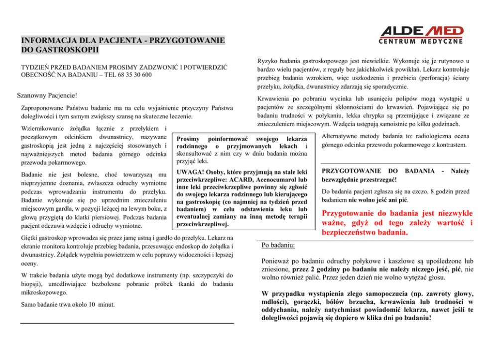 INFORMACJA DLA PACJENTA - PRZYGOTOWANIE DO GASTROSKOPII TYDZIEŃ PRZED BADANIEM PROSIMY ZADZWONIĆ I POTWIERDZIĆ OBECNOŚĆ NA BADANIU – TEL 68 35 30 600 Szanowny Pacjencie! Zaproponowane Państwu badanie ma na celu wyjaśnienie przyczyny Państwa dolegliwości i tym samym zwiększy szansę na skuteczne leczenie. Ryzyko badania gastroskopowego jest niewielkie. Wykonuje się je rutynowo u bardzo wielu pacjentów, z reguły bez jakichkolwiek powikłań. Lekarz kontroluje przebieg badania wzrokiem, więc uszkodzenia i przebicia (perforacja) ściany przełyku, żołądka, dwunastnicy zdarzają się sporadycznie. Krwawienia po pobraniu wycinka lub usunięciu polipów mogą wystąpić u pacjentów ze szczególnymi skłonnościami do krwawień. Pojawiające się po badaniu trudności w połykaniu, lekka chrypka są przemijające i związane ze znieczuleniem miejscowym. Wzdęcia ustępują samoistnie po kilku godzinach. Wziernikowanie żołądka łącznie z przełykiem i początkowym odcinkiem dwunastnicy, nazywane gastroskopią jest jedną z najczęściej stosowanych i najważniejszych metod badania górnego odcinka przewodu pokarmowego. Prosimy poinformować swojego lekarza rodzinnego o przyjmowanych lekach i skonsultować z nim czy w dniu badania można przyjąć leki. Alternatywne metody badania to: radiologiczna ocena górnego odcinka przewodu pokarmowego z kontrastem. Badanie nie jest bolesne, choć towarzyszą mu nieprzyjemne doznania, zwłaszcza odruchy wymiotne podczas wprowadzania instrumentu do przełyku. Badanie wykonuje się po uprzednim znieczuleniu miejscowym gardła, w pozycji leżącej na lewym boku, z głową przygiętą do klatki piersiowej. Podczas badania pacjent odczuwa wzdęcie i odruchy wymiotne. UWAGA! Osoby, które przyjmują na stałe leki przeciwkrzepliwe: ACARD, Acenocumarol lub inne leki przeciwkrzepliwe powinny się zgłosić do swojego lekarza rodzinnego lub kierującego na gastroskopię (co najmniej na tydzień przed badaniem) w celu odstawienia leku lub ewentualnej zamiany na inną metodę terapii przeciwkrzepliwej. PRZYGOTOWANIE DO bezwzględnie przestrzegać! Giętki gastroskop wprowadza się przez jamę ustną i gardło do przełyku. Lekarz na ekranie monitora kontroluje przebieg badania, przesuwając endoskop do żołądka i dwunastnicy. Żołądek wypełnia powietrzem w celu poprawy widoczności i lepszej oceny. W trakcie badania użyte mogą być dodatkowe instrumenty (np. szczypczyki do biopsji), umożliwiające bezbolesne pobranie próbek tkanki do badania mikroskopowego. Samo badanie trwa około 10 minut. BADANIA - Należy Do badania pacjent zgłasza się na czczo. 8 godzin przed badaniem nie wolno jeść ani pić. Przygotowanie do badania jest niezwykle ważne, gdyż od tego zależy wartość i bezpieczeństwo badania. Po badaniu: Ponieważ po badaniu odruchy połykowe i kaszlowe są upośledzone lub zniesione, przez 2 godziny po badaniu nie należy niczego jeść, pić, nie wolno również palić. Przez jeden dzień nie wolno wytężać głosu. W przypadku wystąpienia złego samopoczucia (np. zawroty głowy, mdłości), gorączki, bólów brzucha, krwawienia lub trudności w oddychaniu, należy natychmiast powiadomić lekarza, nawet jeśli te dolegliwości pojawią się dopiero w klika dni po badaniu!