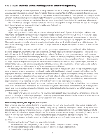 Hito Steyerl Wolność od wszystkiego: wolni strzelcy i najemnicy W 1990 roku George Michael wylansował przebój Freedom‘90. Był to czas po upadku muru berlińskiego, gdy wszyscy razem jak szaleni śpiewali Odę do radości Beethovena albo Winds of Change zespołu Scorpions, świętując ostateczne — jak wówczas sądzono — zwycięstwo wolności i demokracji. Ze wszystkich popularnych wtedy utworów najsłabsza była piosenka Looking for Freedom, wykonana przez Davida Hasselhoffa na szczycie muru berlińskiego, opowiadająca o perypetiach chłopca z bogatej rodziny, który usiłuje zbić majątek na własną rękę. We Freedom‘90 George’a Michaela chodziło jednak o coś zupełnie innego. Wolność nie była dla niego jakimś liberalnym rajem nieograniczonych możliwości. Śpiewał, że: Wygląda jak droga do nieba, A jest raczej drogą do piekła1. O jaki rodzaj wolności chodzi więc w piosence George’a Michaela? Z pewnością nie jest to klasycznie rozumiana wolność liberalna zdefiniowana jako swoboda działania, wypowiedzi lub wiary w cokolwiek. Jest to raczej wolność negatywna. Charakteryzuje ją nieobecność, brak właściwości, a w zamian za to równość, nieobecność samego autora i destrukcja wszystkich atrybutów składających się na jego wizerunek publiczny. Dlatego to właśnie piosenka Michaela wydaje się dzisiaj o wiele bardziej aktualna niż wszystkie inne ody do wolności z minionej już epoki „końca historii”. Opisuje ona bardzo współczesny stan wolności — wolność od wszystkiego. Przyzwyczailiśmy się uważać wolność za coś z gruntu pozytywnego — za możliwość robienia lub posiadania czegokolwiek; mamy więc wolność słowa, wolność do poszukiwania swojej szansy i szczęścia oraz wolność wyznania2. Dzisiaj jednak sytuacja ulega zmianie. W dobie kryzysu gospodarczego i politycznego niepożądane skutki liberalnych koncepcji wolności — takie jak wolność korporacji od wszelkich regulacji oraz wolność do nieustannego zaspokajania własnych interesów kosztem całego społeczeństwa — doprowadziły do tego, że jedynymi powszechnymi formami wolności stały się: wolność od więzi społecznych, wolność od solidarności, wolność od pewności i przewidywalności, wolność od zatrudnienia i pracy, wolność od kultury, edukacji, transportu publicznego i w ogóle wszystkiego, co publiczne. W dzisiejszym świecie tylko te rodzaje wolności są udziałem wszystkich ludzi. Nie są one jednak przypisane w równym stopniu wszystkim, ponieważ zależą od indywidualnej sytuacji materialnej i politycznej. Te negatywne wolności nakładają się na starannie skonstruowaną i wyolbrzymianą kulturową zmienność, która promuje wolność od ubezpieczeń społecznych, wolność od dochodów, wolność od odpowiedzialności i bezpieczeństwa ekonomicznego, wolność od edukacji, opieki zdrowotnej, stałej pensji i kultury, wreszcie zanik odpowiedzialności społecznej, a w wielu przypadkach wolność od obowiązującego prawa. Janis Joplin śpiewała: „Wolność, to znaczy, że nie ma nic do stracenia”. Taka wolność jest dziś udziałem wielu ludzi. Współczesna wolność to nie możliwość korzystania ze swobód obywatelskich, jak w tradycji liberalnej, lecz raczej możliwość upadku, którego może doświadczyć człowiek rzucony w otchłań niepewnej i nieprzewidywalnej przyszłości. Owe negatywne wolności sprawiły, że na całym świecie zaczęły powstawać ruchy o charakterze protestacyjnym — niemające żadnych pozytywnych celów czy sprecyzowanych żądań, będące same w sobie wyrazem stanu wolności negatywnej. Wyrazem utraty wspólnoty jako takiej. Wolność negatywna jako wspólna płaszczyzna Czas wreszcie na dobre wieści. Opisana sytuacja wcale nie jest taka zła, chociaż z pewnością niszczy tych, którzy są od niej zależni. Gdy spojrzymy na nią z innej strony, okaże się, że wygląda nawet zachęcająco. Obstawanie przy pojęciu wolności negatywnej otwiera możliwość żądania kolejnych wolności negatywnych, takich jak wolność od ucisku, wyzysku i cynizmu. To oznacza eksplorowanie nowych form relacji między ludźmi, którzy w świecie wolnego handlu i postępującej liberalizacji zmuszeni są działać na własną rękę. Obecnie ze stanem wolności negatywnej związany jest w szczególności jeden aspekt — status wolnego strzelca. Kim jest wolny strzelec? Spójrzmy na prostą definicję: 1. Osoba świadcząca swoje usługi pracodawcy, ale bez długoterminowej umowy 2. Osoba niezaangażowana i niezależna (jak w polityce lub życiu społecznym) 3. Średniowieczny najemnik. 1 Określenie wolny strzelec (ang. freelancer) pochodzi od średniowiecznego terminu oznaczającego żołnierza najemnego (free lance — wolna lanca), który nie był związany z konkretnym władcą czy rządem i można go było wynająć do wykonania pewnych zadań. Po raz pierwszy użył tego terminu Sir Walter Scott (1771–1832) w swojej powieści Ivanhoe opisując „średniowiecznego wojownika najemnego”, którego broń (lanca) nie jest zaprzysiężona, by wiernie służyć jednemu władcy. W latach 60. XIX wieku słowo funkcjonowało jako rzeczownik o znaczeniu metaforycznym, a od 1903 roku pełni też, według ustaleń językoznawców z Oxford English Dictionary, funkcję czasownika. Dopiero w czasach współczesnych rzeczownika freelance3 zaczęto używać w języku angielskim jako przymiotnika (freelance journalist), jako czasownika (a journalist who freelances) i jako przysłówka (she worked freelance). Warunki zatrudniania wolnych strzelców nie uległy tak radykalnej zmianie jak ich broń, przybierająca dzisiaj bardzo różne formy; mogą to być kruszarki do kamieni, łopaty, butelki do karmienia niemowląt, karabiny maszynowe lub sprzęt komputerowy. Współczesna broń — przynajmniej, jeśli chodzi o pisarzy — bywa najczęściej zaprojektowana przez Steve’a Jobsa. Wygląda na to,